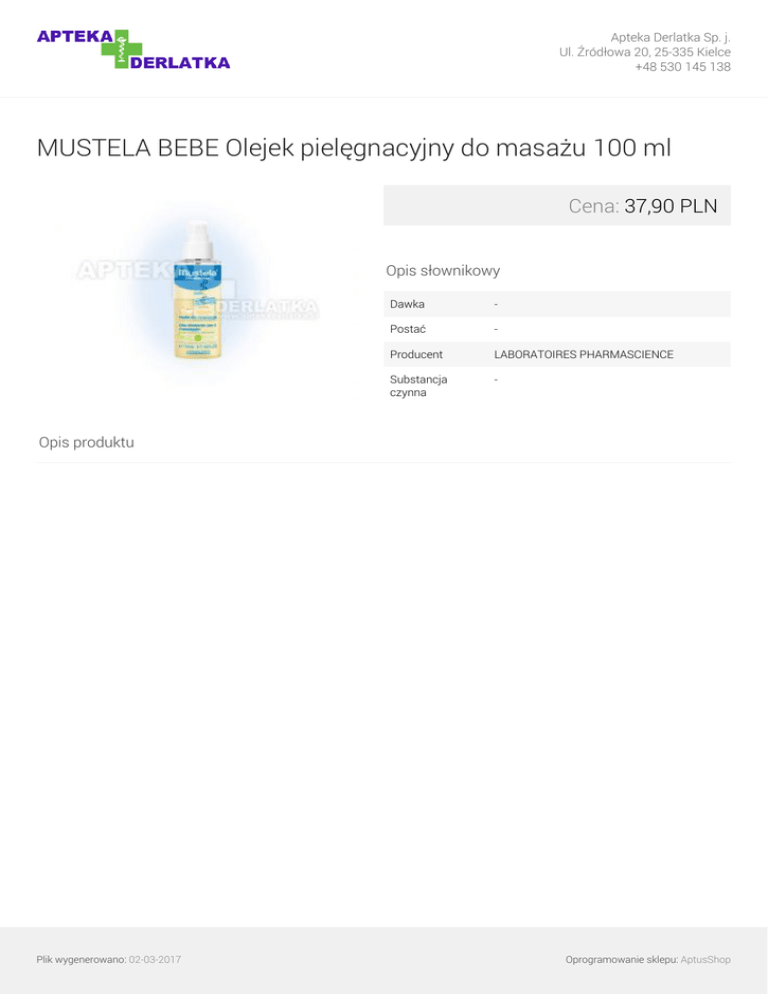 Apteka Derlatka Sp. j. Ul. Źródłowa 20, 25-335 Kielce +48 530 145 138 MUSTELA BEBE Olejek pielęgnacyjny do masażu 100 ml Cena: 37,90 PLN Opis słownikowy Dawka - Postać - Producent LABORATOIRES PHARMASCIENCE Substancja czynna - Opis produktu Plik wygenerowano: 02-03-2017 Powered by TCPDF (www.tcpdf.org) Oprogramowanie sklepu: AptusShop