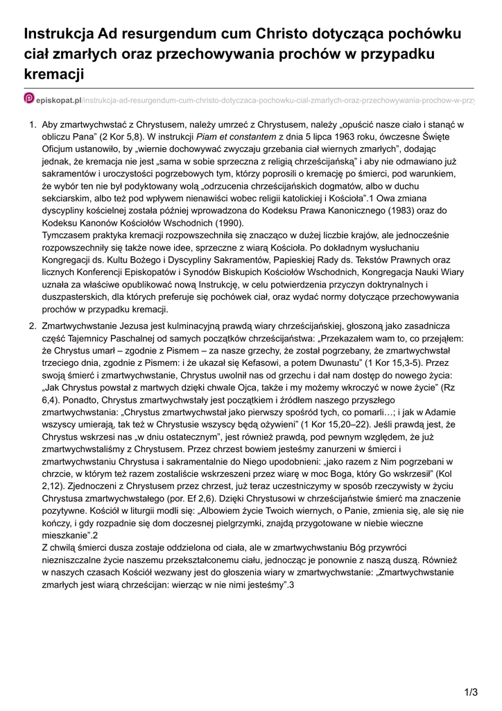 Instrukcja Ad resurgendum cum Christo dotycząca pochówku ciał zmarłych oraz przechowywania prochów w przypadku kremacji episkopat.pl/instrukcja-ad-resurgendum-cum-christo-dotyczaca-pochowku-cial-zmarlych-oraz-przechowywania-prochow-w-przypadku-k 1. Aby zmartwychwstać z Chrystusem, należy umrzeć z Chrystusem, należy „opuścić nasze ciało i stanąć w obliczu Pana” (2 Kor 5,8). W instrukcji Piam et constantem z dnia 5 lipca 1963 roku, ówczesne Święte Oficjum ustanowiło, by „wiernie dochowywać zwyczaju grzebania ciał wiernych zmarłych”, dodając jednak, że kremacja nie jest „sama w sobie sprzeczna z religią chrześcijańską” i aby nie odmawiano już sakramentów i uroczystości pogrzebowych tym, którzy poprosili o kremację po śmierci, pod warunkiem, że wybór ten nie był podyktowany wolą „odrzucenia chrześcijańskich dogmatów, albo w duchu sekciarskim, albo też pod wpływem nienawiści wobec religii katolickiej i Kościoła”.1 Owa zmiana dyscypliny kościelnej została później wprowadzona do Kodeksu Prawa Kanonicznego (1983) oraz do Kodeksu Kanonów Kościołów Wschodnich (1990). Tymczasem praktyka kremacji rozpowszechniła się znacząco w dużej liczbie krajów, ale jednocześnie rozpowszechniły się także nowe idee, sprzeczne z wiarą Kościoła. Po dokładnym wysłuchaniu Kongregacji ds. Kultu Bożego i Dyscypliny Sakramentów, Papieskiej Rady ds. Tekstów Prawnych oraz licznych Konferencji Episkopatów i Synodów Biskupich Kościołów Wschodnich, Kongregacja Nauki Wiary uznała za właściwe opublikować nową Instrukcję, w celu potwierdzenia przyczyn doktrynalnych i duszpasterskich, dla których preferuje się pochówek ciał, oraz wydać normy dotyczące przechowywania prochów w przypadku kremacji. 2. Zmartwychwstanie Jezusa jest kulminacyjną prawdą wiary chrześcijańskiej, głoszoną jako zasadnicza część Tajemnicy Paschalnej od samych początków chrześcijaństwa: „Przekazałem wam to, co przejąłem: że Chrystus umarł – zgodnie z Pismem – za nasze grzechy, że został pogrzebany, że zmartwychwstał trzeciego dnia, zgodnie z Pismem: i że ukazał się Kefasowi, a potem Dwunastu” (1 Kor 15,3-5). Przez swoją śmierć i zmartwychwstanie, Chrystus uwolnił nas od grzechu i dał nam dostęp do nowego życia: „Jak Chrystus powstał z martwych dzięki chwale Ojca, także i my możemy wkroczyć w nowe życie” (Rz 6,4). Ponadto, Chrystus zmartwychwstały jest początkiem i źródłem naszego przyszłego zmartwychwstania: „Chrystus zmartwychwstał jako pierwszy spośród tych, co pomarli…; i jak w Adamie wszyscy umierają, tak też w Chrystusie wszyscy będą ożywieni” (1 Kor 15,20–22). Jeśli prawdą jest, że Chrystus wskrzesi nas „w dniu ostatecznym”, jest również prawdą, pod pewnym względem, że już zmartwychwstaliśmy z Chrystusem. Przez chrzest bowiem jesteśmy zanurzeni w śmierci i zmartwychwstaniu Chrystusa i sakramentalnie do Niego upodobnieni: „jako razem z Nim pogrzebani w chrzcie, w którym też razem zostaliście wskrzeszeni przez wiarę w moc Boga, który Go wskrzesił” (Kol 2,12). Zjednoczeni z Chrystusem przez chrzest, już teraz uczestniczymy w sposób rzeczywisty w życiu Chrystusa zmartwychwstałego (por. Ef 2,6). Dzięki Chrystusowi w chrześcijaństwie śmierć ma znaczenie pozytywne. Kościół w liturgii modli się: „Albowiem życie Twoich wiernych, o Panie, zmienia się, ale się nie kończy, i gdy rozpadnie się dom doczesnej pielgrzymki, znajdą przygotowane w niebie wieczne mieszkanie”.2 Z chwilą śmierci dusza zostaje oddzielona od ciała, ale w zmartwychwstaniu Bóg przywróci niezniszczalne życie naszemu przekształconemu ciału, jednocząc je ponownie z naszą duszą. Również w naszych czasach Kościół wezwany jest do głoszenia wiary w zmartwychwstanie: „Zmartwychwstanie zmarłych jest wiarą chrześcijan: wierząc w nie nimi jesteśmy”.3 1/3 3. Idąc za starodawną tradycją chrześcijańską, Kościół usilnie zaleca, by ciała zmarłych chowane były na cmentarzu lub w miejscu świętym.4We wspomnieniu śmierci, pogrzebania i zmartwychwstania Pana, tajemnicy w świetle której objawia się chrześcijański sens śmierci,5 pochówek jest przede wszystkim najbardziej odpowiednią formą wyrażenia wiary i nadziei w zmartwychwstanie ciała.6 Kościół, który jak Matka towarzyszył chrześcijaninowi podczas jego ziemskiej pielgrzymki, ofiaruje Ojcu, w Chrystusie, dziecko Jego łaski i powierza ziemi jego śmiertelne szczątki w nadziei, że zmartwychwstanie w chwale.7Grzebiąc ciała wiernych zmarłych, Kościół potwierdza wiarę w zmartwychwstanie ciała 8 i zamierza uwydatnić wysoką godność ludzkiego ciała, jako nierozłącznej części osoby, której historię to ciało współdzieli.9 Nie może zatem pozwolić na postawy i obrzędy, które uwzględniają błędne pojęcie śmierci, postrzeganej zarówno jako ostateczne unicestwienie osoby, jak i chwilę jej fuzji z matką naturą lub ze wszechświatem, jako etap w procesie reinkarnacji, lub też jako ostateczne wyzwolenie z „więzienia” ciała. Ponadto pochówek na cmentarzach lub w innych miejscach świętych właściwie odpowiada współczuciu i szacunkowi, jakie należą się ciałom zmarłych wiernych, które przez chrzest stały się świątynią Ducha Świętego i którymi, „jak narzędziami i naczyniami, w sposób święty posłużył się Duch Święty, aby dokonać wielu dobrych dzieł”.10 Sprawiedliwy Tobiasz wychwalany jest za zasługi zdobyte wobec Boga przez to, że grzebał zmarłych,11 a Kościół uważa pochówek zmarłych za dzieło miłosierdzia wobec ciała. 12Na koniec wreszcie pochówek ciał wiernych zmarłych na cmentarzach lub w innych miejscach świętych sprzyja pamięci i modlitwie za zmarłych ze strony rodziny i całej wspólnoty chrześcijańskiej, jak też czczenia męczenników i świętych. Przez pochówek ciał na cmentarzach, w kościołach c