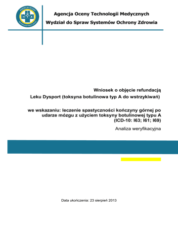 Agencja Oceny Technologii Medycznych Wydział do Spraw Systemów Ochrony Zdrowia Wniosek o objęcie refundacją Leku Dysport (toksyna botulinowa typ A do wstrzykiwań) we wskazaniu: leczenie spastyczności kończyny górnej po udarze mózgu z użyciem toksyny botulinowej typu A (ICD-10: I63; I61; I69) Analiza weryfikacyjna Data ukończenia: 23 sierpień 2013 Wykaz skrótów Agencja – Agencja Oceny Technologii Medycznych AROM – zakres ruchu biernego ASH – (ang. Ashworth Scale) - skala Ashwortha AWA – analiza weryfikacyjna Agencji BoTULS – wieloośrodkowe badanie z randomizacją w celu oceny skuteczności klinicznej i efektywności kosztowej leczenia spastyczności kończyny górnej z powodu udaru mózgu toksyną botulinową typu A BSC – (ang. Best Supportive Care) - najlepsza terapia podtrzymująca BTX-A – (ang. botulinum toxine type A) toksyna botulinowa typu A BTX-B – (ang. botulinum toxine type B) toksyna botulinowa typu B ChPL – Charakterystyka Produktu Leczniczego CI – (ang. Confidence Interval) przedział ufności CUA – (ang. cost-utility analysis) - analiza kosztów-użyteczności EQ-5D – kwestionariusz EuroQol, narzędzie do pomiaru zależnej od zdrowia jakości życia i opisu stanu zdrowia GAS – (ang. Goal Attainment Scaling) - skala osiągania celu GIF – Główny Inspektorat Farmaceutyczny GPP – (ang. Good Practice Point) - dobra praktyka (opis w stopniowaniu poziomu rekomendacji) IU – (ang. International Unit) - jednostki międzynarodowe Komparator – interwencja alternatywna, opcjonalna wobec interwencji ocenianej Lek – produkt leczniczy w rozumieniu ustawy z dnia 6 września 2011 r. - Prawo farmaceutyczne (Dz. U. z 2001 r. Nr 126, poz. 1381, z późn. zm.) MAS – (ang. Modified Ashworth Scale ) – zmodyfikowana skala Ashwortha MD – (ang. Mean Difference) – średnia różnic uzyskanych w badaniach włączonych do metaanalizy (wynik metaanalizy wyników stanowiących zmienne ciągłe) NNT – (ang. Number Needed to Treat) oczekiwana liczba osób, u których należy zastosować ocenianą interwencję zamiast komparatora, aby uzyskać dodatkowe wystąpienie albo uniknąć wystąpienia badanego zdarzenia w określonym horyzoncie czasowym nRCT – (ang. non-randomized controlled trial) - nierandomizowane badanie kliniczne OR – (ang. odds ratio) - iloraz szans PLC – placebo PROM – zakres ruchu aktywnego RCT – (ang. randomized controlled trial) - randomizowane badanie kliniczne RK – Rada Konsultacyjna Rozporządzenie ws. analizy weryfikacyjnej – rozporządzenie określające sposób i procedury przygotowania analizy weryfikacyjnej Agencji, o którym mowa w art. 35 ust. 10 pkt 1 ustawy o refundacji Rozporządzenie ws. minimalnych wymagań – Rozporządzenie Ministra Zdrowia z dnia 2 kwietnia 2012 r. w sprawie minimalnych wymagań, jakie muszą spełniać analizy uwzględnione we wnioskach o objęcie refundacją i ustalenie urzędowej ceny zbytu oraz podwyższenie urzędowej ceny zbytu leku, środka spożywczego specjalnego przeznaczenia żywieniowego, wyrobu medycznego, które nie mają odpowiednika refundowanego w danym wskazaniu (Dz.U. z 2012 r. Nr 0, poz. 388) RP – Rada Przejrzystości RR – (ang. Relative Risk, Risk Ratio) ryzyko względne; określa, o ile razy zastosowanie ocenianej interwencji zwiększa prawdopodobieństwo wystąpienia badanego zdarzenia w porównaniu z prawdopodobieństwem wystąpienia tego zdarzenia w przypadku zastosowania komparatora SF-36 – kwestionariusz oceny jakości życia skala FMS – (ang. Functional Movement System) – narzędzie do oceny funkcjonalności pacjenta skala Oxford – sposób niezależnego oceniania jakości klinicznych badań eksperymentalnych skala PDS – (ang. Posttraumatic Diagnostic Scale) – skala samooceny mierząca nasilenie objawów stresu pourazowego w wyniku zidentyfikowanego wydarzenia traumatycznego skala SIS – (ang. Stroke Impact Scale) - ocena jakości życia po udarze skala VAS – (ang. Visual Analogue Scale) – wizualna skala analogowa Technologia - technologia medyczna w rozumieniu art. 5 pkt 42a ustawy o świadczeniach lub środek spożywczy specjalnego przeznaczenia żywieniowego lub wyrób medyczny w rozumieniu art. 2 pkt 21 i 28 ustawy o refundacji Dysport (toksyna botulinowa typ A do wstrzykiwań) AOTM-DS-4351-6/2013 Leczenie spastyczności kończyny górnej po udarze mózgu z użyciem toksyny botulinowej typu A (ICD-10 I63; I61; I69) TENS – (ang. Transcutaneous Electrical Nerve Stimulation) - przezskórna stymulacja nerwów Ustawa o refundacji – Ustawa z dnia 12 maja 2011 r. o refundacji leków, środków spożywczych specjalnego przeznaczenia żywieniowego oraz wyrobów medycznych (Dz. U. z 2011 r. Nr 122, poz. 696, z późn. zm.) Ustawa o świadczeniach – Ustawa z dnia 27 sierpnia 2004 r. o świadczeniach opieki zdrowotnej finansowanych ze środków publicznych (Dz. U. z 2008 r., Nr 164, poz. 1027, z późn. zm.) WMD – (ang. Weighted Mean Difference) - średnia ważona różnic, parametr oceniający wspólny efekt danej interwencji na podstawie poszczególnych badań, w których efekt mierzono przy użyciu tej samej skali Wytyczne – „Wytyczne oceny technologii medycznych” wprowadzone Zarządzeniem Prezesa Agencji nr 1/2010 z dnia 4stycznia 2010 r., stanowiące podsumowanie uznawanych przez społeczność międzynarodową wymagań dotyczących przeprowadzania oceny świadczeń opieki zdrowotnej Analiza weryfikacyjna Agencji Oceny Technologii Medycznych 3/121 Dysport (toksyna botulinowa typ A do wstrzykiwań) AOTM-DS-4351-6/2013 Leczenie spastyczności kończyny górnej po udarze mózgu z użyciem toksyny botulinowej typu A (ICD-10 I63; I61; I69) KARTA NIEJAWNOŚCI Dane zakreślone kolorem żółtym stanowią informacje publiczne podlegające wyłączeniu ze względu na tajemnicę przedsiębiorcy: Ipsen Poland Sp. z o.o., Al. Jana Pawła II 29, 00-867 Warszawa, Polska Zakres wyłączenia jawności: dane objęte oświadczeniem Ipsen Po