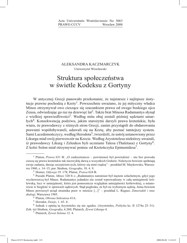 Acta Universitatis Wratislaviensis No 3063 PRAWO CCCV Wrocław 2008 ALEKSANDRA KACZMARCZYK Uniwersytet Wrocławski Struktura społeczeństwa w świetle Kodeksu z Gortyny W antycznej Grecji panowało przekonanie, że najstarsze i najlepsze instytucje prawne pochodzą z Krety1. Powszechnie uważano, że jej mityczny władca Minos otrzymywał owe cieszące się szacunkiem prawa od swego boskiego ojca Zeusa, odwiedzając go raz na dziewięć lat2. Także brat Minosa Radamantys słynął z wielkiej sprawiedliwości3. Według mitu obaj zostali później sędziami umarłych4. Konsekwencją podziwu, jakim starożytni darzyli prawa kreteńskie, była wiara, że prawodawcy z różnych stron Grecji, zanim przystąpili do obdarowania prawami współobywateli, udawali się na Kretę, aby poznać tamtejszy system. Sami Lacedemończycy, według Herodota5, twierdzili, że ustrój ustanowiony przez Likurga miał swój pierwowzór na Krecie. Według Arystotelesa niektórzy uważali, iż prawodawcy Likurg i Zeleukos byli uczniami Talesa (Thaletasa) z Gortyny6. Z kolei Solon miał otrzymywać pomoc od Kreteńczyka Epimenidesa7. 1 Platon, Prawa 631 B: „O cudzoziemcze – powinieneś był powiedzieć – nie bez powodu cieszą się prawa kreteńskie tak niezwykłą sławą u wszystkich Greków. Należycie bowiem spełniają swoje zadania, darząc szczęściem tych, którzy się nimi rządzą” – przekład M. Maykowska, Warszawa 1960, s. 14–15; por. Strabon, Geografia, 10. 4. 9. 2 Homer, Odyseja 19. 178; Platon, Prawa 624 B. 3 Pseudo Platon, Minos 320 b–c „Radamantys natomiast był mężem szlachetnym, gdyż jego wychowawcą był Minos. Radamantys jednakże nie został wprowadzony w całą umiejętność królewską, lecz w umiejętność, która jest pomocnicza względem umiejętności królewskiej, a mianowicie w biegłość w sprawach sądowych. Stąd pogłoska, że był on wybornym sędzią. Jemu bowiem Minos powierzył urząd strażnika praw w mieście [...]” – przekład L. Regner, Zimorodek i inne dialogi, Warszawa 1985. 4 Platon, Obrona Sokratesa 41A. 5 Herodot, Dzieje, 1. 65. 4. 6 Jednak z opinią tą Arystoteles się nie zgadza. (Arystoteles, Polityka ks. II 1274a 25–31). Zob. też Strabon, Geografia, 6.260; Plutarch, Żywot Likurga 4. 7 Plutarch, Żywot Solona 12. 4. Prawo CCCV Konieczny.indd 115 2008-08-20 11:14:13 116 ALEKSANDRA KACZMARCZYK Kreta jest położona u wejścia do basenu Morza Egejskiego, na szlakach handlowych z Aten na Sycylię i z Peloponezu do Egiptu, a także na Rodos, Cypr i do Syrii. Jak pisze Arystoteles: „wyspa wydaje się już przez naturę stworzona do władania nad Grecją, a jest doskonale położona, panuje bowiem nad wszystkimi morzami, nad którymi mieszkają niemal wszyscy Grecy. Z jednej strony nieznacznie jest oddalona od Peloponezu, z drugiej od Azji, od obszaru Triopion8 i Rodos”9. Ze względu na położenie na skrzyżowaniu szlaków handlowych i dogodne ukształtowanie linii brzegowej wyspa od najdawniejszych czasów przyciągała żeglarzy. Liczne kontakty natomiast sprzyjały osadnictwu. Jak napisał Homer w Odysei: Kreta, wyspa śród morskiej rzucona otchłani, Żyzna, pełna uroków – a siedzą tam na niéj Roje luda, a liczy dziewięćdziesiąt grodów. Moc tam różnego szczepu i mowy narodów. Są Achaje, Kydony, Dory bujnogrzywe, Pelazgi, toż Kreteńcy, tubylcy właściwe10. Analizując eposy Homera, należy pamiętać, że przeplatają się w nich dwa światy: świat współczesny autorowi oraz odległa epoka achajskich bohaterów. Wspomniani w powyższym fragmencie Achajowie są przybyszami z Grecji lądowej. Kydonowie zaś to lud związany z Kydonem, wnukiem Minosa i mitycznym założycielem miasta Kydonii, położonego w zachodniej części wyspy11. Zarówno Pelazgowie, jak i Eteokreci są plemionami niegreckiego pochodzenia. W Praisos i Dreros, w miastach położonych we wschodniej Krecie, znaleziono fragmenty inskrypcji z okresu postminojskiego, zapisane w nieznanym języku, co do którego wysnuto przypuszczenie, że jest to język Eteokretów. Zachowali oni odrębność językową prawie do czasów panowania rzymskiego na wyspie12. Najstarsze ślady doryckiego osadnictwa na Krecie są datowane na XI w. p.n.e. Inwazja Dorów na Kretę dokonała się ok. 1100 r. p.n.e. Osiedlili się oni najprawdopodobniej na wybrzeżach, a ich centrum stało się Knossos. Ludność autochtoniczna, ustępując miejsca silniejszym najeźdźcom, wycofała się w górzyste rejony wyspy13. We wczesnym okresie archaicznym Kreta rozwijała się bardzo intensywnie, o czym świadczy wysoki poziom sztuki w tym okresie14. Na przełomie VII i VI w. p.n.e. nastąpiło załamanie rozwoju wyspy. W epoce klasycznej Kreta nie miała 8 Przylądek w Azji Mniejszej. Arystoteles, Polityka, ks. II 1271b 2, przekład L. Piotrowicz, Warszawa 1964, s. 82. 10 Homer, Odyseja XIX 177–182, przekład L. Siemieński, Warszawa 1990. 11 L. Press, Życie codzienne na Krecie w państwie króla Minosa, Warszawa 1972, s. 24. 12 Ibidem. 13 L. Press, Osadnictwo egejskie, [w:] M. Majkowski, Kultura materialna starożytnej Grecji, zarys, t. II, s. 77. 14 Zob. J. Boardman, Crete, [w:] J. Boardman, N.G.L. Hammond, The Cambridge Ancient History, Vol. III, Part 3, The Expansion of the Greek World, Eighth to Sixth Centuries BC, Cambridge University Press, 1982, s. 225; P. Lévêque, Świat grecki, Warszawa 1973, s. 161 i n., P. Demargne, La Crète dedalique: études sur les origines d’une renaissance, Paris 1947. 9 Prawo CCCV Konieczny.indd 116 2008-08-20 11:14:13 Struktura społeczeństwa w świetle Kodeksu z Gortyny 117 politycznego ani kulturalnego znaczenia. Świadectwa archeologiczne wskazują na mniej intensywne kontakty ze światem zewnętrznym w tym czasie15. Miasta Krety nie udzieliły prawie żadnej pomocy w wojnie przeciwko Persji16. Rola Krety podczas wojny peloponeskiej nie jest także zupełnie jasna17. Stosunkowo niewiele wiemy o historii Krety w okresie archaicznym i k