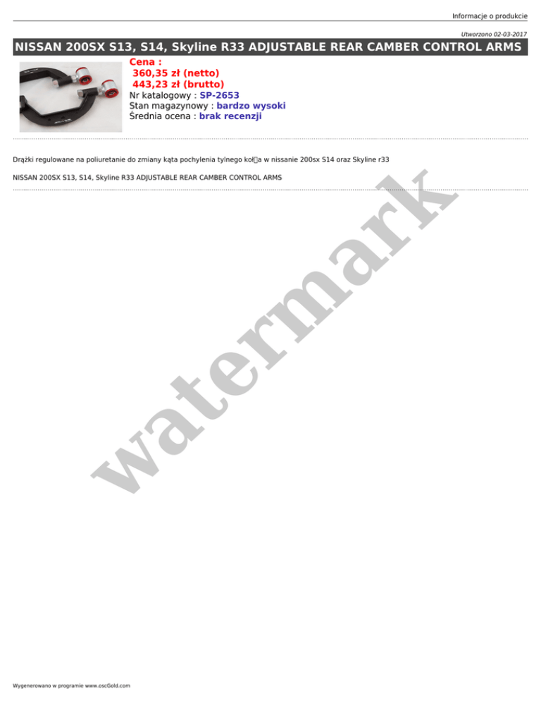Informacje o produkcie Utworzono 02-03-2017 NISSAN 200SX S13, S14, Skyline R33 ADJUSTABLE REAR CAMBER CONTROL ARMS Cena : 360,35 zł (netto) 443,23 zł (brutto) Nr katalogowy : SP-2653 Stan magazynowy : bardzo wysoki Średnia ocena : brak recenzji Drążki regulowane na poliuretanie do zmiany kąta pochylenia tylnego koła w nissanie 200sx S14 oraz Skyline r33 w at er m ar k NISSAN 200SX S13, S14, Skyline R33 ADJUSTABLE REAR CAMBER CONTROL ARMS Wygenerowano w programie www.oscGold.com