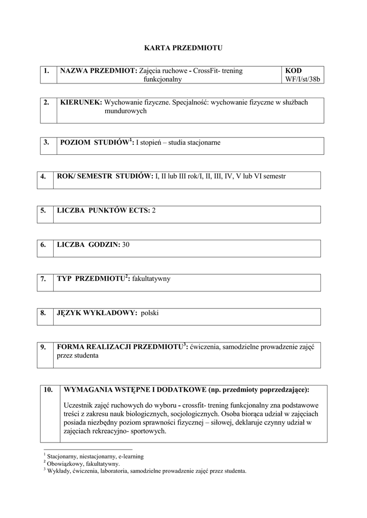 KARTA PRZEDMIOTU 1. NAZWA PRZEDMIOT: Zajęcia ruchowe - CrossFit- trening funkcjonalny 2. KIERUNEK: Wychowanie fizyczne. Specjalność: wychowanie fizyczne w służbach mundurowych 3. POZIOM STUDIÓW1: I stopień – studia stacjonarne KOD WF/I/st/38b 4. ROK/ SEMESTR STUDIÓW: I, II lub III rok/I, II, III, IV, V lub VI semestr 5. LICZBA PUNKTÓW ECTS: 2 6. LICZBA GODZIN: 30 7. TYP PRZEDMIOTU2: fakultatywny 8. JĘZYK WYKŁADOWY: polski 9. FORMA REALIZACJI PRZEDMIOTU3: ćwiczenia, samodzielne prowadzenie zajęć przez studenta 10. WYMAGANIA WSTĘPNE I DODATKOWE (np. przedmioty poprzedzające): Uczestnik zajęć ruchowych do wyboru - crossfit- trening funkcjonalny zna podstawowe treści z zakresu nauk biologicznych, socjologicznych. Osoba biorąca udział w zajęciach posiada niezbędny poziom sprawności fizycznej – siłowej, deklaruje czynny udział w zajęciach rekreacyjno- sportowych. 1 Stacjonarny, niestacjonarny, e-learning Obowiązkowy, fakultatywny. 3 Wykłady, ćwiczenia, laboratoria, samodzielne prowadzenie zajęć przez studenta. 2 11. CEL PRZEDMIOTU: Zapoznanie studenta z nowoczesną formą pracy nad siłą ogólną organizmu, z wykorzystaniem najnowszej generacji sprzętu, oraz dawno już znanego sprzętu w nieznany dotąd sposób użytkowania. Wskazanie na różne formy możliwe do zastosowania w różnych miejscach dla osób w każdym wieku. 12. Odniesienie do kierunkowych efektów kształcenia (symbol) PRZEDMIOTOWE EFEKTY KSZTAŁCENIA4 P_W01. Student zna podstawowe funkcje K_W02 M1_W01 M1_W02 SN_Wa K_W13 M1_W06 K_W25 M1_W07 M1_W10 SN_Wk K_W26 M1_W07 M1_W10 SN_Wb organizmu, reakcje na stosowane obciążenia wysiłkiem fizycznym. Rozumie Odniesienie do obszarowych efektów kształcenia i standardów kształcenia nauczycieli (symbol) warunki utrzymania kondycji fizycznej i adaptacji do stosowanych obciążeń. P_W02. Student zna i potrafi stosować dietę zgodnie z zasadami zdrowego żywienia, dba o higieniczny styl życia. P_W03. Student zna poprawną technikę wykonania ćwiczeń z obciążeniem zewnętrznym oraz poprawne zasady asekuracji. Stosuje poprawną kolejność ćwiczeń w nauczaniu techniki. Zna przepisy organizacyjne i współzawodnictwa w crossficie, podnoszeniu ciężarów prowadzonych w różnych formach zajęć rekreacyjnych i sportowych. P_W04. Student zna zasady stosowane w nauczaniu techniki bojów olimpijskich w podnoszeniu ciężarów, metodyki treningu siły Przeprowadza testy sprawdzające poziom sprawności stosowane w kwalifikacji do sportu. Rozumie 4 wieloetapowość szkolenia dzieci, Efekty kształcenia w zakresie wiedzy (P_W), umiejętności (P_U) i kompetencji społecznych (P_K). młodzieży i osób starszych. P_U01. Student umie konstruować trening K_U04 M1_U02 M1_U04 M1_U05 M1_U06 M1_U08 M1_U09 M1_U12 M1_U13 K_U21 M1_U01 M1_U03 M1_U07 M1_U11 SN_Uc zdrowotny dla osób w różnym wieku. Potrafi dozować obciążenie wypoczynkowe siłowego. w Potrafi stosując trakcie stosować przerwy zajęć treningu wybrane testy sprawności siłowej oraz wybierać uzdolnionych sportowo. P_U02. Student posiada umiejętność poprawnego pokazu i objaśnienia techniki z zastosowaniem przyborów i przyrządów do treningu siły. Umie objaśnić prawidłowy sposób asekuracji podczas ćwiczeń z obciążeniem, stosuje wybrane metody w nauczaniu i treningu różnicując wiek i poziom sprawności. Zna regulaminy organizacyjne zawodów potrafi je organizować i przeprowadzić. P_K01. Student uczestniczy w życiu sportowym środowiska propagując wartości kultury fizycznej. K_K01 K_K02 M1_K01 M1_K03 M1_K04 M1_K06 M1_K09 M1_K05 SN_Kf M1_K08 SN_Ke 13. METODY OCENY EFEKTÓW KSZTAŁCENIA Symbol przedmiotowego efektu kształcenia Metody (sposoby) oceny5 Typ oceny6 Forma dokumentacji P_W01, P_W02 ocenianie ciągłe podsumowująca praca pisemna P_W03, P_W04 zaliczenie pisemne podsumowująca praca pisemna P_U01 ocenianie ciągłe podsumowująca praca pisemna P_U02 sprawdziany poszczególnych podsumowująca arkusz zaliczeń formująca konspekt zajęć prób: Przysiad ze sztangą na barkach, wyciskanie leżąc, martwy ciąg, podciąganie na drążku ocenianie ciągłe P_K01 14. TREŚCI PROGRAMOWE Forma zajęć7 Treść zajęć (liczba godz.) Zapoznanie z zasadami bezpieczeństwa panującymi na siłowni, regulamin siłowni, sposoby asekuracji i samo asekuracji podczas ćwiczeń Technika ćwiczenia (2) Symbol przedmiotowych efektów kształcenia P_U02 P_W01 P_W03 wykonania ćwiczeń kształtujących globalne partie mięśniowe: Przysiad ze sztangą na barkach, wyciskanie leżąc, martwy ciąg, podciąganie na drążku. Początkowy sprawdzian siłowy studentów z Przysiadu ze sztangą na barkach, wyciskania leżąc, martwego ćwiczenia (2) P_U02 P_W04 ćwiczenia (2) P_U01 P_W03 ciągu, podciągania na drążku. Podstawy treningu funkcjonalnego. i zastosowanie metody obwodowej treningu. 5 Zasady Ocenianie ciągłe (bieżące przygotowanie do zajęć), śródsemestralne zaliczenie pisemne, śródsemestralne zaliczenie ustne, końcowe zaliczenia pisemne, końcowe zaliczenia ustne, egzamin pisemny, egzamin ustny, praca semestralna, ocena umiejętności ruchowych, praca dyplomowa, projekt, kontrola obecności 6 Formująca, podsumowująca. 7 Wykłady, ćwiczenia, laboratoria, samodzielne prowadzenie zajęć przez studenta. Zasady i zastosowanie metody stacyjnej. Nauczanie techniki rwania sztangi. ćwiczenia (2) P_U02 P_W04 ćwiczenia (2) P_U02 P_W03 ćwiczenia (2) P_U01 P_W03 ćwiczenia (2) P_U02 P_W01 ćwiczenia (2) P_U02 P_W03 ćwiczenia (2) P_U02 P_W03 ćwiczenia (2) P_K01 P_U01 P_W03 Trening funkcjonalny w terenie. ćwiczenia (2) P_U02 P_W03 Prowadzenie zajęć w formie fitness, aerobic, pilastes. ćwiczenia (2) P_K01 P_U01 P_W01 ćwiczenia (2) P_U01 P_W02 ćwiczenia (2) P_K01 P_U02 P_W04 ćwiczenia (2) P_K01 P_U02 P_W04 Zasady i zastosowanie metody izometrycznej Zasady i zastosowanie metody ciężkoatletycznej. Doskonalenie techniki rwania sztangi. Zasady i zastosowanie metody kul
