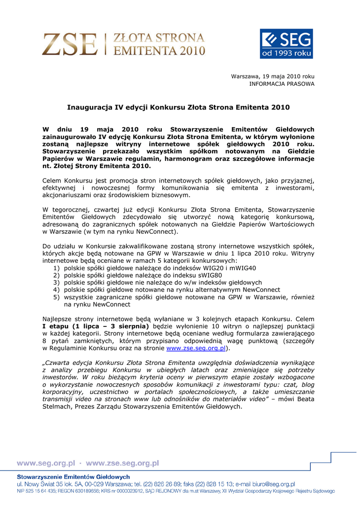 Warszawa, 19 maja 2010 roku INFORMACJA PRASOWA Inauguracja IV edycji Konkursu Złota Strona Emitenta 2010 W dniu 19 maja 2010 roku Stowarzyszenie Emitentów Giełdowych zainaugurowało IV edycję Konkursu Złota Strona Emitenta, w którym wyłonione zostaną najlepsze witryny internetowe spółek giełdowych 2010 roku. Stowarzyszenie przekazało wszystkim spółkom notowanym na Giełdzie Papierów w Warszawie regulamin, harmonogram oraz szczegółowe informacje nt. Złotej Strony Emitenta 2010. Celem Konkursu jest promocja stron internetowych spółek giełdowych, jako przyjaznej, efektywnej i nowoczesnej formy komunikowania się emitenta z inwestorami, akcjonariuszami oraz środowiskiem biznesowym. W tegorocznej, czwartej już edycji Konkursu Złota Strona Emitenta, Stowarzyszenie Emitentów Giełdowych zdecydowało się utworzyć nową kategorię konkursową, adresowaną do zagranicznych spółek notowanych na Giełdzie Papierów Wartościowych w Warszawie (w tym na rynku NewConnect). Do udziału w Konkursie zakwalifikowane zostaną strony internetowe wszystkich spółek, których akcje będą notowane na GPW w Warszawie w dniu 1 lipca 2010 roku. Witryny internetowe będą oceniane w ramach 5 kategorii konkursowych: 1) polskie spółki giełdowe należące do indeksów WIG20 i mWIG40 2) polskie spółki giełdowe należące do indeksu sWIG80 3) polskie spółki giełdowe nie należące do w/w indeksów giełdowych 4) polskie spółki giełdowe notowane na rynku alternatywnym NewConnect 5) wszystkie zagraniczne spółki giełdowe notowane na GPW w Warszawie, również na rynku NewConnect Najlepsze strony internetowe będą wyłaniane w 3 kolejnych etapach Konkursu. Celem I etapu (1 lipca – 3 sierpnia) będzie wyłonienie 10 witryn o najlepszej punktacji w każdej kategorii. Strony internetowe będą oceniane według formularza zawierającego 8 pytań zamkniętych, którym przypisano odpowiednią wagę punktową (szczegóły w Regulaminie Konkursu oraz na stronie www.zse.seg.org.pl). „Czwarta edycja Konkursu Złota Strona Emitenta uwzględnia doświadczenia wynikające z analizy przebiegu Konkursu w ubiegłych latach oraz zmieniające się potrzeby inwestorów. W roku bieżącym kryteria oceny w pierwszym etapie zostały wzbogacone o wykorzystanie nowoczesnych sposobów komunikacji z inwestorami typu: czat, blog korporacyjny, uczestnictwo w portalach społecznościowych, a także umieszczanie transmisji video na stronach www lub odnośników do materiałów video” – mówi Beata Stelmach, Prezes Zarządu Stowarzyszenia Emitentów Giełdowych. [Wpisz tekst] W II etapie (5 sierpnia – 5 września) Jury Konkursu złożone ze specjalistów w 8 dziedzinach - po 4 osoby w poszczególnym kryterium - wyłoni 3 nominatów w każdej kategorii. W tej części Konkursu pojawi się nowe kryterium „informacje dla inwestorów odnośnie nowych zasad WZA”, związane z ze zmianami w kodeksie spółek handlowych w zakresie organizacji walnych zgromadzeń. III etap Konkursu (7 września – 30 września) będzie polegał na wyłonieniu 5 laureatów spośród 15 nominowanych stron. Wyboru dokona Kapituła Konkursu, w której zasiadają przedstawiciele instytucji rynku kapitałowego oraz najbardziej uznani fachowcy w dziedzinach takich jak: grafika, komunikacja marketingowa, dziennikarstwo, ekonomia czy relacje inwestorskie. Ogłoszenie wyników Konkursu Złota Strona Emitenta 2010 oraz wręczenie nagród nastąpi podczas V Kongresu Zarządów Spółek Giełdowych SEG, w dniu 1 października 2010 roku. „Poprzez organizację Konkursu Stowarzyszenie Emitentów Giełdowych jako organizacja ekspercka wspiera działania służące lepszej komunikacji z inwestorami i innymi uczestnikami obrotu giełdowego. Naszą misją jest dążenie do szerzenia wiedzy umożliwiającej rozwój rynku kapitałowego oraz nowoczesnej gospodarki rynkowej w Polsce” – podsumowuje Beata Stelmach. Szczegółowe omówienie zasad Konkursu oraz prezentacja raportu „Wpływ Konkursu na komunikację spółki notowanej z otoczeniem”, opracowanego na podstawie Konkursu Złota Strona Emitenta zrealizowanego w 2009 roku, odbędą się podczas II Kongresu Relacji Inwestorskich SEG w dniach 26-27 maja 2010 roku. Głównym przesłaniem tegorocznego Kongresu będzie poruszenie zagadnień dotyczących komunikacji z analitykami i inwestorami. Informacje nt. Kongresu Relacji Inwestorskich są dostępne na stronie www.seg.org.pl Patronat nad Konkursem Złota Strona Emitenta 2010 objęła Giełda Papierów Wartościowych w Warszawie SA oraz Grupa Etendard. Patronat medialny sprawują: Rzeczpospolita, Gazeta Giełdy Parkiet, Polska Agencja Prasowa, Miesięcznik Kapitałowy, Computerworld, Radio PIN, Onet.pl, TCN CNBC Biznes. Regulamin Konkursu, harmonogram oraz szczegółowe informacje nt. Złotej Strony Emitenta 2010 są dostępne na stronie internetowej www.zse.seg.org.pl *** Stowarzyszenie Emitentów Giełdowych (SEG) – jako reprezentant spółek notowanych na Giełdzie Papierów Wartościowych w Warszawie, służy środowisku emitentów wiedzą i doradztwem w zakresie regulacji rynku giełdowego oraz praw i powinności uczestniczących w nim spółek. Będąc organizacją ekspercką, dąży do szerzenia i wymiany wiedzy umożliwiającej rozwój rynku kapitałowego i nowoczesnej gospodarki rynkowej w Polsce. Integruje środowisko emitentów i promuje współdziałanie na rzecz budowy społeczeństwa obywatelskiego. Dodatkowych informacji udziela: Agnieszka Oleszczuk Stowarzyszenie Emitentów Giełdowych e-mail: [email protected] tel. 0 22 826 26 89, 0 509 357 280 www.seg.org.pl | www.zse.seg.org.pl [Wpisz tekst]