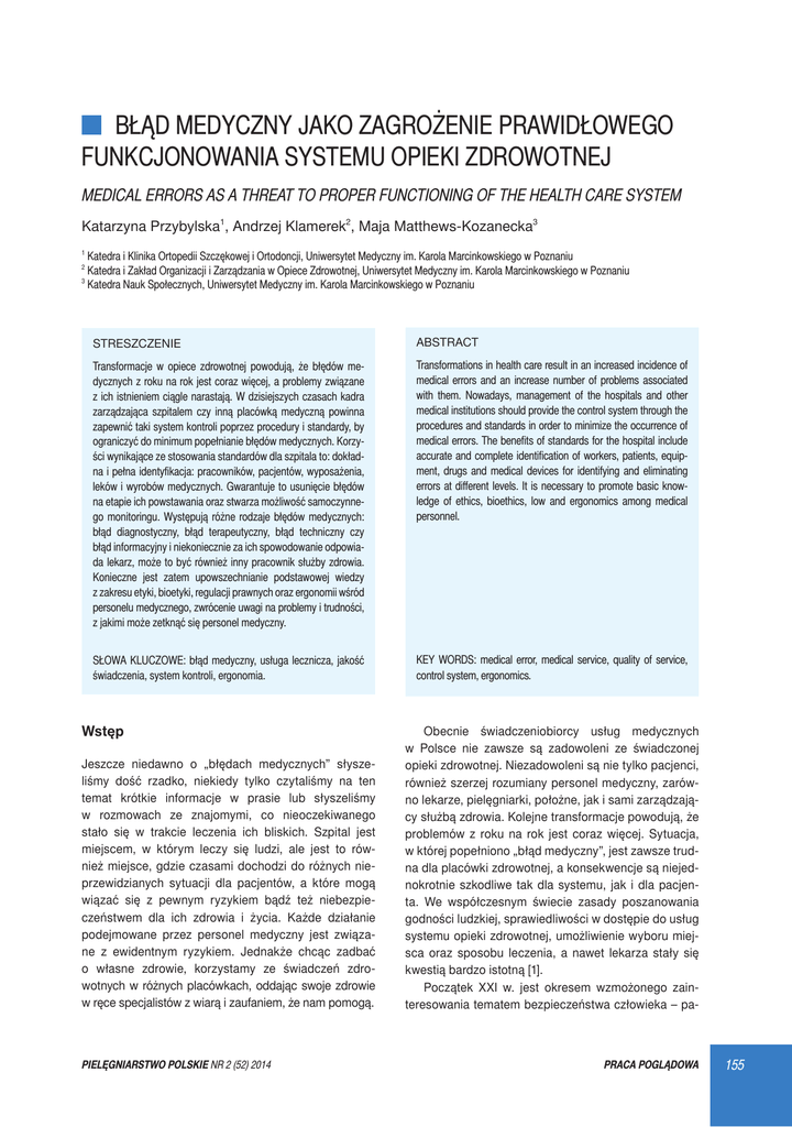 BŁĄD MEDYCZNY JAKO ZAGROŻENIE PRAWIDŁOWEGO FUNKCJONOWANIA SYSTEMU OPIEKI ZDROWOTNEJ MEDICAL ERRORS AS A THREAT TO PROPER FUNCTIONING OF THE HEALTH CARE SYSTEM Katarzyna Przybylska1, Andrzej Klamerek2, Maja Matthews-Kozanecka3 1 Katedra i Klinika Ortopedii Szczękowej i Ortodoncji, Uniwersytet Medyczny im. Karola Marcinkowskiego w Poznaniu Katedra i Zakład Organizacji i Zarządzania w Opiece Zdrowotnej, Uniwersytet Medyczny im. Karola Marcinkowskiego w Poznaniu 3 Katedra Nauk Społecznych, Uniwersytet Medyczny im. Karola Marcinkowskiego w Poznaniu 2 STRESZCZENIE ABSTRACT Transformacje w opiece zdrowotnej powodują, że błędów medycznych z roku na rok jest coraz więcej, a problemy związane z ich istnieniem ciągle narastają. W dzisiejszych czasach kadra zarządzająca szpitalem czy inną placówką medyczną powinna zapewnić taki system kontroli poprzez procedury i standardy, by ograniczyć do minimum popełnianie błędów medycznych. Korzyści wynikające ze stosowania standardów dla szpitala to: dokładna i pełna identyfikacja: pracowników, pacjentów, wyposażenia, leków i wyrobów medycznych. Gwarantuje to usunięcie błędów na etapie ich powstawania oraz stwarza możliwość samoczynnego monitoringu. Występują różne rodzaje błędów medycznych: błąd diagnostyczny, błąd terapeutyczny, błąd techniczny czy błąd informacyjny i niekoniecznie za ich spowodowanie odpowiada lekarz, może to być również inny pracownik służby zdrowia. Konieczne jest zatem upowszechnianie podstawowej wiedzy z zakresu etyki, bioetyki, regulacji prawnych oraz ergonomii wśród personelu medycznego, zwrócenie uwagi na problemy i trudności, z jakimi może zetknąć się personel medyczny. Transformations in health care result in an increased incidence of medical errors and an increase number of problems associated with them. Nowadays, management of the hospitals and other medical institutions should provide the control system through the procedures and standards in order to minimize the occurrence of medical errors. The benefits of standards for the hospital include accurate and complete identification of workers, patients, equipment, drugs and medical devices for identifying and eliminating errors at different levels. It is necessary to promote basic knowledge of ethics, bioethics, low and ergonomics among medical personnel. SŁOWA KLUCZOWE: błąd medyczny, usługa lecznicza, jakość świadczenia, system kontroli, ergonomia. KEY WORDS: medical error, medical service, quality of service, control system, ergonomics. Wstęp Jeszcze niedawno o „błędach medycznych” słyszeliśmy dość rzadko, niekiedy tylko czytaliśmy na ten temat krótkie informacje w prasie lub słyszeliśmy w rozmowach ze znajomymi, co nieoczekiwanego stało się w trakcie leczenia ich bliskich. Szpital jest miejscem, w którym leczy się ludzi, ale jest to również miejsce, gdzie czasami dochodzi do różnych nieprzewidzianych sytuacji dla pacjentów, a które mogą wiązać się z pewnym ryzykiem bądź też niebezpieczeństwem dla ich zdrowia i życia. Każde działanie podejmowane przez personel medyczny jest związane z ewidentnym ryzykiem. Jednakże chcąc zadbać o własne zdrowie, korzystamy ze świadczeń zdrowotnych w różnych placówkach, oddając swoje zdrowie w ręce specjalistów z wiarą i zaufaniem, że nam pomogą. PIELĘGNIARSTWO POLSKIE NR 2 (52) 2014 Obecnie świadczeniobiorcy usług medycznych w Polsce nie zawsze są zadowoleni ze świadczonej opieki zdrowotnej. Niezadowoleni są nie tylko pacjenci, również szerzej rozumiany personel medyczny, zarówno lekarze, pielęgniarki, położne, jak i sami zarządzający służbą zdrowia. Kolejne transformacje powodują, że problemów z roku na rok jest coraz więcej. Sytuacja, w której popełniono „błąd medyczny”, jest zawsze trudna dla placówki zdrowotnej, a konsekwencje są niejednokrotnie szkodliwe tak dla systemu, jak i dla pacjenta. We współczesnym świecie zasady poszanowania godności ludzkiej, sprawiedliwości w dostępie do usług systemu opieki zdrowotnej, umożliwienie wyboru miejsca oraz sposobu leczenia, a nawet lekarza stały się kwestią bardzo istotną [1]. Początek XXI w. jest okresem wzmożonego zainteresowania tematem bezpieczeństwa człowieka – pa- PRACA POGLĄDOWA 155 cjenta; z zagadnieniem tym wiąże się problem zapewnienia takiego systemu kontroli w placówce zdrowotnej poprzez procedury i standardy, który pozwoliłby uniknąć popełniania tzw. błędów medycznych i stwarzania zagrożeń dla zdrowia i życia pacjentów. Warto wspomnieć, że tzw. błędy medyczne niosą za sobą różne konsekwencje w postaci chociażby niekorzystnej opinii o szpitalu czy lekarzu, a w efekcie nawet o całej grupie zawodowej. To z kolei może przyczynić się do zmniejszenia zaufania i zainteresowania pacjentów daną placówką, co w rezultacie może spowodować spadek generowanych zysków. Właśnie dlatego w opiece zdrowotnej w Polsce powinien obowiązkowo istnieć system kontroli jakości świadczeń usług medycznych. Błąd medyczny w systemie opieki zdrowotnej Istnieje bardzo dużo nieścisłości dotyczących samego wyjaśnienia pojęcia „błąd medyczny”. Jest on różnie rozumiany, w zależności od kraju, reprezentanta konkretnej dyscypliny naukowej czy nawet autorów publikacji naukowych. Kiedyś był kojarzony z „błędem w sztuce lekarskiej” i winą za jego popełnienie obarczano głównie lekarza. Dziś częściej mówi się o „błędzie medycznym” niż o „błędzie w sztuce lekarskiej”. Można mówić o popełnieniu „błędu medycznego”, kiedy lekarz narusza powszechnie obowiązujące zasady w danej dziedzinie naukowej, kiedy jego postępowanie jest sprzeczne z powszechnie uznanymi zasadami wiedzy i praktyki medycznej. W piśmiennictwie można spotkać się z kilkoma rodzajami błędów medycznych: błąd diagnostyczny, błąd terapeutyczny, błąd rokowania (prognozy lub i