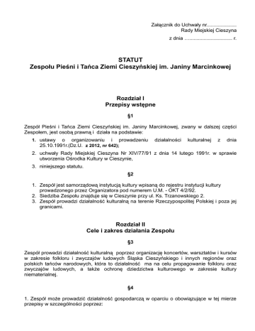 Załącznik do Uchwały nr..................... Rady Miejskiej Cieszyna z dnia ….............................. r. STATUT Zespołu Pieśni i Tańca Ziemi Cieszyńskiej im. Janiny Marcinkowej Rozdział I Przepisy wstępne §1 Zespół Pieśni i Tańca Ziemi Cieszyńskiej im. Janiny Marcinkowej, zwany w dalszej części Zespołem, jest osobą prawną i działa na podstawie: 1. ustawy o organizowaniu i prowadzeniu 25.10.1991r.(Dz.U. z 2012, nr 642); działalności kulturalnej z dnia 2. uchwały Rady Miejskiej Cieszyna Nr XIV/77/91 z dnia 14 lutego 1991r. w sprawie utworzenia Ośrodka Kultury w Cieszynie, 3. niniejszego statutu. §2 1. Zespół jest samorządową instytucją kultury wpisaną do rejestru instytucji kultury prowadzonego przez Organizatora pod numerem U.M. - OKT 4/2/92. 2. Siedziba Zespołu znajduje się w Cieszynie przy ul. Ks. Trzanowskiego 2. 3. Zespół prowadzi działalność kulturalną na terenie Rzeczypospolitej Polskiej i poza jej granicami. Rozdział II Cele i zakres działania Zespołu §3 Zespół prowadzi działalność kulturalną poprzez organizację koncertów, warsztatów i kursów w zakresie folkloru i zwyczajów ludowych Śląska Cieszyńskiego i innych regionów oraz polskich tańców narodowych, która to działalność ma na celu propagowanie folkloru oraz zwyczajów ludowych, a także ochronę dziedzictwa kulturowego w zakresie kultury niematerialnej. §4 1. Zespół może prowadzić działalność gospodarczą w oparciu o obowiązujące w tej mierze przepisy w szczególności poprzez: 1) organizowanie imprez; 2) prowadzenie działalności szkoleniowej; 3) działalność handlową. 2. Wypracowane dochody podczas prowadzenia działalności gospodarczej na zasadach określonych w odrębnych przepisach Zespół przeznacza na działalność statutową. Rozdział III Organy zarządzające i organizacja wewnętrzna Zespołu §5 Organem zarządzającym Zespołu jest dyrektor powoływany i odwoływany przez Burmistrza Miasta Cieszyna. §6 Organizację wewnętrzną Zespołu określa regulamin organizacyjny nadawany przez dyrektora. Rozdział IV Gospodarka Finansowa Zespołu §7 Źródła finansowania Zespołu: 1. Dotacja podmiotowa Organizatora na dofinansowanie działalności bieżącej w zakresie realizowanych zadań statutowych, w tym na utrzymanie i remontowanie obiektu stanowiącego siedzibę Zespołu. 2. Dotacja celowa Organizatora na finansowanie lub dofinansowanie kosztów realizacji inwestycji. 3. Dotacja celowa Organizatora na realizację wskazanych zadań i programów. 4. Dotacja celowa Organizatora na realizację zadań i programów z innych źródeł. 5. Przychody własne pochodzące z prowadzonej we własnym zakresie działalności, w tym z najmu i dzierżawy składników majątkowych, sprzedaży składników majątku ruchomego. 6. Środki otrzymane od osób fizycznych i prywatnych 7. Inne źródła określone przepisami prawa. §8 1. Dotacje udzielone przez Organizatora podlegają rozliczeniu do końca roku budżetowego. 2. Dotacje udzielone przez Organizatora w części niewykorzystanej do końca roku budżetowego podlegają zwrotowi do budżetu Gminy Cieszyn w terminie do dnia 31 stycznia następnego roku. §9 Zespół gospodaruje samodzielnie przydzieloną i nabytą częścią mienia oraz prowadzi samodzielną gospodarkę w ramach przyznanych środków, kierując się zasadami efektywności ich wykorzystania. Rozdział V Postanowienia końcowe §10 Zmiany w statucie dokonywane są w trybie jego nadania.