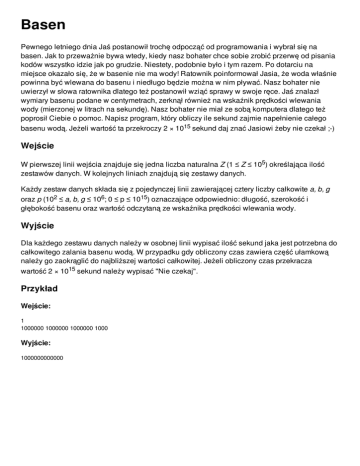 Basen Pewnego letniego dnia Jaś postanowił trochę odpocząć od programowania i wybrał się na basen. Jak to przeważnie bywa wtedy, kiedy nasz bohater chce sobie zrobić przerwę od pisania kodów wszystko idzie jak po grudzie. Niestety, podobnie było i tym razem. Po dotarciu na miejsce okazało się, że w basenie nie ma wody! Ratownik poinformował Jasia, że woda właśnie powinna być wlewana do basenu i niedługo będzie można w nim pływać. Nasz bohater nie uwierzył w słowa ratownika dlatego też postanowił wziąć sprawy w swoje ręce. Jaś znalazł wymiary basenu podane w centymetrach, zerknął również na wskaźnik prędkości wlewania wody (mierzonej w litrach na sekundę). Nasz bohater nie miał ze sobą komputera dlatego też poprosił Ciebie o pomoc. Napisz program, który obliczy ile sekund zajmie napełnienie całego basenu wodą. Jeżeli wartość ta przekroczy 2 × 1015 sekund daj znać Jasiowi żeby nie czekał ;-) Wejście W pierwszej linii wejścia znajduje się jedna liczba naturalna Z (1 ≤ Z ≤ 105) określająca ilość zestawów danych. W kolejnych liniach znajdują się zestawy danych. Każdy zestaw danych składa się z pojedynczej linii zawierającej cztery liczby całkowite a, b, g oraz p (102 ≤ a, b, g ≤ 106; 0 ≤ p ≤ 1015) oznaczające odpowiednio: długość, szerokość i głębokość basenu oraz wartość odczytaną ze wskaźnika prędkości wlewania wody. Wyjście Dla każdego zestawu danych należy w osobnej linii wypisać ilość sekund jaka jest potrzebna do całkowitego zalania basenu wodą. W przypadku gdy obliczony czas zawiera część ułamkową należy go zaokrąglić do najbliższej wartości całkowitej. Jeżeli obliczony czas przekracza wartość 2 × 1015 sekund należy wypisać "Nie czekaj". Przykład Wejście: 1 1000000 1000000 1000000 1000 Wyjście: 1000000000000