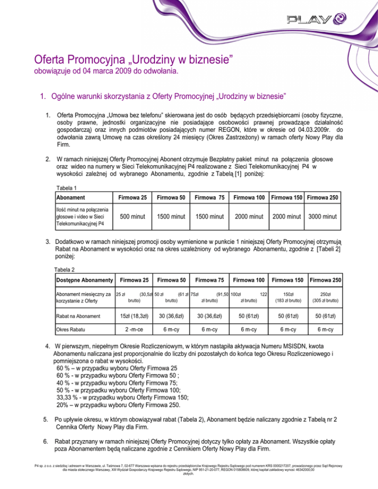 Oferta Promocyjna „Urodziny w biznesie” obowiązuje od 04 marca 2009 do odwołania. 1. Ogólne warunki skorzystania z Oferty Promocyjnej „Urodziny w biznesie” 1. Oferta Promocyjna „Umowa bez telefonu” skierowana jest do osób będących przedsiębiorcami (osoby fizyczne, osoby prawne, jednostki organizacyjne nie posiadające osobowości prawnej prowadzące działalność gospodarczą) oraz innych podmiotów posiadających numer REGON, które w okresie od 04.03.2009r. do odwołania zawrą Umowę na czas określony 24 miesięcy (Okres ZastrzeŜony) w ramach oferty Nowy Play dla Firm. 2. W ramach niniejszej Oferty Promocyjnej Abonent otrzymuje Bezpłatny pakiet minut na połączenia głosowe oraz wideo na numery w Sieci Telekomunikacyjnej P4 realizowane z Sieci Telekomunikacyjnej P4 w wysokości zaleŜnej od wybranego Abonamentu, zgodnie z Tabelą [1] poniŜej: Tabela 1 Abonament Firmowa 25 Firmowa 50 Firmowa 75 Firmowa 100 Firmowa 150 Firmowa 250 Ilość minut na połączenia głosowe i video w Sieci Telekomunikacyjnej P4 500 minut 1500 minut 1500 minut 2000 minut 2000 minut 3000 minut 3. Dodatkowo w ramach niniejszej promocji osoby wymienione w punkcie 1 niniejszej Oferty Promocyjnej otrzymują Rabat na Abonament w wysokości oraz na okres uzaleŜniony od wybranego Abonamentu, zgodnie z [Tabeli 2] poniŜej: Tabela 2 Dostępne Abonamenty Firmowa 25 Firmowa 50 Firmowa 75 Firmowa 100 Abonament miesięczny za 25 zł (30,5zł 50 zł (61 zł 75zł (91,50 100zł 122 brutto) brutto) zł brutto) zł brutto) korzystanie z Oferty Rabat na Abonament Okres Rabatu Firmowa 150 Firmowa 250 150zł (183 zł brutto) 250zł (305 zł brutto) 15zł (18,3zł) 30 (36,6zł) 30 (36,6zł) 50 (61zł) 50 (61zł) 50 (61zł) 2 -m-ce 6 m-cy 6 m-cy 6 m-cy 6 m-cy 6 m-cy 4. W pierwszym, niepełnym Okresie Rozliczeniowym, w którym nastąpiła aktywacja Numeru MSISDN, kwota Abonamentu naliczana jest proporcjonalnie do liczby dni pozostałych do końca tego Okresu Rozliczeniowego i pomniejszona o rabat w wysokości. 60 % – w przypadku wyboru Oferty Firmowa 25 60 % - w przypadku wyboru Oferty Firmowa 50 ; 40 % - w przypadku wyboru Oferty Firmowa 75; 50 % - w przypadku wyboru Oferty Firmowa 100; 33,33 % - w przypadku wyboru Oferty Firmowa 150; 20% – w przypadku wyboru Oferty Firmowa 250. 5. Po upływie okresu, w którym obowiązywał rabat (Tabela 2), Abonament będzie naliczany zgodnie z Tabelą nr 2 Cennika Oferty Nowy Play dla Firm. 6. Rabat przyznany w ramach niniejszej Oferty Promocyjnej dotyczy tylko opłaty za Abonament. Wszystkie opłaty poza Abonamentem będą naliczane zgodnie z Cennikiem Oferty Nowy Play dla Firm. P4 sp. z o.o. z siedzibą i adresem w Warszawie, ul. Taśmowa 7, 02-677 Warszawa wpisana do rejestru przedsiębiorców Krajowego Rejestru Sądowego pod numerem KRS 0000217207, prowadzonego przez Sąd Rejonowy dla miasta stołecznego Warszawy, XIII Wydział Gospodarczy Krajowego Rejestru Sądowego, NIP 951-21-20-077, REGON 015808609, której kapitał zakładowy wynosi: 46342000,00 złotych. 7. Pakiet minut [Tabela 1] jest przyznawany pierwszego dnia kalendarzowego Okresu rozliczeniowego pomiędzy godziną 00:00 a 01:00 przez cały okres świadczenia Usług telekomunikacyjnych przez P4 SP. z. o. o dla Abonenta w ramach Oferty, o której mowa powyŜej 8. Za okres od daty aktywacji Numeru MSISDN do ostatniego dnia pierwszego, niepełnego Okresu Rozliczeniowego Liczba minut w pakiecie minut przyznawana jest w ilości proporcjonalnej do liczby dni pozostałych do końca tego Okresu Rozliczeniowego. 9. Zmiana Abonamentu na wyŜszy , nie powoduje utraty prawa korzystania z pakietu minut przyznanego w ramach niniejszej Oferty Promocyjnej, a pakiet minut przyznawany jest zgodnie z Tabelą nr 1 powyŜej dla wybranego Abonamentu. Zmiana Abonamentu na wyŜszy powoduje utratę prawa do korzystania z rabatu. 10. Niewykorzystane w danych Okresie rozliczeniowym minuty z pakietu minut nie przechodzą na kolejny Okres Rozliczeniowy. Pakiet minut przyznawany w ramach niniejszej Oferty Promocyjnej jest dostępny po wykorzystaniu Pakietu Minut w ramach Abonamentu i jest wykorzystywany jednocześnie z Pakietem Minut Play dostępnym w ramach Abonamentu. 11. Dodatkowo osoby, o których mowa w punkcie 1 niniejszej Oferty Promocyjnej, które zawrą Umowę w ramach oferty Nowy Play dla Firm i wybiorą jeden z dostępnych Abonamentów opisanych w [Tabeli 3 i Tabela 4] poniŜej, otrzymają: a) Przez 6 (sześć) pierwszych pełnych Okresów Rozliczeniowych usługę „Pakiet SMS/MMS dla Firm” w cenie pomniejszonej o rabat w wysokości 95%. Wielkość „Pakietu SMS/MMS dla Firm” uzaleŜniona jest od wybranego Abonamentu w ramach niniejszej promocji. Tabela 3 Dostępne Abonamenty Firmowa 50 Firmowa 75 Firmowa 100 Firmowa 150 Firmowa 250 Pakiet SMS/MMS dla Firm Pakiet 100 SMS/MMS Pakiet 100 SMS/MMS Pakiet 200 SMS/MMS Pakiet 200 SMS/MMS Pakiet 200 SMS/MMS Miesięczny Abonament za korzystanie z usługi przed Rabatem 3 zł (3,66 zł z VAT) 3 zł (3,66 zł z VAT) 5 zł (6,1 zł z VAT) 5 zł (6,1 zł z VAT) 5 zł (6,1 zł z VAT) 6 Pełnych Okresów Rabatowania 95% rabatu b) Przez 3 (trzy) pierwsze pełne Okresy Rozliczeniowe usługę „Pakiet Internet dla Firm” w cenie pomniejszonej o rabat w wysokości 95%. Wielkość „Pakietu Internet dla Firm” uzaleŜniona jest od wybranego Abonamentu w ramach niniejszej promocji Tabela 4 Dostępne Abonamenty Firmowa 50 Firmowa 75 Firmowa 100 Firmowa 150 Firmowa 250 Pakiet Internet dla Firm Pakiet 30MB Pakiet 30MB Pakiet 60MB Pakeit 60MB Pakiet 60MB Miesięczny Abonament za korzystanie z usługi przed Rabatem 20 zł (24,4 zł z VAT) 20 zł (24,4 zł z VAT) 40 zł (48,8 zł z 40 zł (48,8 zł z 40 zł (48,8 zł z VAT) VAT) VAT) 3 Pełne Okresy Rabatowania 95% rabatu P4 sp. z o.o. z siedzibą i adresem w Warszawie, ul. Taśmowa 7, 02-677 Warszawa wpisana do rejestru przedsiębiorców Krajowego Rejestru Sądowego pod numerem KRS 0000217207, prowadzonego przez Sąd Rejonowy dla miasta