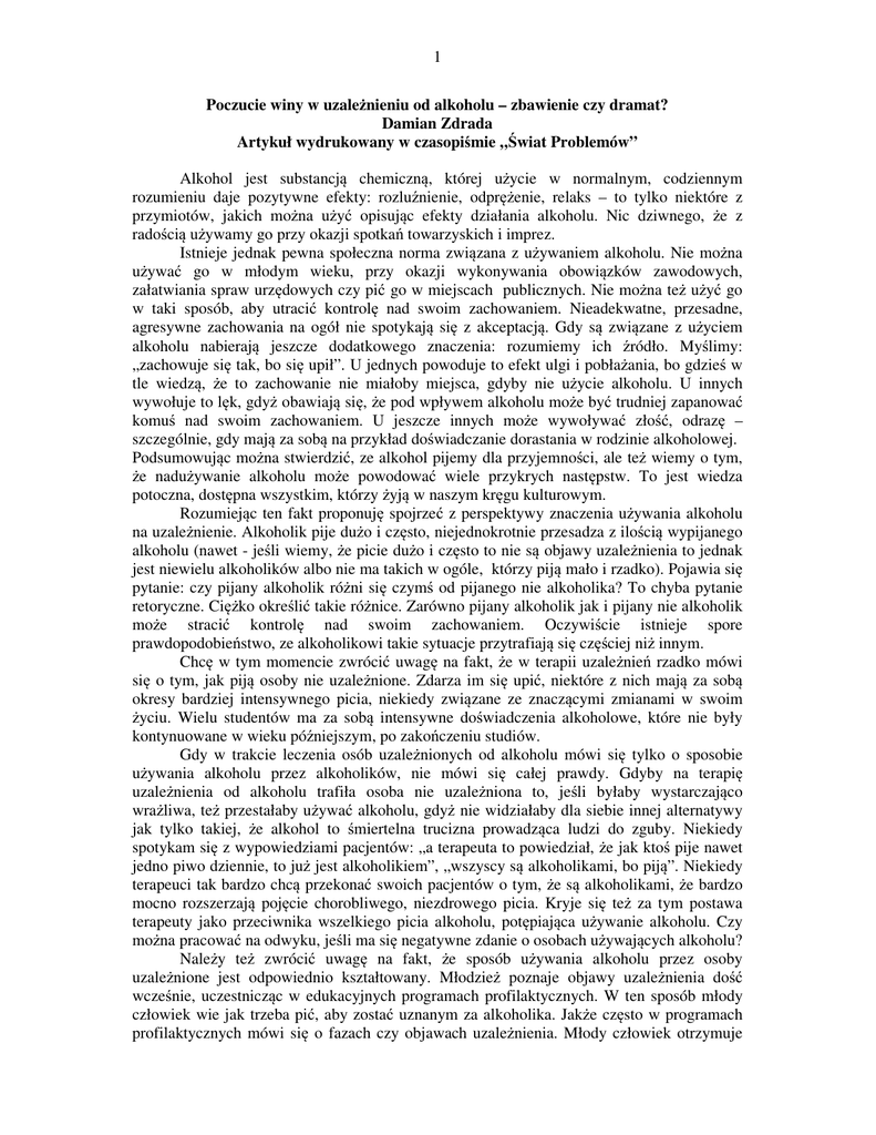1 Poczucie winy w uzależnieniu od alkoholu – zbawienie czy dramat? Damian Zdrada Artykuł wydrukowany w czasopiśmie „Świat Problemów” Alkohol jest substancją chemiczną, której użycie w normalnym, codziennym rozumieniu daje pozytywne efekty: rozluźnienie, odprężenie, relaks – to tylko niektóre z przymiotów, jakich można użyć opisując efekty działania alkoholu. Nic dziwnego, że z radością używamy go przy okazji spotkań towarzyskich i imprez. Istnieje jednak pewna społeczna norma związana z używaniem alkoholu. Nie można używać go w młodym wieku, przy okazji wykonywania obowiązków zawodowych, załatwiania spraw urzędowych czy pić go w miejscach publicznych. Nie można też użyć go w taki sposób, aby utracić kontrolę nad swoim zachowaniem. Nieadekwatne, przesadne, agresywne zachowania na ogół nie spotykają się z akceptacją. Gdy są związane z użyciem alkoholu nabierają jeszcze dodatkowego znaczenia: rozumiemy ich źródło. Myślimy: „zachowuje się tak, bo się upił”. U jednych powoduje to efekt ulgi i pobłażania, bo gdzieś w tle wiedzą, że to zachowanie nie miałoby miejsca, gdyby nie użycie alkoholu. U innych wywołuje to lęk, gdyż obawiają się, że pod wpływem alkoholu może być trudniej zapanować komuś nad swoim zachowaniem. U jeszcze innych może wywoływać złość, odrazę – szczególnie, gdy mają za sobą na przykład doświadczanie dorastania w rodzinie alkoholowej. Podsumowując można stwierdzić, ze alkohol pijemy dla przyjemności, ale też wiemy o tym, że nadużywanie alkoholu może powodować wiele przykrych następstw. To jest wiedza potoczna, dostępna wszystkim, którzy żyją w naszym kręgu kulturowym. Rozumiejąc ten fakt proponuję spojrzeć z perspektywy znaczenia używania alkoholu na uzależnienie. Alkoholik pije dużo i często, niejednokrotnie przesadza z ilością wypijanego alkoholu (nawet - jeśli wiemy, że picie dużo i często to nie są objawy uzależnienia to jednak jest niewielu alkoholików albo nie ma takich w ogóle, którzy piją mało i rzadko). Pojawia się pytanie: czy pijany alkoholik różni się czymś od pijanego nie alkoholika? To chyba pytanie retoryczne. Ciężko określić takie różnice. Zarówno pijany alkoholik jak i pijany nie alkoholik może stracić kontrolę nad swoim zachowaniem. Oczywiście istnieje spore prawdopodobieństwo, ze alkoholikowi takie sytuacje przytrafiają się częściej niż innym. Chcę w tym momencie zwrócić uwagę na fakt, że w terapii uzależnień rzadko mówi się o tym, jak piją osoby nie uzależnione. Zdarza im się upić, niektóre z nich mają za sobą okresy bardziej intensywnego picia, niekiedy związane ze znaczącymi zmianami w swoim życiu. Wielu studentów ma za sobą intensywne doświadczenia alkoholowe, które nie były kontynuowane w wieku późniejszym, po zakończeniu studiów. Gdy w trakcie leczenia osób uzależnionych od alkoholu mówi się tylko o sposobie używania alkoholu przez alkoholików, nie mówi się całej prawdy. Gdyby na terapię uzależnienia od alkoholu trafiła osoba nie uzależniona to, jeśli byłaby wystarczająco wrażliwa, też przestałaby używać alkoholu, gdyż nie widziałaby dla siebie innej alternatywy jak tylko takiej, że alkohol to śmiertelna trucizna prowadząca ludzi do zguby. Niekiedy spotykam się z wypowiedziami pacjentów: „a terapeuta to powiedział, że jak ktoś pije nawet jedno piwo dziennie, to już jest alkoholikiem”, „wszyscy są alkoholikami, bo piją”. Niekiedy terapeuci tak bardzo chcą przekonać swoich pacjentów o tym, że są alkoholikami, że bardzo mocno rozszerzają pojęcie chorobliwego, niezdrowego picia. Kryje się też za tym postawa terapeuty jako przeciwnika wszelkiego picia alkoholu, potępiająca używanie alkoholu. Czy można pracować na odwyku, jeśli ma się negatywne zdanie o osobach używających alkoholu? Należy też zwrócić uwagę na fakt, że sposób używania alkoholu przez osoby uzależnione jest odpowiednio kształtowany. Młodzież poznaje objawy uzależnienia dość wcześnie, uczestnicząc w edukacyjnych programach profilaktycznych. W ten sposób młody człowiek wie jak trzeba pić, aby zostać uznanym za alkoholika. Jakże często w programach profilaktycznych mówi się o fazach czy objawach uzależnienia. Młody człowiek otrzymuje 2 receptę na alkoholizm, a dla wielu z nich jest to interesująca perspektywa, jeśli brak innych. Oczywiście, istnieje jeszcze wiele innych sposobów na to, żeby dowiedzieć się, jak trzeba pić, aby stać się alkoholikiem (masmedia, wzorce w rodzinie itp.) Jeśli zajmując się leczeniem uzależnienia koncentrujemy się tylko na sposobie używania alkoholu opisanym za pomocą kryteriów diagnostycznych, możemy – paradoksalnie – zajmować się tym, co nie jest specyficzne dla pijącego człowieka, ale tym, co pochodzi z jego otoczenia. Nie jest istotne „jak” pije alkoholik, ale „po co”? Wracając do początku wydaje się, że pije, aby odczuć ulgę, radość, rozluźnienie. Zwróćmy jednak uwagę, że dla tych powodów piją wszyscy, którzy piją. Oczywiste jest, że alkoholik pije też dlatego. Jednak w wypadku uzależnienia chodzi jeszcze o coś więcej. Gdy alkoholicy relacjonują przebieg używania alkoholu, mówią o przyjemnych doznaniach. Są one na ogół na początku incydentu związanego z piciem. Oczywiście – podobnie jest u nie uzależnionych. Niewielkie ilości alkoholu na ogół powodują te doznania. Sytuacja zmienia się w toku dalszego picia. Przyjemne doznania są zastępowane euforycznymi, te zaś podlegają coraz mniejszej kontroli aż do utraty przytomności, urwanego filmu. Co się dzieje następnego dnia, gdy ktoś budzi się pijackiego snu? Jedni, co prawda – z bólem głowy, ale zwlekają się z łóżka i starają się doprowadzić do jako takiej używalności. Myślą, że chociaż dzisiaj nie jest wszystko w normie, to jednak wczorajsza do