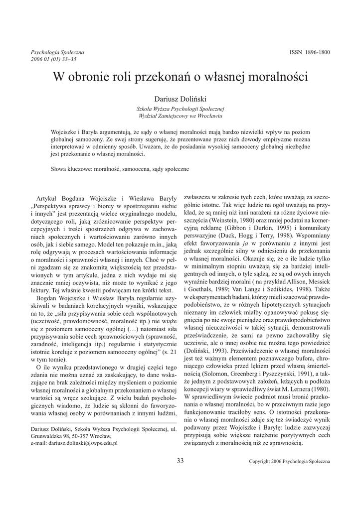 ISSN 1896-1800 Psychologia Społeczna 2006 01 (01) 33–35 W obronie roli przekonań o własnej moralności Dariusz Doliński Szkoła Wyższa Psychologii Społecznej Wydział Zamiejscowy we Wrocławiu Wojciszke i Baryła argumentują, że sądy o własnej moralności mają bardzo niewielki wpływ na poziom globalnej samooceny. Ze swej strony sugeruję, że prezentowane przez nich dowody empiryczne można interpretować w odmienny sposób. Uważam, że do posiadania wysokiej samooceny globalnej niezbędne jest przekonanie o własnej moralności. Słowa kluczowe: moralność, samoocena, sądy społeczne zwłaszcza w zakresie tych cech, które uważają za szczególnie istotne. Tak więc ludzie na ogół uważają na przykład, że są mniej niż inni narażeni na różne życiowe nieszczęścia (Weinstein, 1980) oraz mniej podatni na komercyjną reklamę (Gibbon i Durkin, 1995) i komunikaty perswazyjne (Duck, Hogg i Terry, 1998). Wspomniany efekt faworyzowania ja w porównaniu z innymi jest jednak szczególnie silny w odniesieniu do przekonania o własnej moralności. Okazuje się, że o ile ludzie tylko w minimalnym stopniu uważają się za bardziej inteligentnych od innych, o tyle sądzą, że są od owych innych wyraźnie bardziej moralni ( na przykład Allison, Messick i Goethals, 1989; Van Lange i Sedikides, 1998). Także w eksperymentach badani, którzy mieli szacować prawdopodobieństwo, że w różnych hipotetycznych sytuacjach nieznany im człowiek miałby opanowywać pokusę sięgnięcia po nie swoje pieniądze oraz prawdopodobieństwo własnej nieuczciwości w takiej sytuacji, demonstrowali przeświadczenie, że sami na pewno zachowaliby się uczciwie, ale o innej osobie nie można tego powiedzieć (Doliński, 1993). Przeświadczenie o własnej moralności jest też ważnym elementem poznawczego bufora, chroniącego człowieka przed lękiem przed własną śmiertelnością (Solomon, Greenberg i Pyszczynski, 1991), a także jednym z podstawowych założeń, leżących u podłoża koncepcji wiary w sprawiedliwy świat M. Lernera (1980). W sprawiedliwym świecie podmiot musi bronić przekonania o własnej moralności, bo w przeciwnym razie jego funkcjonowanie traciłoby sens. O istotności przekonania o własnej moralności zdaje się też świadczyć wynik podawany przez Wojciszke i Baryłę: ludzie zazwyczaj przypisują sobie większe natężenie pozytywnych cech związanych z moralnością niż ze sprawnością. Artykuł Bogdana Wojciszke i Wiesława Baryły „Perspektywa sprawcy i biorcy w spostrzeganiu siebie i innych” jest prezentacją wielce oryginalnego modelu, dotyczącego roli, jaką zróżnicowanie perspektyw percepcyjnych i treści spostrzeżeń odgrywa w zachowaniach społecznych i wartościowaniu zarówno innych osób, jak i siebie samego. Model ten pokazuje m.in., jaką rolę odgrywają w procesach wartościowania informacje o moralności i sprawności własnej i innych. Choć w pełni zgadzam się ze znakomitą większością tez przedstawionych w tym artykule, jedna z nich wydaje mi się znacznie mniej oczywista, niż może to wynikać z jego lektury. Tej właśnie kwestii poświęcam ten krótki tekst. Bogdan Wojciszke i Wiesław Baryła regularnie uzyskiwali w badaniach korelacyjnych wyniki, wskazujące na to, że „siła przypisywania sobie cech wspólnotowych (uczciwość, prawdomówność, moralność itp.) nie wiąże się z poziomem samooceny ogólnej (…) natomiast siła przypisywania sobie cech sprawnościowych (sprawność, zaradność, inteligencja itp.) regularnie i statystycznie istotnie koreluje z poziomem samooceny ogólnej” (s. 21 w tym tomie). O ile wyniku przedstawionego w drugiej części tego zdania nie można uznać za zaskakujący, to dane wskazujące na brak zależności między myśleniem o poziomie własnej moralności a globalnym przekonaniem o własnej wartości są wręcz szokujące. Z wielu badań psychologicznych wiadomo, że ludzie są skłonni do faworyzowania własnej osoby w porównaniach z innymi ludźmi, Dariusz Doliński, Szkoła Wyższa Psychologii Społecznej, ul. Grunwaldzka 98, 50-357 Wrocław, e-mail: [email protected] 33 Copyright 2006 Psychologia Społeczna 34 DARIUSZ DOLIŃSKI W świetle wszystkich tych danych zdumiewać musi konkluzja Autorów, że przekonanie o własnej moralności nie jest związane z ogólnym przeświadczeniem o własnej wartości. Jak można przytaczane przez nich wyniki badań zrozumieć w świetle powyższych rozważań? Prawdę mówiąc, kiedyś sądziłem, że moi szanowni koledzy nie zauważyli ważnej prawidłowości, która mogła omawiany efekt ujawnić w badaniach korelacyjnych. Sądziłem, że być może sądy o własnej moralności charakteryzują się bardzo niską wariancją w populacji, co sprawia, że ich korelacje z samooceną globalną są niskie. Z publikacji, do której autorzy się odwołują (Wojciszke i Baryła, 2004), wynika jednak, że tak nie jest. Omawiana przez nich prawidłowość nie jest więc artefaktem. Mimo to sądzę, że poczyniona przez nich konkluzja nie jest uprawniona. Wydaje mi się nieprawdopodobne, by szczegółowe przekonania na własny temat, które podlegają tak silnym egotystycznym zniekształceniom percepcyjnym (ja jestem bardziej moralny od innych) i które pełnią tak istotną rolę w procesach samoregulacji (kluczowy element bufora lęku przed śmiercią, podstawa sensu wiary w sprawiedliwość świata itd.), nie były istotnym składnikiem zgeneralizowanego przekonania o własnej wartości. Jak więc można wyjaśnić konsekwentne uzyskiwanie przez Wojciszke i Baryłę wyniku wskazującego na brak związku między przekonaniem o swojej moralności a zgeneralizowanym poczuciem własnej wartości? Zacznę od przypomnienia, że większość ludzi jest przekonana o swojej wysokiej moralności. Fakt ten jest zastanawiający w świetle licznych dowodów wskazujących na powszechność występowania wśród ludzi najróżniejszych zachowań niem