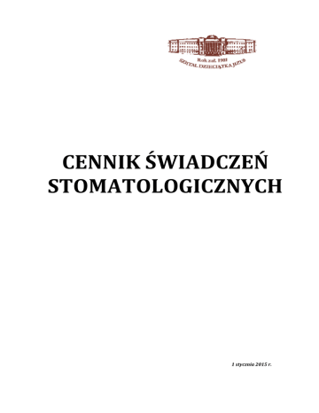 CENNIK ŚWIADCZEŃ STOMATOLOGICZNYCH 1 stycznia 2015 r. Cennik świadczeń stomatologicznych Szpitala Klinicznego Dzieciątka Jezus 1 Zakład Protetyki Stomatologicznej strona 3 2 Zakład Stomatologii Dziecięcej strona 5 3 Zakład Chirurgii Stomatologicznej strona 7 4 Zakład Chorób Błony Śluzowej i Przyzębia strona 10 5 Zakład Stomatologii Zachowawczej strona 11 6 Zakład Ortodoncji strona 12 str. 2 z 15 Zakład Protetyki Stomatologicznej L.p. 500-20-25 Nazwa usługi 1. 2. 3. 4. Protezy stałe Korona akrylowa wykonana laboratoryjnie Korona akrylowa wykonana metodą bezpośrednią Korona lana-element lany w moście-punkt Korona lana licowana porcelaną lub element mostu-punkt 5. Korona lana licowana porcelaną lub element mostu na stopie Au-Pl 6. 7. 8. 9. 10. 11. 12. Korona ceramiczna Korona teleskopowa (pierwotna i wtórna) Licówka porcelanowa-punkt Wkład koronowy ceramiczny Meryland licowany porcelaną (cena z uchwytem)-punkt Wkład koronowo-korzeniowy Wkład koronowo-korzeniowy (składany) Cennik Cennik podstawowy specjalistyczny 100,00 50,00 200,00 450,00 450,00 +koszt stopu 600,00 900,00 600,00 500,00 500,00 250,00 300,00 250,00 +koszt stopu 300,00 +koszt stopu 300,00 350,00 450,00 100,00 100,00 400,00 900,00 900,00 +koszt stopu 1 500,00 1 500,00 1 000,00 600,00 800,00 500,00 600,00 500,00 +koszt stopu 600,00 +koszt stopu 450,00 500,00 600,00 18. 19. 20. 21. 22. 23. 24. 25. 26. 27. Protezy ruchome Punkt protezy częściowej akrylowej (ząb Mifam, klamra) Proteza uzupełniająca brak 1-4 zębów Proteza całkowita Płyta protezy-Ivocap Płyta protezy-lana Proteza nakładkowa Proteza szkieletowa Szyna zgryzowa-akrylowa Szyna zgryzowa-silikonowa Szyna zgryzowa ESSEX 40,00 300,00 700,00 150,00 600,00 600,00 850,00 400,00 50,00 250,00 80,00 450,00 1 200,00 150,00 600,00 1 000,00 1 500,00 700,00 50,00 400,00 28. 29. 30. 31. 32. 33. 34. 35. 36. 37. 38. 39. 40. 41. 42. 43. Naprawy i inne Naprawa protezy (złamanie, pęknięcie) Punkt naprawy protezy (dostawienie zęba Mifam, klamry) Wymiana matrycy w protezie Podścielenie protezy-tworzywem akrylowym-metodą pośrednią Podścielenie protezy-materiałem elastycznym-metodą bezpośrednią Wzmocnienie płyty protezy siatką Wzmocnienie lane płyty protezy Klamra lana w protezie akrylowej Szablon chirurgiczny Zaczep precyzyjny do protez Zdjęcie korony, mostu za punkt Wypełnienie ubytku małe/ odbudowa powierzchni żującej Wypełnienie ubytku duże/ odbudowa powierzchni żującej Leczenie endodontyczne z wypełnieniem 1 kanału Leczenie endodontyczne z wypełnieniem 2 kanałów Leczenie endodontyczne z wypełnieniem 3 kanałów 50,00 50,00 150,00 250,00 50,00 60,00 400,00 100,00 150,00 250,00 50,00 70,00 100,00 100,00 150,00 200,00 100,00 100,00 250,00 400,00 80,00 100,00 500,00 150,00 300,00 500,00 100,00 150,00 170,00 180,00 280,00 330,00 13. Wkład koronowo-korzeniowy ze stopu Au-Pt 14. Wkład koronowo-korzeniowy ze stopu Au-Pt składany 15. Wkład z kulką Reihn 83+(matryca) 16. Wkład koronowo-korzeniowy pojedyńczy (włókno szklane) 17. Wkład koronowo-korzeniowy złożony (włókno szklane) str. 3 z 15 Zakład Protetyki Stomatologicznej L.p. 44. 45. 46. 47. 48. 49. 500-20-25 Nazwa usługi Ekstrakcja zęba Znieczulenie Modele diagnostyczne Kontrola przebiegu leczenia specjalistycznego Konsultacja profesorska Konsultacja specjalisty Cennik Cennik podstawowy specjalistyczny -20,00 40,00 ---- 100,00 20,00 80,00 70,00 150,00 100,00 str. 4 z 15 Zakład Stomatologii Dziecięcej L.p. Nazwa usługi 1 2 3 4 5 6 7 8 9 10 11 12 13 14 15 16 17 18 19 20 21 Badanie lekarskie Badanie kontrolne Badanie specjalistyczne Amputacja mortalna miazgi w zębie mlecznym Amputacja przyżyciowa miazgi Badanie żywotności miazgi Chirurgiczne zaopatrzenie rany Dodatkowe wzmocnienie zęba włóknem szklanym Ekstrakcja zęba mlecznego Ekstrakcja zęba poprzez dłutowanie Ekstrakcja zęba stałego 1-korzeniowego Ekstrakcja zęba stałego wielokorzeniowego Ekstrakcja zęba z rozdzieleniem korzenia Ekstyrpacja miazgi z jednego kanału Korona stalowa Kosmetyczne pokrycie niedorozwoju szkliwa Lakierowanie ½ łuku zębowego Lakierowanie zębów mlecznych Lakowanie (jeden ząb) Lapisowanie (jeden ząb) - następna wizyta Lapisowanie (jeden ząb) - pierwsza wizyta Leczenie niewspółpracującego dziecka z przytrzymaniem i użyciem palca metalowego za zgodą opiekuna (do usługi dolicza się wykonane leczenie wg cennika) Leczenie zmian na błonie śluzowej Nacięcie ropnia Oczyszczenie zębów z miękkiego osadu obu łuków Odbudowa na włóknie szklanym Odbudowa siekacza materiałem ostatecznym Odbudowa zęba po urazie Opatrunek (w zębie stałym lub mlecznym) Opatrunek leczniczy do ubytku Ostateczne opracowanie kanału Ostateczne wypełnienie 1 kanału w zębie mlecznym Ostateczne wypełnienie kanału - za każdy kanał Plastyka wędzidełka wargi górnej lub dolnej, języka, policzka (ze znieczuleniem) Plastyka wyrostka zębodołowego - jeden zębodół Pokrycie bezpośrednie miazgi zęba Pokrycie pośrednie miazgi zęba Próba rewizji kanału - za każdy kanał Resekcja wierzchołka korzenia Rewizja kanału - za każdy kanał Skaling ½ łuku zębowego (łuki x2) Szyna wewnątrzzębowa - jeden punkt Szyna zewnątrzzębowa - jeden punkt Trepanacja martwego zęba 22 23 24 25 26 27 28 29 30 31 32 33 34 35 36 37 38 39 40 41 42 43 44 500-20-22 Ceny komercyjne w zł - Ceny komercyjne w zł leczenie prowadzone leczenie wykonywane przez lekarza w grupie studenckiej 35,00 35,00 60,00 47,00 54,00 10,00 78,00 144,00 60,00 230,00 80,00 100,00 170,00 77,00 134,00 100,00 71,00 60,00 50,00 5,00 10,00 --------------50,00 --------------------------- 50,00 39,00 60,00 60,00 300,00 150,00 150,00 44,00 50,00 50,00 70,00 80,00 ------40,00 ----------------- 200,00 100,00 35,00 20,00 50,00 350,00 100,00 34,00 100,00 80,00 50,00 --------------10,00 ------- str. 5 z 15 Zakład Stomatologii Dziecięcej L.p. 45 46 47 48 49 50 51 52 53 54 55 56 57 58 59 60 61 62 63 Nazwa usługi Wykonani