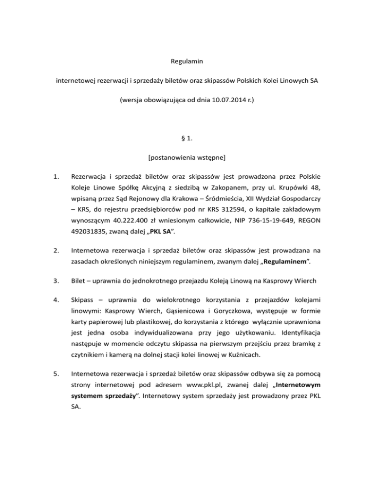 Regulamin internetowej rezerwacji i sprzedaży biletów oraz skipassów Polskich Kolei Linowych SA (wersja obowiązująca od dnia 10.07.2014 r.) § 1. [postanowienia wstępne] 1. Rezerwacja i sprzedaż biletów oraz skipassów jest prowadzona przez Polskie Koleje Linowe Spółkę Akcyjną z siedzibą w Zakopanem, przy ul. Krupówki 48, wpisaną przez Sąd Rejonowy dla Krakowa – Śródmieścia, XII Wydział Gospodarczy – KRS, do rejestru przedsiębiorców pod nr KRS 312594, o kapitale zakładowym wynoszącym 40.222.400 zł wniesionym całkowicie, NIP 736-15-19-649, REGON 492031835, zwaną dalej „PKL SA”. 2. Internetowa rezerwacja i sprzedaż biletów oraz skipassów jest prowadzana na zasadach określonych niniejszym regulaminem, zwanym dalej „Regulaminem”. 3. Bilet – uprawnia do jednokrotnego przejazdu Koleją Linową na Kasprowy Wierch 4. Skipass – uprawnia do wielokrotnego korzystania z przejazdów kolejami linowymi: Kasprowy Wierch, Gąsienicowa i Goryczkowa, występuje w formie karty papierowej lub plastikowej, do korzystania z którego wyłącznie uprawniona jest jedna osoba indywidualizowana przy jego użytkowaniu. Identyfikacja następuje w momencie odczytu skipassa na pierwszym przejściu przez bramkę z czytnikiem i kamerą na dolnej stacji kolei linowej w Kuźnicach. 5. Internetowa rezerwacja i sprzedaż biletów oraz skipassów odbywa się za pomocą strony internetowej pod adresem www.pkl.pl, zwanej dalej „Internetowym systemem sprzedaży”. Internetowy system sprzedaży jest prowadzony przez PKL SA. 6. Użytkownikiem Internetowego systemu sprzedaży może być osoba fizyczna posiadająca zdolność do czynności prawnych nie będąca przedsiębiorcą w rozumieniu odrębnych przepisów. 7. Użytkownicy Internetowego systemu sprzedaży są zobowiązani do zapoznania się z Regulaminem i zaakceptować go. 8. Użytkownicy, korzystając z Internetowego systemu sprzedaży, są zobowiązani do przestrzegania przepisów obowiązującego prawa oraz postanowień Regulaminu. Użytkownicy nie mogą wykorzystywać Internetowego systemu sprzedaży do dostarczania komukolwiek treści o charakterze bezprawnym. 9. Użytkownicy Internetowego systemu sprzedaży przyjmują do wiadomości fakt, że bezpieczne kursowanie kolei linowych jest uzależnione od panujących warunków atmosferycznych, oraz że w przypadku pogorszenia się tych warunków kursowanie kolei może zostać bez uprzedzenia i do odwołania wstrzymane. 10. Do korzystania z Internetowego systemu sprzedaży niezbędne jest spełnienie następujących wymagań technicznych: 1) dysponowanie komputerem klasy PC lub urządzeniem przenośnym; 2) dostęp do sieci Internet; 3) zainstalowanie w systemie komputera lub urządzenia przenośnego przeglądarki internetowej oraz oprogramowania do otwierania plików pdf. 11. Ceny biletów i skipassów w Internetowym systemie sprzedaży: 1) są podane w złotych polskich; 2) zawierają podatek od towarów i usług (VAT); 3) nie zawierają kosztów dostarczenia karty plastikowej (elektronicznego nośnika skipassu), którego zakupu można dokonać na podstawie odrębnego Regulaminu zakupu i zakładki dostępnych pod adresem: https://b2c.pkl.pl 2 12. Cena biletu i skipassu podana w Internetowym systemie sprzedaży jest wiążąca w chwili dokonywania przez użytkownika rezerwacji biletu/skipassu. 13. Internetową rezerwację i sprzedaż biletów i skipassów prowadzi się przez 7 dni w tygodniu, 24 godziny na dobę z wyjątkiem koniecznych przerw technicznych lub awarii. Czynności w oznaczonych kasach PKL SA użytkownicy Internetowego systemu sprzedaży mogą dokonywać w godzinach pracy tych kas. Informacja o godzinach pracy kas stanowi załącznik nr 2 do Regulaminu. 14. Sprzedaż biletów i skipassów prowadzona jest także poza Internetowym systemem sprzedaży - w oznaczonych kasach PKL S.A. § 2. [bilety i skipassy] 1. Za pośrednictwem Internetowego systemu sprzedaży PKL S.A. prowadzi rezerwację i sprzedaż wybranych biletów oraz skipassów aktualnie znajdujących się w ofercie PKL S.A. Zastrzega się, że - w przypadku znacznego zainteresowania biletami/skipassami - PKL SA może wprowadzić ograniczenie liczby i rodzaju biletów/skipassów, które dany Użytkownik może zarezerwować i kupić na określony termin. 2. Zabrania się Użytkownikowi zakupionego skipassu pod rygorem sankcji wskazanych w § 8 Regulaminu przewozu osób, bagażu i rzeczy udostępniania ich osobom trzecim. 3. Zabrania się korzystania z zakupionego biletu lub skipassu nie zgodnego z obowiązującymi ulgami pod rygorem sankcji wskazanych w § 8 Regulaminu przewozu osób, bagażu i rzeczy udostępniania ich osobom trzecim 4. O dostępnej aktualnie puli biletów/skipassów użytkownicy Internetowego systemu sprzedaży są na bieżąco informowani w systemie. 5. W Internetowym systemie sprzedaży mogą być prowadzone akcje promocyjne dotyczące rezerwacji i sprzedaży wybranych biletów/skipassów. Zasady akcji promocyjnej zostaną określone odrębnym regulaminem promocji. 3 6. Uprawnienia wynikające z zakupu danego biletu lub skipassu oraz uprawnienia do ulg określają postanowienia Regulaminu przewozu osób, bagażu i rzeczy PKL SA oraz Taryfy PKL SA, stanowiące załącznik nr 1 do Regulaminu i dostępne w Internetowym systemie sprzedaży. 7. Nośnik elektroniczny w postaci plastikowej karty po nabyciu staje się własnością użytkownika i nie podlega zwrotowi, za wyjątkiem sytuacji wskazanych w regulaminie dostępnym pod adresem https://b2c.pkl.pl. W sprawach nieuregulowanych Regulaminem w zakresie praw i obowiązków użytkownika Internetowego systemu sprzedaży mają zastosowanie odpowiednie postanowienia Regulaminu przewozu osób, bagażu i rzeczy PKL SA oraz Taryfy PKL SA, stanowiące załącznik nr 1 do Regulaminu. § 3. [konto użytkownika i procedura zakupu] 1. Użytkownik rezerwuje i kupuje bilety oraz skipassy w Internetowym systemie sprzedaży za pomocą indywidualnego konta. 2