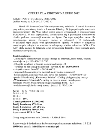 OFERTA DLA KIBICÓW NA EURO 2012 PAKIET POBYTU 3-dniowy EURO 2012 (pakiet ważny od 1.06 do 2.07.2012 r.) Hotel *** Senator Gran Via umiejscowiony zaledwie 15 km od Rzeszowa przy międzynarodowej trasie w kierunku Ukrainy. W jego pięknych wnętrzach przygotowaliśmy dla Was pakiet pełen emocji związanych z mistrzostwami EURO21012. U nas odpoczniesz, zrelaksujesz się i przeżyjesz niesamowite chwile podczas transmisji meczów na żywo. Do tego specjalne menu dla prawdziwego kibica. Oferujemy nocleg w pokojach1 i 2 osobowych, w pokojach typu studio oraz apartamentach- łącznie 70 miejsc w elegancko urządzonych pokojach w standardzie oferujemy telefon, telewizor LCD z TVSAT, stały dostęp do Internetu oraz nowoczesne łazienki. Hotel posiada duży monitorowany parking. Pakiet obejmuje: - 2 noclegi w komfortowym pokoju (dostęp do Internetu, mini barek, telefon, telewizja sat.) – 260/ 400/520 /780 - 2 bogate śniadania w formie stołu szwedzkiego - 0 - Voucher na bar (zakup na alkohol – kwota 30 zł) -30/60 /90/60 - zakąski – menu Euro212 – 20/20 /40/20 - wspólne kibicowanie przy meczach na żywo (w restauracji) - kolacja (zupa, danie główne, sok, kawa lub herbata) – 50/100 /150/100 - pakiet SPA dla niej „Kwiatowy Relaks” - Zabieg pielęgnacyjny twarzy „Witaminowe Ożywienie”- zabieg na twarz z serum i maską oraz masażem twarzy, Manicure z pełną pielęgnacją dłoni, – 135 - codzienne wejście do strefy sauny i jacuzzi 25 /50/75/50 525 zł – 10 % - 468 zł za 1 os 765 zł – 10 % 1010 zł 1145 zł – 10% Cennik pakietów EURO2012 Pokój 1-osobowy 479 zł/ os. Pokój 2-osobowy 689 zł/ 2 os. Pokój 3-osobowy 999 zł/ 3 os. Apartament 1029 zł/ 2 os. Grupy zorganizowane min. 20 osób – RABAT 10% Rezerwacje i dodatkowe informacje pod numerem telefonu: 17 222 6999 lub email: [email protected]