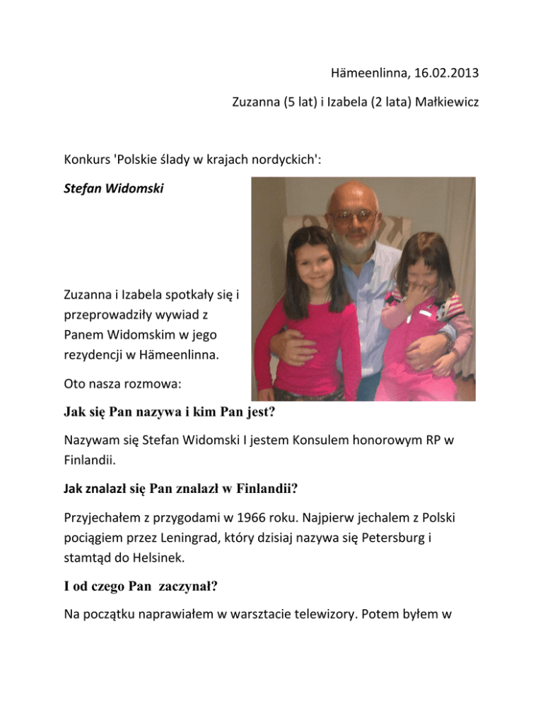 Hämeenlinna, 16.02.2013 Zuzanna (5 lat) i Izabela (2 lata) Małkiewicz Konkurs 'Polskie ślady w krajach nordyckich': Stefan Widomski Zuzanna i Izabela spotkały się i przeprowadziły wywiad z Panem Widomskim w jego rezydencji w Hämeenlinna. Oto nasza rozmowa: Jak się Pan nazywa i kim Pan jest? Nazywam się Stefan Widomski I jestem Konsulem honorowym RP w Finlandii. Jak znalazł się Pan znalazł w Finlandii? Przyjechałem z przygodami w 1966 roku. Najpierw jechalem z Polski pociągiem przez Leningrad, który dzisiaj nazywa się Petersburg i stamtąd do Helsinek. I od czego Pan zaczynał? Na początku naprawiałem w warsztacie telewizory. Potem byłem w drukarni, praacowałem w księgarni w Helsinkach i przez wiele lat w firmie Nokia. Ale muszę ci powiedzieć, że prawie bez przerwy się uczyłem. Najpierw języka fińskiego, byłem nawet tłumaczem prezydenta Urho Kekkonena, a potem nauczyłem się dobrej i wydajnej pracy z pożytkiem dla całej firmy Nokia. A co Pan robi w wolnym czasie? Podróżuję, czytam książki, spotykam się z przyjaciółmi, no i poluję. Co się Panu podoba w Finlandii? Ludzie i ich spokój oraz to że wszystko jest bardzo dobrze zorganizowane. Ale nie chciałbym mieszkać na północy Finlandii, bo zimą jest ciemno i trochę ponuro. W ogóle nie widać słońca przez pół roku. Co może Pan powiedzieć o Polsce? W ostatnich latach wiele na dobre się zmieniło i z tego bardzo się cieszę, bo mam większą szanse na szczere rozmowy z przyjaciółmi o interesujących mnie tematach, na przykład o sztuce. Czy wolalby Pan byc dzieckiem czy doroslym? Doroslym z radością życia dziecka. Dzieci mają w sobie niesamowitą otwartość i ciekawość świata, chęć poznawania ludzi. Czy spotkał Pan już jakiegoś świętego? Cyryla i Metodego nie, ale fińskiego z Rovaniemi tak, bo Święty Mikołaj to mój dobry kolega. Ten prawdziwy Mikolaj z Rovaniemi dostaje najwiecej listów od dzieci z całegoświata, także od dzieci z Polski. Co trzeba robić, żeby być takim jak Pan? Trzba się starać, dobrze się uczyć, potem uczciwie pracować, byc szczerym i mówić prawdę, być uczciwym i szanować wzystkich ludzi. Kim chciał Pan zostać będąc dzieckiem? Profesorem historii. Co chciałby Pan powiedzieć dzieciom od siebie? To bardzo trudne pytanie, ale odpowiem bądźcie grzeczne, sprzątajcie po sobie, pozostańcie dziećmi jak długo się da, najlepiej całe życie. Żeby się umieć bawić z każdymi dziećmi, nawet tymi, z którymi nikt inny się nie bawi. Czy lubi Pan dzieci? Bardzo lubię, mam czworo własnych i czworo wnucząt. Lubię wszystkie dzieci, własne i cudze, wszystkie! Zdaniem Zuzi Pan Widomski jest bardzo goscinny bo zapronował jej niebieski, a Izabeli czerwony pokój w swoim domu oraz poczęstował nas bardzo smaczną kolacją. Izię Pan Widomski przypadł do gustu bo powiedział że lubi dzieci i przypomina z wygladu jej dziadka ktory tez nosi brodę. Stefan Widomski oczami Zuzi. Stefan Widomski oczami Izy. Treść wywiadu i przemyślenia dzieci zanotowali rodzice.