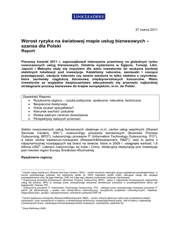27 marca 2011 Wzrost ryzyka na światowej mapie usług biznesowych – szansa dla Polski Raport Pierwszy kwartał 2011 r. zapoczątkował intensywne przemiany na globalnym rynku nowoczesnych usług biznesowych. Ostatnie wydarzenia w Egipcie, Tunezji, Libii, Japonii i Meksyku stały się impulsem dla wielu inwestorów do szukania bardziej stabilnych lokalizacji pod inwestycje. Kataklizmy naturalne, zamieszki i rosnąca przestępczość, odcięcie Internetu czy awarie zasilania to tylko niektóre z czynników, które zachwiały ciągłością biznesową międzynarodowych koncernów. Wielu inwestorów ze względów bezpieczeństwa zdecydowało się przenieść najbardziej strategiczne procesy biznesowe do krajów europejskich, m.in. do Polski. Zawartość Raportu Ryzykowne regiony – ryzyka polityczne, społeczne, naturalne, techniczne Bezpieczne destynacje Gdzie szukać specjalistów? Kierunek wschód i południe Polska ważnym centrum dowodzenia Perspektywy dalszych przemian Sektor nowoczesnych usług biznesowych obejmuje m.in. centra usług wspólnych (Shared Services Centers, SSC1), outsourcingu procesów biznesowych (Business Process Outsourcing, BPO2), outsourcingu procesów IT (Information Technology Outsourcing, ITO3), a także centra badawczo-rozwojowe (Research&Development, R&D4). Jest to jedna z najdynamiczniej rozwijających się branż na świecie, która w 2009 r. osiągnęła wartość 1.8 biliona USD5. Liderem outsourcingu są Indie i Chiny. Atrakcyjną destynacją pod inwestycje jest również region Europy Środkowo-Wschodniej. Ryzykowne regiony 1 Centra usług wspólnych (Shared Services Centers, SSC) - centra tworzone wewnątrz grupy kapitałowej przedsiębiorstwa, w formie wydzielonego oddziału lub oddzielnej spółki ze 100% kapitałem spółki matki, oferujące usługi dla swojego przedsiębiorstwa oraz dla jego klientów. SSC nie mają więc własnej osobowości prawnej i biznesowej. 2 Outsourcing procesów biznesowych (Business Process Outsourcing, BPO) - jeden z najbardziej innowacyjnych segmentów usług dla biznesu. BPO to obsługa przez zewnętrznego dostawcę określonych procesów w przedsiębiorstwie takich jak księgowość, finanse, HR. 3 Outsourcing procesów IT (Information Technology Outsourcing, ITO) - obsługa przez zewnętrznego dostawcę procesów IT takich jak administracja i opieka nad infrastruktura informatyczną, zarządzanie projektami informatycznymi, helpdesk, diagnostyka sieci, sprzętu i oprogramowania, wdrożenie systemów ERP itd. 4 Centra badawczo-rozwojowe (Research&Development, R&D) – centra, których głównym celem jest prowadzenie badań naukowych i prac rozwojowych w oparciu o infrastrukturę techniczną i wyspecjalizowaną kadrę. Jest to jedna z najbardziej innowacyjnych branż, wspierająca komercjalizację badań naukowych, wynalazków, patentów itd. 5 Dane McKinsey 2009 Północna Afryka, Bliski i Daleki Wschód to trzy główne regiony, które na skutek ostatnich wydarzeń stały się „czarnymi punktami” na mapie świata. Dzisiaj są to obszary obarczone największym ryzykiem inwestycyjnym: politycznym, prawnym, społecznym, naturalnym, technicznym. Rośnie również ryzyko inwestycyjne w takich krajach jak Meksyk i RPA. Lokalizacja centrów usług biznesowych w tych regionach może zagrażać utrzymaniu ciągłości biznesowej firm i ich klientów, a w konsekwencji przynieść ogromne straty finansowe. Dlatego wielu inwestorów już teraz rozgląda się za bardziej stabilnymi lokalizacjami dla usług biznesowych. Ryzyka polityczne i społeczne Zamieszki w Egipcie i Tunezji, krwawe walki w Libii, protesty w Maroku i Algierii, stan wyjątkowy w Bahrajnie, demonstracje w Jemenie sprawiły, że spadła atrakcyjności inwestycyjna całego regionu Bliskiego Wschodu i Północnej Afryki (MENA, Middle East and North Africa). Egipt, Tunezja, Algieria czy Maroko były jeszcze do niedawna określane mianem wschodzących ośrodków sektora outsourcingowego. To tam swoje centra usług biznesowych ulokowały takie firmy jak Microsoft, Infosys Technologies, Vodafone, Orange, Wipro, Genpact, Dell i inni. Na skutek niepokojów społecznych oraz odcięcia Internetu wielu inwestorów wycofało swoich pracowników wraz z najbardziej strategicznymi projektami biznesowymi do bezpieczniejszych lokalizacji, głównie europejskich. Decyzja o relokacji najważniejszych projektów była często wymuszona przez klientów dostawców outsourcingowych, którzy w ten sposób żądali zabezpieczenia ciągłości biznesowej. Jedną z firm, która zdecydowała się wycofać procesy biznesowe swoich klientów był Infosys. - Niskie koszty pracy, tani najem biur, wykwalifikowani na zachodzie pracownicy - to przewagi, które skusiły zagraniczne firmy do tworzenia centrów usługowych w Algierii, Egipcie, Maroku czy Tunezji - mówi Krystian Bestry, dyrektor zarządzający w firmie Infosys BPO Europe, oferującej zaawansowane usługi outsourcingowe, m.in. z zakresu finansów, księgowości i IT i zatrudniającej w Polsce ponad tysiąc osób. Trzej moi klienci ulokowali centra usług w tym rejonie. Wydarzenia w Egipcie miały katastrofalny wpływ na ich usługi. Była rewolucja, nikt nie chodził do pracy, tymczasem firma potrzebuje dostępności pracowników 24 godziny na dobę. Musieli na gwałt przenosić swoje operacje do innych krajów m.in. do Polski. Skutek? Ja lub moi klienci musimy zatrudnić około 300-400 dodatkowych pracowników. To wymierny efekt ucieczki firm z Afryki Północnej - mówi Krystian Bestry. Inwestorzy z coraz większym niepokojem patrzą również w kierunku Meksyku. Według portalu BorderlandBeat.com, zajmującego się statystykami kryminalnymi, przestępczość w Meksyku rośnie w dramatycznym tempie. W jednym z meksykańskich miast - Ciudad Juarez, tylko w lutym 2011 r. przestępczość wzrosła o 40% (rok do roku). Zdaniem ekspertów, życie w Afganistanie jest bardziej bezpieczne od życia w Juarez. Z raportu Organizacji P
