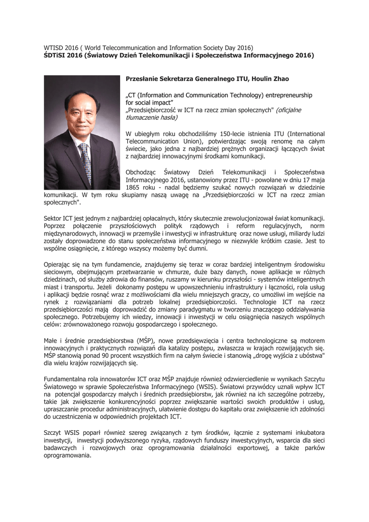 WTISD 2016 ( World Telecommunication and Information Society Day 2016) ŚDTiSI 2016 (Światowy Dzień Telekomunikacji i Społeczeństwa Informacyjnego 2016) Przesłanie Sekretarza Generalnego ITU, Houlin Zhao „CT (Information and Communication Technology) entrepreneurship for social impact” „Przedsiębiorczość w ICT na rzecz zmian społecznych" (oficjalne tłumaczenie hasła) W ubiegłym roku obchodziliśmy 150-lecie istnienia ITU (International Telecommunication Union), potwierdzając swoją renomę na całym świecie, jako jedna z najbardziej prężnych organizacji łączących świat z najbardziej innowacyjnymi środkami komunikacji. Obchodząc Światowy Dzień Telekomunikacji i Społeczeństwa Informacyjnego 2016, ustanowiony przez ITU - powołane w dniu 17 maja 1865 roku - nadal będziemy szukać nowych rozwiązań w dziedzinie komunikacji. W tym roku skupiamy naszą uwagę na „Przedsiębiorczości w ICT na rzecz zmian społecznych". Sektor ICT jest jednym z najbardziej opłacalnych, który skutecznie zrewolucjonizował świat komunikacji. Poprzez połączenie przyszłościowych polityk rządowych i reform regulacyjnych, norm międzynarodowych, innowacji w przemyśle i inwestycji w infrastrukturę oraz nowe usługi, miliardy ludzi zostały doprowadzone do stanu społeczeństwa informacyjnego w niezwykle krótkim czasie. Jest to wspólne osiągnięcie, z którego wszyscy możemy być dumni. Opierając się na tym fundamencie, znajdujemy się teraz w coraz bardziej inteligentnym środowisku sieciowym, obejmującym przetwarzanie w chmurze, duże bazy danych, nowe aplikacje w różnych dziedzinach, od służby zdrowia do finansów, ruszamy w kierunku przyszłości - systemów inteligentnych miast i transportu. Jeżeli dokonamy postępu w upowszechnieniu infrastruktury i łączności, rola usług i aplikacji będzie rosnąć wraz z możliwościami dla wielu mniejszych graczy, co umożliwi im wejście na rynek z rozwiązaniami dla potrzeb lokalnej przedsiębiorczości. Technologie ICT na rzecz przedsiębiorczości mają doprowadzić do zmiany paradygmatu w tworzeniu znaczącego oddziaływania społecznego. Potrzebujemy ich wiedzy, innowacji i inwestycji w celu osiągnięcia naszych wspólnych celów: zrównoważonego rozwoju gospodarczego i społecznego. Małe i średnie przedsiębiorstwa (MŚP), nowe przedsięwzięcia i centra technologiczne są motorem innowacyjnych i praktycznych rozwiązań dla katalizy postępu, zwłaszcza w krajach rozwijających się. MŚP stanowią ponad 90 procent wszystkich firm na całym świecie i stanowią „drogę wyjścia z ubóstwa" dla wielu krajów rozwijających się. Fundamentalna rola innowatorów ICT oraz MŚP znajduje również odzwierciedlenie w wynikach Szczytu Światowego w sprawie Społeczeństwa Informacyjnego (WSIS). Światowi przywódcy uznali wpływ ICT na potencjał gospodarczy małych i średnich przedsiębiorstw, jak również na ich szczególne potrzeby, takie jak zwiększenie konkurencyjności poprzez zwiększanie wartości swoich produktów i usług, upraszczanie procedur administracyjnych, ułatwienie dostępu do kapitału oraz zwiększenie ich zdolności do uczestniczenia w odpowiednich projektach ICT. Szczyt WSIS poparł również szereg związanych z tym środków, łącznie z systemami inkubatora inwestycji, inwestycji podwyższonego ryzyka, rządowych funduszy inwestycyjnych, wsparcia dla sieci badawczych i rozwojowych oraz oprogramowania działalności exportowej, a także parków oprogramowania. Jako wyspecjalizowana agenda Organizacji Narodów Zjednoczonych, mająca do czynienia z najnowocześniejszą telekomunikacją oraz technologiami informacyjnymi i komunikacyjnymi, wzywam naszych partnerów - rządy, przemysł, środowiska akademickie i ekspertów technicznych – do promowania roli małych, młodych i innowacyjnych firm w sektorze ICT; zachęcam do rozpowszechniania cyfrowych innowacji społecznych; priorytetów polityki gospodarczej, które promują innowacje; zapewnienia niezbędnej dostępności dla ludzkości; wspierania tworzenia kompleksowych ekosystemów przedsiębiorczości, a także pomocy przedsiębiorcom w przejściu od idei i innowacji, do sprzedaży i osiągania przychodów. Połączmy nasze siły, aby wspólnie wykorzystać rolę ICT, jako katalizatora w osiąganiu zrównoważonego rozwoju, który ma wpływ na tempo wzrostu gospodarczego, integrację społeczną i równowagę środowiskową. Jest kluczem do zapewnienia lepszej przyszłości dla nas wszystkich. Tłumaczenie z jęz. angielskiego: Anna Dzięcioł – Dział Naukowy Biura SEP
