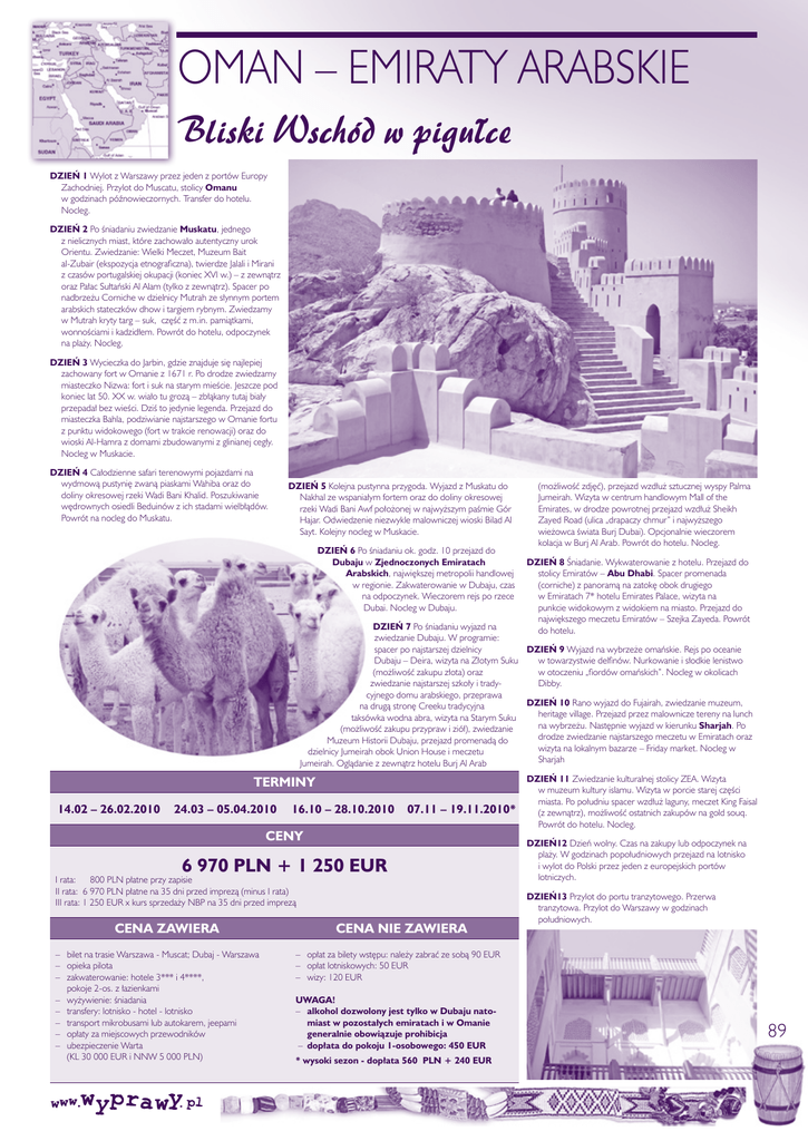 OMAN – EMIRATY ARABSKIE Bliski Wschód w pigu∏ce DZIE¡ 1 Wylot z Warszawy przez jeden z portów Europy Zachodniej. Przylot do Muscatu, stolicy Omanu w godzinach póênowieczornych. Transfer do hotelu. Nocleg. DZIE¡ 2 Po Êniadaniu zwiedzanie Muskatu, jednego z nielicznych miast, które zachowa∏o autentyczny urok Orientu. Zwiedzanie: Wielki Meczet, Muzeum Bait al-Zubair (ekspozycja etnograficzna), twierdze Jalali i Mirani z czasów portugalskiej okupacji (koniec XVI w.) – z zewnàtrz oraz Pa∏ac Su∏taƒski Al Alam (tylko z zewnàtrz). Spacer po nadbrze˝u Corniche w dzielnicy Mutrah ze s∏ynnym portem arabskich stateczków dhow i targiem rybnym. Zwiedzamy w Mutrah kryty targ – suk, cz´Êç z m.in. pamiàtkami, wonnoÊciami i kadzid∏em. Powrót do hotelu, odpoczynek na pla˝y. Nocleg. DZIE¡ 3 Wycieczka do Jarbin, gdzie znajduje si´ najlepiej zachowany fort w Omanie z 1671 r. Po drodze zwiedzamy miasteczko Nizwa: fort i suk na starym mieÊcie. Jeszcze pod koniec lat 50. XX w. wia∏o tu grozà – zb∏àkany tutaj bia∏y przepada∏ bez wieÊci. DziÊ to jedynie legenda. Przejazd do miasteczka Bahla, podziwianie najstarszego w Omanie fortu z punktu widokowego (fort w trakcie renowacji) oraz do wioski Al-Hamra z domami zbudowanymi z glinianej ceg∏y. Nocleg w Muskacie. DZIE¡ 4 Ca∏odzienne safari terenowymi pojazdami na wydmowà pustyni´ zwanà piaskami Wahiba oraz do doliny okresowej rzeki Wadi Bani Khalid. Poszukiwanie w´drownych osiedli Beduinów z ich stadami wielb∏àdów. Powrót na nocleg do Muskatu. DZIE¡ 5 Kolejna pustynna przygoda. Wyjazd z Muskatu do Nakhal ze wspania∏ym fortem oraz do doliny okresowej rzeki Wadi Bani Awf po∏o˝onej w najwy˝szym paÊmie Gór Hajar. Odwiedzenie niezwykle malowniczej wioski Bilad Al Sayt. Kolejny nocleg w Muskacie. DZIE¡ 6 Po Êniadaniu ok. godz. 10 przejazd do Dubaju w Zjednoczonych Emiratach Arabskich, najwi´kszej metropolii handlowej w regionie. Zakwaterowanie w Dubaju, czas na odpoczynek. Wieczorem rejs po rzece Dubai. Nocleg w Dubaju. (mo˝liwoÊç zdj´ç), przejazd wzd∏u˝ sztucznej wyspy Palma Jumeirah. Wizyta w centrum handlowym Mall of the Emirates, w drodze powrotnej przejazd wzd∏u˝ Sheikh Zayed Road (ulica „drapaczy chmur” i najwy˝szego wie˝owca Êwiata Burj Dubai). Opcjonalnie wieczorem kolacja w Burj Al Arab. Powrót do hotelu. Nocleg. DZIE¡ 8 Âniadanie. Wykwaterowanie z hotelu. Przejazd do stolicy Emiratów – Abu Dhabi. Spacer promenada (corniche) z panoramà na zatok´ obok drugiego w Emiratach 7* hotelu Emirates Palace, wizyta na punkcie widokowym z widokiem na miasto. Przejazd do najwi´kszego meczetu Emiratów – Szejka Zayeda. Powrót do hotelu. DZIE¡ 7 Po Êniadaniu wyjazd na zwiedzanie Dubaju. W programie: spacer po najstarszej dzielnicy Dzie¡ 9 Wyjazd na wybrze˝e omaƒskie. Rejs po oceanie Dubaju – Deira, wizyta na Z∏otym Suku w towarzystwie delfinów. Nurkowanie i s∏odkie lenistwo (mo˝liwoÊç zakupu z∏ota) oraz w otoczeniu „fiordów omaƒskich”. Nocleg w okolicach zwiedzanie najstarszej szko∏y i tradyDibby. cyjnego domu arabskiego, przeprawa DZIE¡ 10 Rano wyjazd do Fujairah, zwiedzanie muzeum, na drugà stron´ Creeku tradycyjna heritage village. Przejazd przez malownicze tereny na lunch taksówka wodna abra, wizyta na Starym Suku na wybrze˝u. Nast´pnie wyjazd w kierunku Sharjah. Po (mo˝liwoÊç zakupu przypraw i zió∏), zwiedzanie drodze zwiedzanie najstarszego meczetu w Emiratach oraz Muzeum Historii Dubaju, przejazd promenadà do wizyta na lokalnym bazarze – Friday market. Nocleg w dzielnicy Jumeirah obok Union House i meczetu Sharjah Jumeirah. Oglàdanie z zewnàtrz hotelu Burj Al Arab TERMINY 14.02 – 26.02.2010 24.03 – 05.04.2010 16.10 – 28.10.2010 07.11 – 19.11.2010* CENY 6 970 PLN + 1 250 EUR I rata: 800 PLN p∏atne przy zapisie II rata: 6 970 PLN p∏atne na 35 dni przed imprezà (minus I rata) III rata: 1 250 EUR x kurs sprzeda˝y NBP na 35 dni przed imprezà CENA ZAWIERA – bilet na trasie Warszawa - Muscat; Dubaj - Warszawa – opieka pilota – zakwaterowanie: hotele 3*** i 4****, pokoje 2-os. z ∏azienkami – wy˝ywienie: Êniadania – transfery: lotnisko - hotel - lotnisko – transport mikrobusami lub autokarem, jeepami – op∏aty za miejscowych przewodników – ubezpieczenie Warta (KL 30 000 EUR i NNW 5 000 PLN) CENA NIE ZAWIERA DZIE¡ 11 Zwiedzanie kulturalnej stolicy ZEA. Wizyta w muzeum kultury islamu. Wizyta w porcie starej cz´Êci miasta. Po po∏udniu spacer wzd∏u˝ laguny, meczet King Faisal (z zewnàtrz), mo˝liwoÊç ostatnich zakupów na gold souq. Powrót do hotelu. Nocleg. DZIE¡12 Dzieƒ wolny. Czas na zakupy lub odpoczynek na pla˝y. W godzinach popo∏udniowych przejazd na lotnisko i wylot do Polski przez jeden z europejskich portów lotniczych. DZIE¡13 Przylot do portu tranzytowego. Przerwa tranzytowa. Przylot do Warszawy w godzinach po∏udniowych. – op∏at za bilety wst´pu: nale˝y zabraç ze sobà 90 EUR – op∏at lotniskowych: 50 EUR – wizy: 120 EUR UWAGA! – alkohol dozwolony jest tylko w Dubaju natomiast w pozosta∏ych emiratach i w Omanie generalnie obowiàzuje prohibicja – dop∏ata do pokoju 1-osobowego: 450 EUR * wysoki sezon - dop∏ata 560 PLN + 240 EUR 89