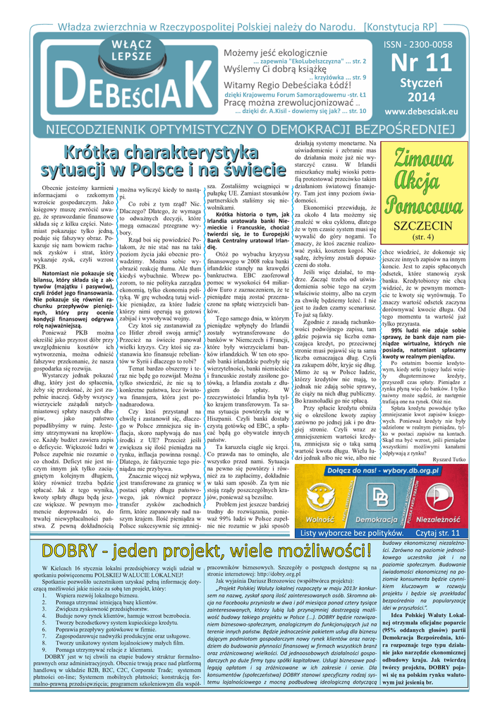 ... Obecnie jesteśmy karmieni informacjami o rzekomym wzroście gospodarczym. Jako księgowy muszę zwrócić uwagę, że sprawozdanie finansowe składa się z kilku części. Natomiast pokazując tylko jedną, podaje się fałszywy obraz. Pokazuje się nam bowiem rachunek zysków i strat, który wykazuje zysk, czyli wzrost PKB. Ponieważ PKB można określić jako przyrost dóbr przy uwzględnieniu kosztów ich wytworzenia, można odnieść fałszywe przekonanie, że nasza gospodarka się rozwija. Wystarczy jednak pokazać dług, który jest do spłacenia, żeby się przekonać, że jest zupełnie inaczej. Gdyby wszyscy wierzyciele zażądali natychmiastowej spłaty naszych długów, jako państwo popadlibyśmy w ruinę. Jesteśmy utrzymywani na kroplówce. Każdy budżet zawiera zapis o deficycie. Większość ludzi w Polsce zupełnie nie rozumie o co chodzi. Deficyt nie jest niczym innym jak tylko zaciągniętym kolejnym długiem, który również trzeba będzie spłacać. Jak z tego wynika, kwoty spłaty długu będą jeszcze większe. W pewnym momencie doprowadzi to, do trwałej niewypłacalności państwa. Z pewną dokładnością można wyliczyć kiedy to nastąpi. Co robi z tym rząd? Nic. Dlaczego? Dlatego, że wymaga to odważnych decyzji, które mogą oznaczać przegrane wybory. Rząd boi się powiedzieć Polakom, że nie stać nas na taki poziom życia jaki obecnie prowadzimy. Można sobie wyobrazić reakcję tłumu. Ale tłum kiedyś wybuchnie. Wbrew pozorom, to nie polityka zarządza ekonomią, tylko ekonomia polityką. W grę wchodzą tutaj wielkie pieniądze, za które ludzie którzy nimi operują są gotowi zabijać i wywoływać wojny. Czy ktoś się zastanawiał za co Hitler zbroił swoją armię? Przecież na świecie panował wielki kryzys. Czy ktoś się zastanawia kto finansuje rebeliantów w Syrii i dlaczego to robi? Temat bardzo obszerny i teraz nie będę go rozwijał. Można tylko stwierdzić, że nie są to konkretne państwa, lecz światowa finansjera, która jest ponadnarodowa. Czy ktoś przystanął na chwilę i zastanowił się, dlaczego w Polsce zmniejsza się inflacja, skoro napływają do nas środki z UE? Przecież jeśli zwiększa się ilość pieniądza na rynku, inflacja powinna rosnąć. Dlatego, że faktycznie tego pieniądza nie przybywa. Znacznie więcej niż wpływa, jest transferowane za granicę w postaci spłaty długu państwowego, jak również poprzez transfer zysków zachodnich firm, które zapanowały nad naszym krajem. Ilość pieniądza w Polsce sukcesywnie się zmniej- sza. Zostaliśmy wciągnięci w pułapkę UE. Zamiast stosunków partnerskich staliśmy się niewolnikami. Otóż po wybuchu kryzysu finansowego w 2008 roku banki irlandzkie stanęły na krawędzi bankructwa. EBC zaoferował pomoc w wysokości 64 miliardów Euro z zaznaczeniem, że te pieniądze mają zostać przeznaczone na spłatę wierzycieli banków. Tego samego dnia, w którym pieniądze wpłynęły do Irlandii zostały wytransferowane do banków w Niemczech i Francji, które były wierzycielami banków irlandzkich. W ten oto sposób banki irlandzkie pozbyły się wierzytelności, banki niemieckie i francuskie zostały zasilone gotówką, a Irlandia została z długiem do spłaty. W rzeczywistości Irlandia była tylko krajem transferowym. Ta sama sytuacja powtórzyła się w Hiszpanii. Czyli banki dostały czystą gotówkę od EBC, a spłacać będą go obywatele innych państw. Ta karuzela ciągle się kręci. Co prawda nas to ominęło, ale wszystko przed nami. Sytuacja na pewno się powtórzy i również za to zapłacimy, dokładnie w taki sam sposób. Za tym nie stoją rządy poszczególnych krajów, ponieważ są bezsilne. Problem jest jeszcze bardziej trudny do rozwiązania, ponieważ 99% ludzi w Polsce zupełnie nie rozumie w jaki sposób działają systemy monetarne. Na uświadomienie i zebranie mas do działania może już nie wystarczyć czasu. W Irlandii mieszkańcy małej wioski potrafią protestować przeciwko takim działaniom światowej finansjery. Tam jest inny poziom świadomości. Ekonomiści przewidują, że za około 4 lata możemy się znaleźć w oku cyklonu, dlatego że w tym czasie system musi się wywalić do góry nogami. To znaczy, że ktoś zacznie realizować zyski, kosztem kogoś. Nie sądzę, żebyśmy zostali dopuszczeni do stołu. Jeśli więc działać, to mądrze. Zacząć trzeba od uświadomienia sobie tego na czym właściwie stoimy, albo na czym za chwilę będziemy leżeć. I nie jest to żaden czarny scenariusz. To już są fakty. Zgodnie z zasadą rachunkowości podwójnego zapisu, tam gdzie pojawia się liczba oznaczająca kredyt, po przeciwnej stronie musi pojawić się ta sama liczba oznaczająca dług. Czyli za zakupem dóbr, kryje się dług. Mimo że są w Polsce ludzie, którzy kredytów nie mają, to jednak nie zdają sobie sprawy, że ciąży na nich dług publiczny. Bo krasnoludki go nie spłacą. Przy spłacie kredytu obniża się o określone kwoty zapisy zarówno po jednej jak i po drugiej stronie. Czyli wraz ze zmniejszeniem wartości kredytu, zmniejsza się o taką samą wartość kwota długu. Wielu ludzi jednak albo nie wie, albo nie Zimowa Akcja Pomocowa SZCZECIN (str. 4) chce wiedzieć, że dokonuje się jeszcze innych zapisów na innym koncie. Jest to zapis spłaconych odsetek, które stanowią zysk banku. Kredytobiorcy nie chcą widzieć, że w pewnym momencie te kwoty się wyrównują. To znaczy wartość odsetek zaczyna dorównywać kwocie długu. Od tego momentu ta wartość już tylko przyrasta. Po ostatnim boomie kredytowym, kiedy setki tysięcy ludzi wzięły długoterminowe kredyty, przyszedł czas spłaty. Pieniądze z rynku płyną więc do banków. I tylko naiwny może sądzić, że następnie trafiają one na rynek. Otóż nie. Spłata kredytu powoduje tylko zmniejszanie kwot zapisów księgowych. Ponieważ kredyty nie były udzielone w realnym pieniądzu, tylko w postaci zapisów na kontac
