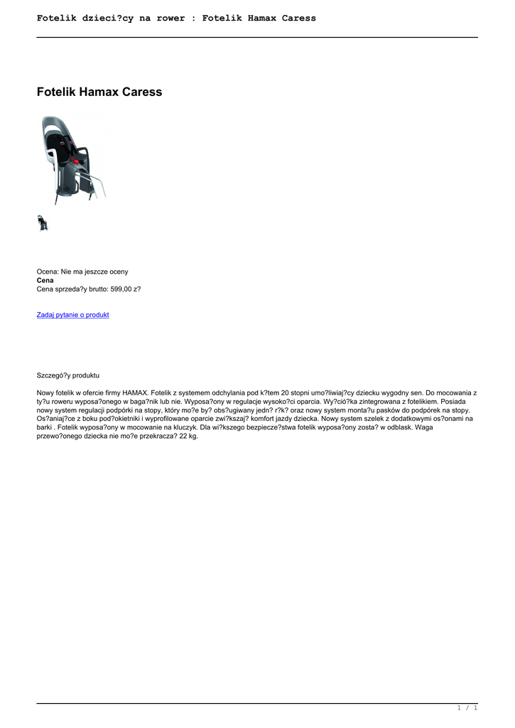 Fotelik dzieci?cy na rower : Fotelik Hamax Caress Fotelik Hamax Caress Ocena: Nie ma jeszcze oceny Cena Cena sprzeda?y brutto: 599,00 z? Zadaj pytanie o produkt Szczegó?y produktu Nowy fotelik w ofercie firmy HAMAX. Fotelik z systemem odchylania pod k?tem 20 stopni umo?liwiaj?cy dziecku wygodny sen. Do mocowania z ty?u roweru wyposa?onego w baga?nik lub nie. Wyposa?ony w regulacje wysoko?ci oparcia. Wy?ció?ka zintegrowana z fotelikiem. Posiada nowy system regulacji podpórki na stopy, który mo?e by? obs?ugiwany jedn? r?k? oraz nowy system monta?u pasków do podpórek na stopy. Os?aniaj?ce z boku pod?okietniki i wyprofilowane oparcie zwi?kszaj? komfort jazdy dziecka. Nowy system szelek z dodatkowymi os?onami na barki . Fotelik wyposa?ony w mocowanie na kluczyk. Dla wi?kszego bezpiecze?stwa fotelik wyposa?ony zosta? w odblask. Waga przewo?onego dziecka nie mo?e przekracza? 22 kg. 1 / 1 Powered by TCPDF (www.tcpdf.org)