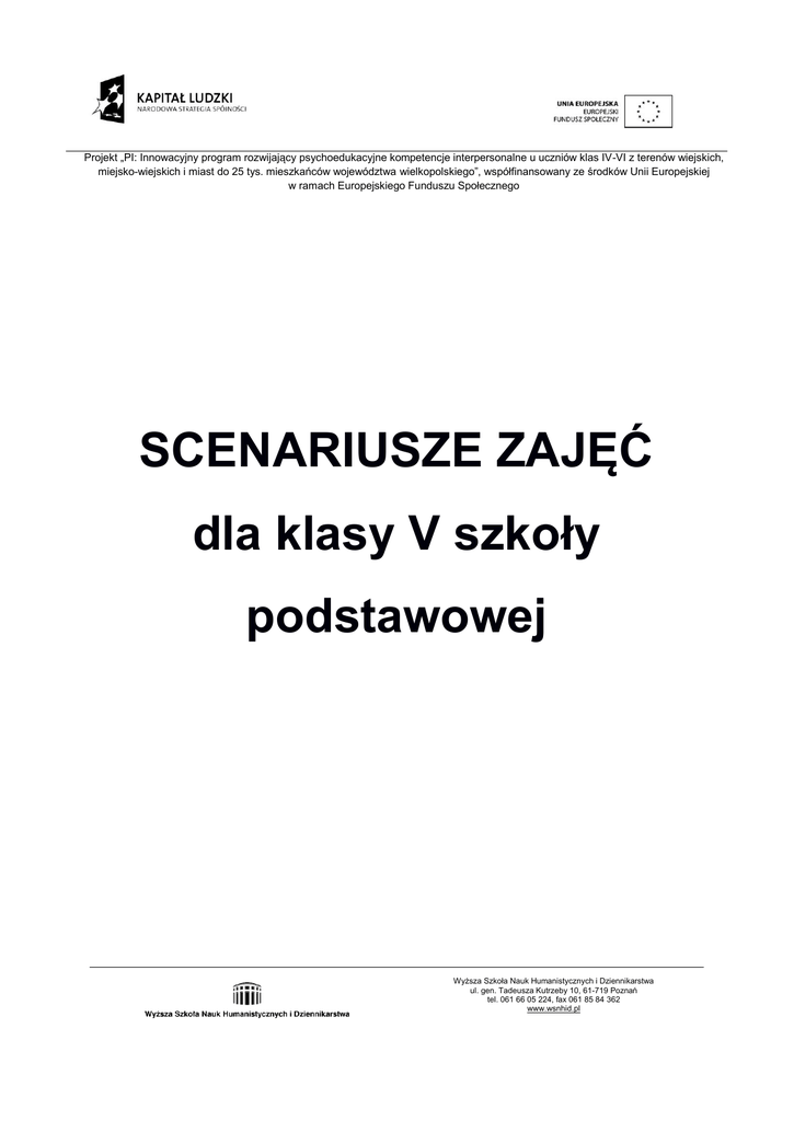 Projekt „PI: Innowacyjny program rozwijający psychoedukacyjne kompetencje interpersonalne u uczniów klas IV-VI z terenów wiejskich, miejsko-wiejskich i miast do 25 tys. mieszkańców województwa wielkopolskiego”, współfinansowany ze środków Unii Europejskiej w ramach Europejskiego Funduszu Społecznego SCENARIUSZE ZAJĘĆ dla klasy V szkoły podstawowej Wyższa Szkoła Nauk Humanistycznych i Dziennikarstwa ul. gen. Tadeusza Kutrzeby 10, 61-719 Poznań tel. 061 66 05 224, fax 061 85 84 362 www.wsnhid.pl Projekt „PI: Innowacyjny program rozwijający psychoedukacyjne kompetencje interpersonalne u uczniów klas IV-VI z terenów wiejskich, miejsko-wiejskich i miast do 25 tys. mieszkańców województwa wielkopolskiego”, współfinansowany ze środków Unii Europejskiej w ramach Europejskiego Funduszu Społecznego Spis treści Wstęp 1. Warsztaty komunikacji interpersonalnej 2. Warsztaty współdziałania i współpracy zespołowej, czyli w jedności siła 3. Trening nabywania pewności siebie, czyli jak stać się Herkulesem? 4. Warsztaty kompetencji adaptacyjnych, czyli 8 kroków do zmiany siebie w sytuacji zmiany 5. Trening sprawnego zarządzania sobą, czyli zostań swoim menedżerem 6. Trening rozwijania kompetencji poznawczych, czyli nieznane jako znane – słów kilka o konstruowaniu wiedzy i logicznym myśleniu 7. Warsztaty budowania motywacji, czyli chcieć to móc 8. Warsztaty doskonalenia kompetencji kulturowych i aksjologicznych, czyli o istnieniu w kulturze 9. Trening innowacyjności i twórczego myślenia, czyli jak zrobić z igły widły? Strona 2 10. Warsztaty rozwijające kompetencje związane z budowaniem kapitału ludzkiego, czyli klasa szkolna jako organizacja ucząca się Wyższa Szkoła Nauk Humanistycznych i Dziennikarstwa ul. gen. Tadeusza Kutrzeby 10, 61-719 Poznań tel. 061 66 05 224, fax 061 85 84 362 www.wsnhid.pl Projekt „PI: Innowacyjny program rozwijający psychoedukacyjne kompetencje interpersonalne u uczniów klas IV-VI z terenów wiejskich, miejsko-wiejskich i miast do 25 tys. mieszkańców województwa wielkopolskiego”, współfinansowany ze środków Unii Europejskiej w ramach Europejskiego Funduszu Społecznego Wstęp O potrzebie dobrze przemyślanego programu wychowawczego w szkole nie trzeba nikogo przekonywać. Jako nauczyciele doskonale zdajemy sobie sprawę z tego, że środowisko szkolne odgrywa kluczową rolę w rozwoju psychospołecznym młodego człowieka, a odpowiednio przez nas realizowana praca wychowawcza może mieć istotny wpływ na wzmocnienie podstawowych kompetencji społecznych uczniów. Kim będą w przyszłości, jak sobie poradzą z wyzwaniami, które postawi przed nimi coraz szybciej modernizujące się otoczenie, czy będą potrafili skutecznie się komunikować z innymi, rozwiązywać konflikty, tworzyć dobrze prosperujące zespoły, kreatywnie rozwiązywać problemy i wreszcie – doceniać różnorodność oraz akceptować wielorakość punktów widzenia? Czy będą potrafili rozpoznać swoje mocne i słabe strony, zidentyfikować podstawowy katalog wartości, według których trzeba tworzyć własny kodeks postępowania? I wreszcie, czy będą umieli rozpoznawać i kontrolować swoje emocje, a dzięki temu lepiej funkcjonować w relacjach interpersonalnych? Rozwój osobisty to proces, któremu – jako wychowawcy – możemy nadać odpowiedni kształt, prowadząc naszych uczniów przez trudny labirynt emocji, relacji i autorefleksji. Każdy scenariusz składa się ze wstępu, w którym wskazane są konkretne kompetencje, będące przedmiotem zajęć, oraz opisu ćwiczeń i szacunkowego czasu potrzebnego na ich przeprowadzenie. Dodatkowo podana jest także instrukcja do ćwiczenia wraz z pytaniami podsumowującymi, które są ważnym elementem ewaluacyjnym każdych zajęć. Ponadto wszystkie ćwiczenia są uzupełnione o konieczne załączniki, komentarze oraz uwagi, które mają ułatwić nauczycielom przygotowanie do zajęć. Kolejność zaproponowanych scenariuszy też nie jest przypadkowa. Zajęcia są bowiem tak opracowane, aby w ich toku uczniowie mogli stopniowo rozwijać swoje kompetencje, zaczynając od radzenia sobie z emocjami, poprzez umiejętności komunikacji interpersonalnej, współpracy w grupie, organizacji i planowania oraz wspólnego Wyższa Szkoła Nauk Humanistycznych i Dziennikarstwa ul. gen. Tadeusza Kutrzeby 10, 61-719 Poznań tel. 061 66 05 224, fax 061 85 84 362 www.wsnhid.pl Strona 3 Zaproponowane w tym rozdziale scenariusze zajęć wychowawczych zostały zaprojektowane specjalnie z myślą o uczniach klas IV-VI szkoły podstawowej, a więc dzieciach w wieku 9-12 lat. Ich podstawowym walorem jest zastosowanie najbardziej skutecznej metody w pracy z młodym człowiekiem, jaką jest nauka przez działanie i interakcje w grupie. Zawarte tu ćwiczenia nie tylko dają nauczycielom ważne narzędzie metodologiczne, ale także stanowią źródło dobrej zabawy dla dzieci. Warto też podkreślić, że ich selekcja na potrzeby niniejszej publikacji nie była przypadkowa. Jest to owoc wieloletniej pracy wychowawczej i psychologicznej autorów tego skryptu, którzy mogli wykorzystać swoje doświadczenie zdobyte podczas pracy w charakterze trenerów i instruktorów w wielu projektach i programach dla młodzieży. Dzięki temu niniejsze scenariusze mają wymiar bardzo praktyczny, dając nauczycielom proste narzędzie do wykorzystania podczas lekcji wychowawczej. Projekt „PI: Innowacyjny program rozwijający psychoedukacyjne kompetencje interpersonalne u uczniów klas IV-VI z terenów wiejskich, miejsko-wiejskich i miast do 25 tys. mieszkańców województwa wielkopolskiego”, współfinansowany ze środków Unii Europejskiej w ramach Europejskiego Funduszu Społecznego realizowania projektów grupowych, na wykorzystaniu wszystkich kompetencji kluczowych kończąc. Tematyka zajęć oraz poziom trudności ćwiczeń są dostosowane do wieku uczestników. Zdając sobie sprawę z różnych możl