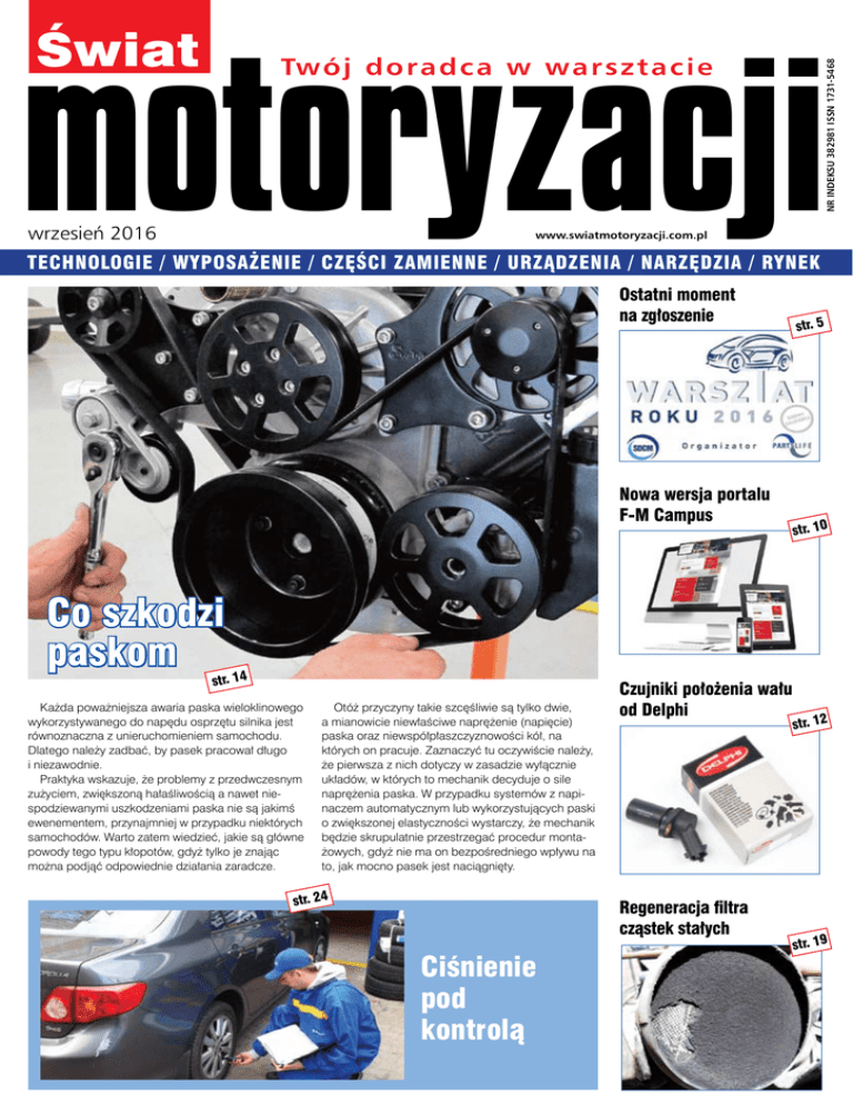 Świat motoryzacji wrzesień 2016 NR INDEKSU 382981 ISSN 1731-5468 Tw ó j d o r a d c a w w a r s z t a c i e www.swiatmotoryzacji.com.pl TECHNOLOGIE / WYPOSAŻENIE / CZĘŚCI ZAMIENNE / URZĄDZENIA / NARZĘDZIA / RYNEK Ostatni moment na zgłoszenie Nowa wersja portalu F-M Campus Co szkodzi paskom str. 14 Każda poważniejsza awaria paska wieloklinowego wykorzystywanego do napędu osprzętu silnika jest równoznaczna z unieruchomieniem samochodu. Dlatego należy zadbać, by pasek pracował długo i niezawodnie. Praktyka wskazuje, że problemy z przedwczesnym zużyciem, zwiększoną hałaśliwością a nawet niespodziewanymi uszkodzeniami paska nie są jakimś ewenementem, przynajmniej w przypadku niektórych samochodów. Warto zatem wiedzieć, jakie są główne powody tego typu kłopotów, gdyż tylko je znając można podjąć odpowiednie działania zaradcze. Otóż przyczyny takie szcęśliwie są tylko dwie, a mianowicie niewłaściwe naprężenie (napięcie) paska oraz niewspółpłaszczyznowości kół, na których on pracuje. Zaznaczyć tu oczywiście należy, że pierwsza z nich dotyczy w zasadzie wyłącznie układów, w których to mechanik decyduje o sile naprężenia paska. W przypadku systemów z napinaczem automatycznym lub wykorzystujących paski o zwiększonej elastyczności wystarczy, że mechanik będzie skrupulatnie przestrzegać procedur montażowych, gdyż nie ma on bezpośredniego wpływu na to, jak mocno pasek jest naciągnięty. str. 24 Czujniki położenia wału od Delphi Regeneracja filtra cząstek stałych Ciśnienie pod kontrolą str. 5 str. 10 str. 12 str. 19 WIADOMOŚCI Grzegorz Kacalski WIESZCZ MOTORYZACJI Obchodzimy w tym miesiącu 95. rocznicę urodzin Stanisława Lema, znakomitego pisarza, a zarazem jednego z nielicznych polskich twórców znanych na całym świecie. Wspominamy go, gdyż nie tylko był wielkim miłośnikiem motoryzacji, ale również udanie próbował przewidzieć jej przyszłość. Mało kto wie, że Lem osobiście obsługiwał swoje auta. Był zresztą nie tylko mechanikiem amatorem, ale również jednym z pionierów indywidualnego importu części. Zajął się nim, kiedy został posiadaczem Fiata 1800. Włoskie auto się psuło, a części do niego były w Polsce praktycznie niedostępne. Pisarz prywatnie sprowadzał więc potrzebne elementy, a pomagała mu w tym inna sława polskiej literatury – Sławomir Mrożek, który akurat w owym czasie mieszkał we Włoszech. Lem był cenionym futurologiem. Jego prognozy sprzed pół wieku, dotyczące rozwoju technologii okazały się zadziwiająco trafne. Pisarz przewidział to, co dziś nazywamy rzeczywistością wirtualną. Ziściły się również motoryzacyjne proroctwa Lema. O zaawansowanych elektronicznych systemach wspomagania nazwanych przez niego „fantomatyką samochodową” pisał w czasach, kiedy technologicznym osiągnięciem było wspomaganie kierownicy. Pewnie niektórym ówczesnym czytelnikom wydawało się, że Lem nadmiernie pofolgował fantazji, kiedy pisał: „postępy mogą doprowadzić do powstania syntetycznych kierowców, bardziej niezawodnych od ludzi, co będzie kolejnym ruchem na drodze ku stworzeniu sztucznej inteligencji”. Tymczasem autonomiczne samochody już jeżdżą i to co wydawało się mrzonką, stało się faktem. Trawestując słowa innego wielkiego polskiego pisarza, można powiedzieć: Lem wielkim pisarzem był. Wieszczem był i wieszczył. MOBILNY TESTER ponownie w Polsce W lipcu po raz pierwszy w historii przyjechał do Polski mobilny tester zawieszenia firmy BILSTEIN. Badania przy jego użyciu były prowadzone w wybranych serwisach samochodowych na terenie całej Polski. Zainteresowanie nimi przeszło najśmielsze założenia, zapadła więc decyzja o ponownym sprowadzeniu do Polski urządzenia. Udało się to wyjątkowo szybko i oto trwa właśnie druga tura akcji. Również tym razem badania są bezpłatne, zaś zapisów dokonują serwisy samochodowe goszczące tester. Gdzie i kiedy się on pojawi sprawdzić można na stronie http://www.bilstein-amortyzatory.pl w zakładce aktualności. - Prowadzone przez nas badania zawieszenia składają się z dwóch części. Najpierw na podnośniku oceniany jest stan amortyzatorów oraz elementów łączących koła z samochodem, później praca zawieszenia poddawana NOWE KOMPRESORY od DENSO Oferta sprężarek klimatyzacji DENSO dostępnych na rynku części zamiennych powiększyła się o 25 modeli kompresorów. Znajdują one zastosowanie w samochodach takich marek jak Audi, Lexus, Mercedes, Subaru, Toyota i VW. CZUJNIKI ABE jest obciążeniom na platformie mobilnego testera - mówi Andrzej Wojciech Buczek, doradca techniczny w firmie IHR. - Każde badanie udokumentowane jest szczegółowym wydrukiem z wynikami, które omawiamy razem z właścicielem samochodu. Doradzamy przy tym, jak dalej dbać o amortyzatory, a w przypadku gorszych wyników przedstawiamy listę elementów do wymiany. Warto wspomnieć, że wbrew temu czego się spodziewano, pierwsza tura badań mobilnym testerem zawieszenia wykazała, że w 90% sprawdzonych samochodów amortyzatory były sprawne! W praktyce przekłada się to nie tylko na lepszy komfort jazd, ale i większej jej bezpieczeństwo. DENSO należy do czołowych producentów sprężarek klimatyzacji na świecie i ma aż 40% udziałów w rynku. W ofercie kompresorów DENSO przeznaczonych na rynek wtórny dostępne są sprężarki tłokowe ze stałym lub zmiennym skokiem cylindrów (10PA, 10S, 7SBU, SE), sprężarki rotacyjne (łopatkowe i śrubowe) – z łopatkami wysuwnymi (SV), ze stałymi łopatkami (TV), sprężarki spiralne (SC) oraz elektryczne stosowane w autach hybrydowych (ES). Wszystkie kompresory DENSO trafiające na rynek części zamiennych są nowe (bez części regenerowanych), dostarczane jako kompletne jednostki wstępnie wypełnione odpowiednią ilością właściwego oleju. Więcej informacji o sprężarkach klimatyzacji DENSO można znaleźć na stroni