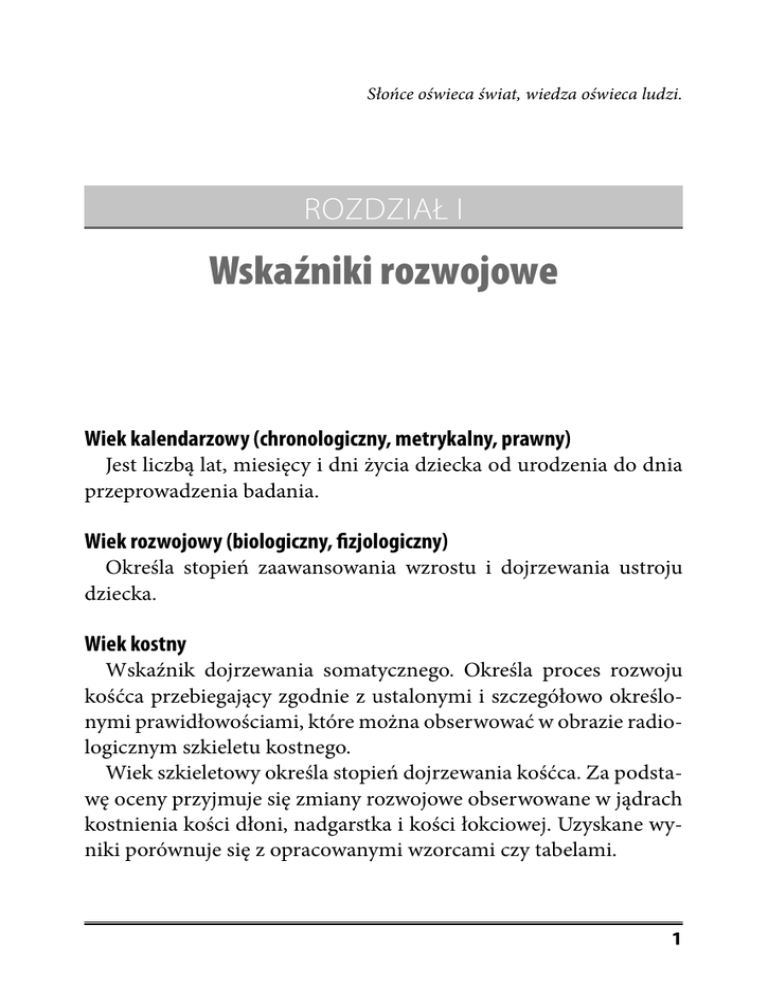 Słońce oświeca świat, wiedza oświeca ludzi. ROZDZIAŁ I Wskaźniki rozwojowe Wiek kalendarzowy (chronologiczny, metrykalny, prawny) Jest liczbą lat, miesięcy i dni życia dziecka od urodzenia do dnia przeprowadzenia badania. Wiek rozwojowy (biologiczny, fizjologiczny) Określa stopień zaawansowania wzrostu i dojrzewania ustroju dziecka. Wiek kostny Wskaźnik dojrzewania somatycznego. Określa proces rozwoju kośćca przebiegający zgodnie z ustalonymi i szczegółowo określonymi prawidłowościami, które można obserwować w obrazie radiologicznym szkieletu kostnego. Wiek szkieletowy określa stopień dojrzewania kośćca. Za podstawę oceny przyjmuje się zmiany rozwojowe obserwowane w jądrach kostnienia kości dłoni, nadgarstka i kości łokciowej. Uzyskane wyniki porównuje się z opracowanymi wzorcami czy tabelami. 1 Zbiór wskaźników stomatologicznych, klasyfikacji i testów Wiek zębowy Określa stopień rozwoju uzębienia w odpowiednim wieku kalendarzowym. Ocenę przeprowadza się na podstawie: a) badania klinicznego: wyrzynania poszczególnych zębów, ich liczby, kolejności, porównania wyników z tabelami dla określonego wieku; b) badania radiologicznego określającego dokładnie stopień uformowania korony i korzenia zęba, przy czym ocenę przeprowadza się w formie liczby punktów, które porównuje się ze standardowymi tabelami i wykresami. Klasyfikacja rozwoju zawiązków zębów w okresie zarodkowym i płodowym wg Röse, Eidmanna i Meyera 30-40 dni – zgrubienie nabłonka, utworzy on listewkę zębową, chrząstka Meckela w trakcie rozwoju. 48 dni – pierwsze zgrubienie listewki zębowej w odcinku przednim, rozwój chrząstki Meckela zakończony. 9 tygodni – w odcinku przednim listewki zębowej zawiązki w stadium czapeczki, zgrubienie listewki zębowej dla pierwszego zęba trzonowego mlecznego. 10 tygodni – zawiązki pierwszych zębów trzonowych mlecznych w stadium czapeczki, zęby sieczne mleczne w stadium pęcherzyka zębowego, drugi ząb trzonowy mleczny w fazie pączka. 3 miesiące – wszystkie zawiązki zębów mlecznych w stadium dojrzałego pęcherzyka zębowego, rozwój listewki zębowej dla zębów trzonowych stałych. 4 miesiące – resorpcja listewki zębowej zębów siecznych i kłów mlecznych, zgrubienie listewki zębowej dla pierwszego zęba trzonowego stałego. 5 miesięcy – ślady mineralizacji szkliwa zębów siecznych mlecznych i pierwszego zęba trzonowego mlecznego, resorpcja 2 Rozdział I • Wskaźniki rozwojowe listewki zębowej zębów trzonowych mlecznych, pierwszy ząb trzonowy stały w stadium czapeczki. 6 miesięcy – ślady mineralizacji kłów i obu zębów trzonowych mlecznych, zęby sieczne stałe w stadium czapeczki, zgrubienie listewki dla kła stałego, pęcherzyk zębowy pierwszego zęba trzonowego stałego dojrzały. 7 miesięcy – guzki wszystkich zębów trzonowych zmineralizowane, torebki zawiązkowe zębów siecznych i kłów stałych widoczne, pęcherzyk zębowy pierwszego zęba trzonowego stałego oddzielony od listewki zębowej. 8 miesięcy – powierzchnie żucia i guzki wszystkich zębów trzonowych mlecznych zmineralizowane. 9 miesięcy – noworodek – mineralizacja całej korony mlecznych przyśrodkowych zębów siecznych i połowy korony zębów siecznych bocznych, ślady mineralizacji pierwszych zębów trzonowych stałych, zawiązek pierwszego zęba przedtrzonowego w stadium pączka. Schemat wieku zębowego na podstawie obrazu radiologicznego wg Moorresa, Fanninga i Hunta Rozwój korony zęba jednokorzeniowego (ryc. 1): Ci – początkowe tworzenie guzka korony zęba; Cco – łączenie się guzków korony zęba; Coc – całkowity zarys kształtu guzków korony zęba; Cr1/2 – 1/2 korony zęba; Cr3/4 – 3/4 korony zęba; Crc – korona w całości utworzona. Ci Cco Coc Cr 1∕2 Cr3∕4 Crc RYC. 1. Rozwój korony zęba jednokorzeniowego. 3 Zbiór wskaźników stomatologicznych, klasyfikacji i testów Tworzenie korzenia zęba jednokorzeniowego (ryc. 2): Ri – początkowa faza tworzenia korzenia; R1/4 – tworzenie zarysów ścian korzenia, ukształtowanie korzenia w 1/4 długości; R1/2 – tworzenie połowy długości korzenia, rozbieżne ściany kanału korzeniowego; R3/4 – tworzenie 3/4 długości korzenia, równoległe ściany kanału korzeniowego; Rc – korzeń całkowicie uformowany. Ri R1∕4 R1∕2 R3∕4 Rc RYC. 2. Tworzenie korzenia zęba jednokorzeniowego. Tworzenie wierzchołka korzenia zęba jednokorzeniowego (ryc. 3): A1/2 – wierzchołek w połowie uformowany; Ac – wierzchołek fizjologiczny zęba całkowicie uformowany. A1∕2 Ac RYC. 3. Tworzenie wierzchołka korzenia zęba jednokorzeniowego. Rozwój korony zęba wielokorzeniowego (ryc. 4): Ci – początkowe tworzenie guzka korony zęba; Cco – łączenie się guzków korony zęba; 4
