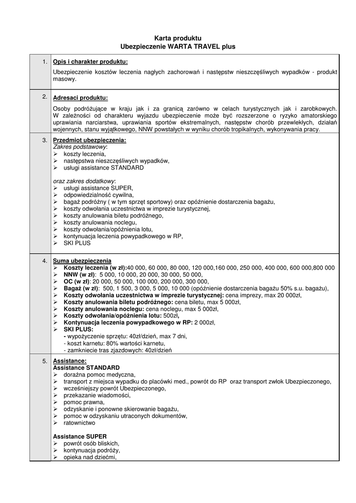 Karta produktu Ubezpieczenie WARTA TRAVEL plus 1. Opis i charakter produktu: Ubezpieczenie kosztów leczenia nagłych zachorowań i następstw nieszczęśliwych wypadków - produkt masowy. 2. Adresaci produktu: Osoby podróżujące w kraju jak i za granicą zarówno w celach turystycznych jak i zarobkowych. W zależności od charakteru wyjazdu ubezpieczenie może być rozszerzone o ryzyko amatorskiego uprawiania narciarstwa, uprawiania sportów ekstremalnych, następstw chorób przewlekłych, działań wojennych, stanu wyjątkowego, NNW powstałych w wyniku chorób tropikalnych, wykonywania pracy. 3. Przedmiot ubezpieczenia: Zakres podstawowy: koszty leczenia, następstwa nieszczęśliwych wypadków, usługi assistance STANDARD oraz zakres dodatkowy: usługi assistance SUPER, odpowiedzialność cywilna, bagaż podróżny ( w tym sprzęt sportowy) oraz opóźnienie dostarczenia bagażu, koszty odwołania uczestnictwa w imprezie turystycznej, koszty anulowania biletu podróżnego, koszty anulowania noclegu, koszty odwołania/opóźnienia lotu, kontynuacja leczenia powypadkowego w RP, SKI PLUS 4. Suma ubezpieczenia Koszty leczenia (w zł):40 000, 60 000, 80 000, 120 000,160 000, 250 000, 400 000, 600 000,800 000 NNW (w zł): 5 000, 10 000, 20 000, 30 000, 50 000, OC (w zł): 20 000, 50 000, 100 000, 200 000, 300 000, Bagaż (w zł): 500, 1 500, 3 000, 5 000, 10 000 (opóźnienie dostarczenia bagażu 50% s.u. bagażu), Koszty odwołania uczestnictwa w imprezie turystycznej: cena imprezy, max 20 000zł, Koszty anulowania biletu podróżnego: cena biletu, max 5 000zł, Koszty anulowania noclegu: cena noclegu, max 5 000zł, Koszty odwołania/opóźnienia lotu: 500zł, Kontynuacja leczenia powypadkowego w RP: 2 000zł, SKI PLUS: - wypożyczenie sprzętu: 40zł/dzień, max 7 dni, - koszt karnetu: 80% wartości karnetu, - zamkniecie tras zjazdowych: 40zł/dzień 5. Assistance: Assistance STANDARD doraźna pomoc medyczna, transport z miejsca wypadku do placówki med., powrót do RP oraz transport zwłok Ubezpieczonego, wcześniejszy powrót Ubezpieczonego, przekazanie wiadomości, pomoc prawna, odzyskanie i ponowne skierowanie bagażu, pomoc w odzyskaniu utraconych dokumentów, ratownictwo Assistance SUPER powrót osób bliskich, kontynuacja podróży, opieka nad dziećmi, zastępczy kierowca, odwiedziny osoby wskazanej, dosłanie niezbędnych przedmiotów osobistych, pomoc finansowa, zakwaterowanie na czas rekonwalescencji, tłumacz 6. Ubezpieczenia dodatkowe: wykonywanie pracy, amatorskie uprawianie narciarstwa, uprawianie sportów ekstremalnych, działania wojenne, stan wyjątkowy, następstwa chorób przewlekłych, NNW powstałych w wyniku chorób tropikalnych 7. Franszyza: franszyza integralna – 100 zł - bagaż podróżny, OC 8. Składka: Płatna przy zawieraniu umowy ubezpieczenia 9. Okres ochrony: Od 1 dnia do roku 10. Zniżki: ubezpieczenie zbiorowe – 10%, ubezpieczenie rodzinne – 20% dzieci i młodzież do 24roku życia – 40% umowy powyżej 30 dni- 30% 11. Zwyżki: osoby powyżej 70-ego roku życia – 140% amatorskie uprawianie narciarstwa – 20% wykonywanie pracy – 50%, uprawianie sportów ekstremalnych – 200%, działania wojenne, stan wyjątkowy – 300%, następstwa chorób przewlekłych – 250% NNW powstałych w wyniku chorób tropikalnych – 50%. 12. Korzyści dla klienta: kompleksowość ubezpieczenia – klient ma możliwość wyboru ochrony dostosowanej do jego indywidualnych potrzeb i charakteru wyjazdu, łatwość zakupu: sprzedawca, direct www.wartadirect.pl szeroki zakres ochrony począwszy od zakresu podstawowego dającego ochronę w zakresie ryzyk podstawowych takich jak koszty leczenia czy usługi assistance, aż po możliwość wyboru opcji z szerokiej gamy zakresu dodatkowego takich jak koszty odwołania uczestnictwa w imprezie turystycznej, anulowanie biletu, anulowanie noclegu, odpowiedzialność cywilną, SKI PLUS itp., gotowość świadczenia pomocy przez 24 godziny – szeroki zakres usług Assistance m.in. zastępczy kierowca, opieka nad dziećmi, tłumacz, wysokie sumy ubezpieczenia – koszty leczenia do 800 tys. zł, ubezpieczenie kosztów leczenia po wypadku w Polsce oraz kontynuacja leczenia w miejscu stałego zamieszkania koszty transportu do RP pokrywane są do wysokości kosztów usługi – BEZ LIMITU ratownictwo – dostępne dla wszystkich w ramach usług assistance STANDARD pewna gwarancja szerokiego dostępu do placówek medycznych, lekarzy prywatnych i pokrycia kosztów leczenia w granicach sumy gwarancyjnej - jeśli zdarzenie objęte jest ochroną - czego nie gwarantuje Europejska Karta Ubezpieczenia Zdrowotnego/EKUZ/ rekompensata strat finansowych związanych z koniecznościa odwołania przez ubezpieczonego – z przyczyn losowych- uczestnictwa w zagranicznej lub krajowej imprezie turystycznej, anulowania biletu podróżnego, anulowanie noclegu – również jako RYZYKO SAMODZIELNE