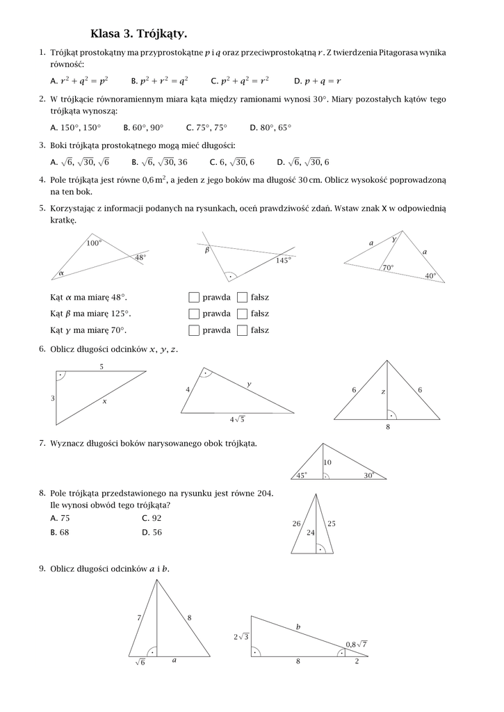 Klasa 3. Trójkąty. 1. Trójkąt prostokątny ma przyprostokątne 𝑝 i 𝑞 oraz przeciwprostokątną 𝑟. Z twierdzenia Pitagorasa wynika równość: A. 𝑟2 + 𝑞2 = 𝑝2 B. 𝑝2 + 𝑟2 = 𝑞2 C. 𝑝2 + 𝑞2 = 𝑟2 D. 𝑝 + 𝑞 = 𝑟 2. W trójkącie równoramiennym miara kąta między ramionami wynosi 30∘. Miary pozostałych kątów tego trójkąta wynoszą: A. 150∘, 150∘ B. 60∘, 90∘ C. 75∘, 75∘ D. 80∘, 65∘ 3. Boki trójkąta prostokątnego mogą mieć długości: A. √6, √30, √6 B. √6, √30, 36 C. 6, √30, 6 D. √6, √30, 6 4. Pole trójkąta jest równe 0,6 m2 , a jeden z jego boków ma długość 30 cm. Oblicz wysokość poprowadzoną na ten bok. 5. Korzystając z informacji podanych na rysunkach, oceń prawdziwość zdań. Wstaw znak X w odpowiednią kratkę. Kąt 𝛼 ma miarę 48∘. prawda fałsz Kąt 𝛽 ma miarę 125∘. prawda fałsz Kąt 𝛾 ma miarę 70∘. prawda fałsz 6. Oblicz długości odcinków 𝑥, 𝑦, 𝑧. 7. Wyznacz długości boków narysowanego obok trójkąta. 8. Pole trójkąta przedstawionego na rysunku jest równe 204. Ile wynosi obwód tego trójkąta? A. 75 C. 92 B. 68 D. 56 9. Oblicz długości odcinków 𝑎 i 𝑏. 10. Po wyjściu z punktu 𝐴 w kierunku południowym pokonano 4 km, a potem jeszcze 7 km w kierunku wschodnim, aby się znaleźć w punkcie 𝐵. Czy odległość w linii prostej od punktu 𝐴 do punktu 𝐵 jest większa niż 8 km? 49 + 16 > 64 TAK, 49 − 16 < 64 ponieważ NIE, odległość w linii prostej jest o połowę mniejsza: 7+4 < 8. 2 4+7>8 11. Najdłuższy bok trójkąta 𝐴𝐵𝐶 o wierzchołkach 𝐴 = (1, 1), 𝐵 = (−1, 3), 𝐶 = (−3, −2) ma długość: A. √29 B. 7 C. 2√2 D. 5 12. Jak zmieni się pole trójkąta, jeśli jego wysokość zmniejszy się 6 razy? A. wzrośnie 3 razy B. zmaleje 3 razy C. wzrośnie 6 razy D. zmaleje 6 razy 13. Uzasadnij, że jeśli w trójkącie kąt między bokami 𝑎 i 𝑏 ma miarę 60∘, to pole tego trójkąta jest równe 1 4 𝑎𝑏√3. 14. Jeden z boków trójkąta ma 14 cm, co stanowi 20 % obwodu tego trójkąta. Czy ten bok może być najdłuższym bokiem tego trójkąta? Wybierz poprawną odpowiedź i jedno jej uzasadnienie. dwa pozostałe boki też mogą mieć 14 cm. TAK, ponieważ NIE, ten bok jest krótszy od sumy długości dwóch pozostałych. najdłuższy bok tego trójkąta ma co najmniej 28 cm. taki trójkąt nie istnieje. 15. Uzupełnij zdania. a) Pole trójkąta równobocznego o wysokości 5√3 cm wynosi b) Pole trójkąta równobocznego o obwodzie . . . . . . . . . . . . . . . . wynosi 4√3 cm2 . 16. Punkt 𝐷 jest środkiem boku 𝐴𝐵 trójkąta 𝐴𝐵𝐶, a ∢ 𝐴𝐶𝐵 tego trójkąta ma miarę 30∘. Wykaż, że jeśli trójkąt 𝐴𝐷𝐶 jest równoramienny, to trójkąt 𝐴𝐵𝐶 jest prostokątny. 17. Cztery proste przecinają się tak jak na rysunku obok. Uzasadnij, że 𝛼 + 𝛾 = 𝛽 + 𝛿. *18. Trójkąt równoboczny podziel na osiem trójkątów równobocznych. Podaj, jakie długości mają boki powstałych trójkątów, jeśli długość boku dzielonego trójkąta wynosi 𝑎. Klasa 3. Czworokąty. 1. W każdym równoległoboku 𝐴𝐵𝐶𝐷: A. |𝐴𝐶| = |𝐷𝐵| C. |𝐴𝑂| = |𝑂𝐶| B. 𝐴𝐶 ⟂ 𝐷𝐵 D. |𝐴𝐷| = |𝐷𝐵| 2. Jakie pole ma trapez przedstawiony na rysunku? A. 14 B. 28 C. 42 D. 21 3. Oceń prawdziwość zdań. Wstaw znak X w odpowiednią kratkę. Każdy kwadrat ma przekątne równej długości. prawda fałsz Każdy romb jest równoległobokiem. prawda fałsz Przekątne każdego prostokąta przecinają się pod kątem prostym. prawda fałsz Każdy trapez jest równoległobokiem. prawda fałsz 4. Jeden z kątów rombu ma miarę 120∘. Miary pozostałych kątów tego rombu wynoszą: A. 90∘, 90∘, 60∘ B. 60∘, 60∘, 120∘ C. 30∘, 60∘, 120∘ D. 180∘, 90∘, 90∘ 5. Krótszy bok równoległoboku ma długość 4 cm, krótsza wysokość ma 3 cm, a dłuższa 9 cm. Dłuższy bok równoległoboku jest równy: A. 3 cm B. 6,75 cm C. 6 cm D. 12 cm 6. Obwód kwadratu o przekątnej 4 cm jest równy: A. 8√2 cm B. 2√2 cm C. 8 cm D. 16 cm 7. Oblicz pola i obwody narysowanych figur: a) rombu b) trapezu równoramiennego 8. Obwód czworokąta 𝐴𝐵𝐶𝐷 jest równy 54 cm. Obwód trójkąta 𝐴𝐵𝐶 jest równy 31 cm, a trójkąta 𝐴𝐶𝐷 – 35 cm. Oblicz długość przekątnej 𝐴𝐶. 9. Kąt ostry równoległoboku o bokach 4 cm i 6 cm ma miarę 45∘. Pole tego równoległoboku jest równe: A. 12√2 cm2 B. 6√2 cm2 C. 24 cm2 D. 12 cm2 10. Czy można skonstruować taki trapez, którego suma miar kątów przy jednym boku wynosi 180∘, a suma miar kątów przy innym boku jest równa 100∘? Wybierz poprawną odpowiedź i jedno jej uzasadnienie. suma miar dwóch kątów trapezu przy jednym boku może być dowolna: większa od 0∘, ale mniejsza od 360∘. 180∘ + 100∘ = 280∘, a suma miar wszystkich kątów w czworokącie jest TAK, ponieważ NIE, równa 360∘. jeśli suma miar kątów przy jednym boku wynosi 180∘, to przy innym boku też jest równa 180∘. można podać przykład takiego trapezu: trapez równoramienny, którego kąty przy jednym ramieniu mają miary 130∘ i 50∘. 11. Oblicz miary kątów, korzystając z informacji podanych na rysunku. | ∢ 𝐴𝐵𝐶| = . . . . . . . . . . . . . . | ∢ 𝐵𝐶𝐷| = . . . . . . . . . . . . . . | ∢ 𝑂𝑃𝑅| = . . . . . . . . . . . . . . | ∢ 𝑃𝑅𝑆| = . . . . . . . . . . . . . . romb trapez równoramienny 12. Oblicz obwód czworokąta 𝐴𝐵𝐶𝐷 o wierzchołkach 𝐴 = (3, −4), 𝐵 = (7, 2), 𝐶 = (3, 5), 𝐷 = (−1, 2). 13. Oblicz pole i obwód trapezu przedstawionego na poniższym rysunku. 14. O bokach czworokąta 𝐴𝐵𝐶𝐷 wiadomo, że |𝐴𝐵| = |𝐵𝐶| oraz |𝐶𝐷| = |𝐴𝐷|. Przekątna 𝐴𝐶 dzieli ten czworokąt na dwa trójkąty: równoboczny i prostokątny. Bok trójkąta równobocznego wynosi 4. 