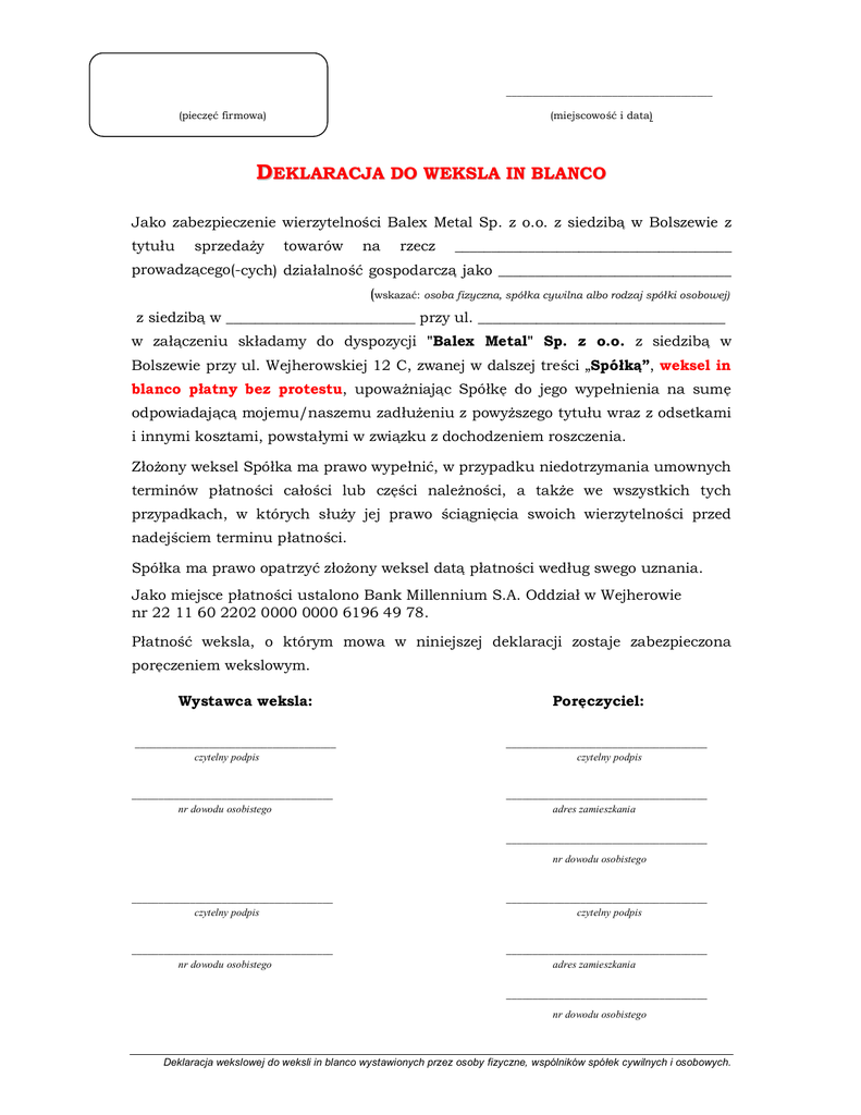 _______________________________________ (pieczęć firmowa) (miejscowość i data) DEKLARACJA DO WEKSLA IN BLANCO Jako zabezpieczenie wierzytelności Balex Metal Sp. z o.o. z siedzibą w Bolszewie z tytułu sprzedaży towarów na rzecz ______________________________________ prowadzącego(-cych) działalność gospodarczą jako ________________________________ (wskazać: osoba fizyczna, spółka cywilna albo rodzaj spółki osobowej) z siedzibą w __________________________ przy ul. __________________________________ w załączeniu składamy do dyspozycji "Balex Metal" Sp. z o.o. z siedzibą w Bolszewie przy ul. Wejherowskiej 12 C, zwanej w dalszej treści „Spółką”, weksel in blanco płatny bez protestu, upoważniając Spółkę do jego wypełnienia na sumę odpowiadającą mojemu/naszemu zadłużeniu z powyższego tytułu wraz z odsetkami i innymi kosztami, powstałymi w związku z dochodzeniem roszczenia. Złożony weksel Spółka ma prawo wypełnić, w przypadku niedotrzymania umownych terminów płatności całości lub części należności, a także we wszystkich tych przypadkach, w których służy jej prawo ściągnięcia swoich wierzytelności przed nadejściem terminu płatności. Spółka ma prawo opatrzyć złożony weksel datą płatności według swego uznania. Jako miejsce płatności ustalono Bank Millennium S.A. Oddział w Wejherowie nr 22 11 60 2202 0000 0000 6196 49 78. Płatność weksla, o którym mowa w niniejszej deklaracji zostaje zabezpieczona poręczeniem wekslowym. Wystawca weksla: ______________________________________ czytelny podpis ______________________________________ nr dowodu osobistego Poręczyciel: ______________________________________ czytelny podpis ______________________________________ adres zamieszkania ______________________________________ nr dowodu osobistego ______________________________________ czytelny podpis ______________________________________ czytelny podpis ______________________________________ nr dowodu osobistego ______________________________________ adres zamieszkania ______________________________________ nr dowodu osobistego Deklaracja wekslowej do weksli in blanco wystawionych przez osoby fizyczne, wspólników spółek cywilnych i osobowych. ZAŁĄCZNIK DO DEKLARACJI WEKSLOWEJ FIRMY _________________________ Wypełnia współmałżonek wystawcy weksla 1.* Zgadzam się na zaciągniecie zobowiązania kredytowego w Balex Metal Sp. z o.o. z siedzibą w Bolszewie i zabezpieczenie jego płatności wekslem „in blanco” przez mojego współmałżonka: _______________________________________ ______________________________ Imię i nazwisko wystawcy weksla _______________________________________ nr i seria dow. osobistego ______________________________ Imię i nazwisko osoby wyrażającej zgodę _______________________ nr i seria dow. osobistego ______________________________ Data Podpis osoby wyrażającej zgodę Wypełnia współmałżonek poręczyciela weksla 2.* Zgadzam się na udzielenie poręczenia zobowiązania wekslowego „in blanco” zabezpieczającego kredyt kupiecki w Balex Metal Sp. z o. o. z siedzibą w Bolszewie przez mojego współmałżonka: _______________________________________ Imię i nazwisko poręczyciela weksla _______________________________________ Imię i nazwisko osoby wyrażającej zgodę _______________________ Data ______________________________ nr i seria dow. osobistego ______________________________ nr i seria dow. osobistego ______________________________ Podpis osoby wyrażającej zgodę Wypełnia wystawca lub poręczyciel weksla 3.* Oświadczam, że: • nie pozostaję w związku małżeńskim* • nie pozostaję we wspólności majątkowej małżeńskiej (prosimy o załączenie dokumentu o rozdzielności majątkowej)* __________________________________ _____________________________ Imię i nazwisko osoby składającej oświadczenie nr i seria dow. osobistego __________________________________ _____________________________ Data Podpis osoby składającej oświadczenie * niepotrzebne skreślić Deklaracja wekslowej do weksli in blanco wystawionych przez osoby fizyczne, wspólników spółek cywilnych i osobowych.