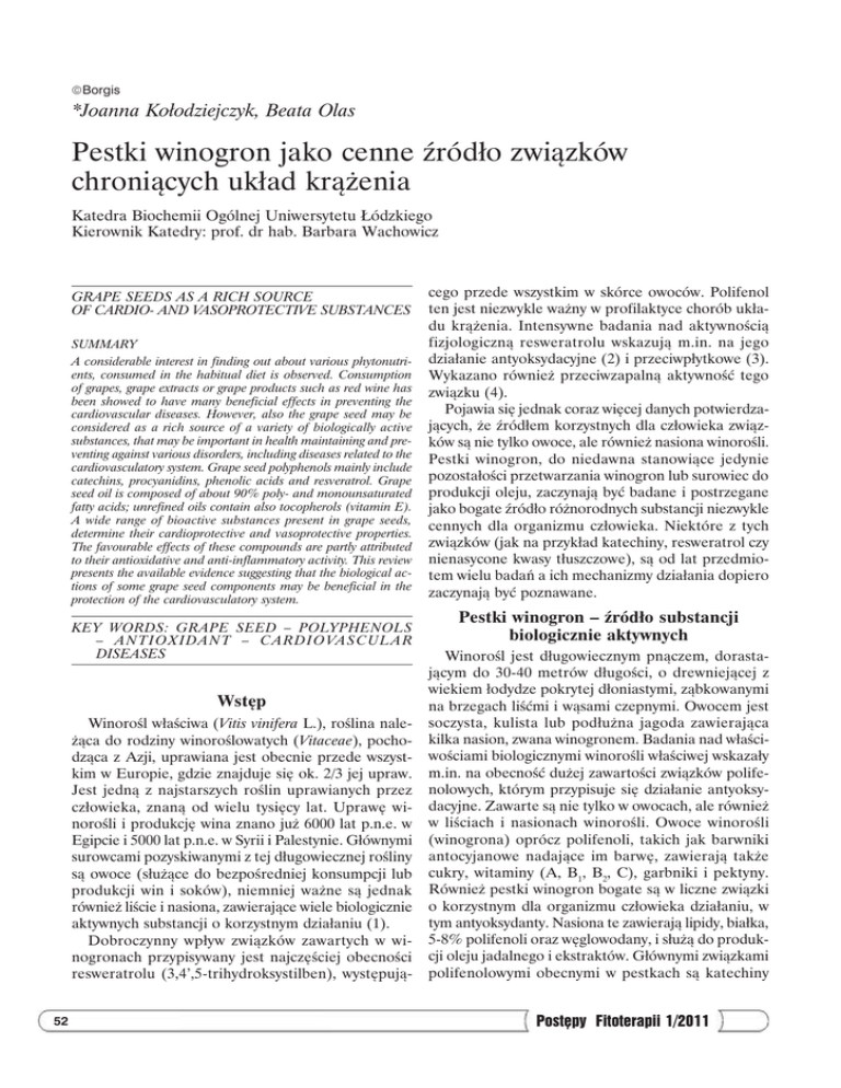 Borgis *Joanna Kołodziejczyk, Beata Olas Pestki winogron jako cenne źródło związków chroniących układ krążenia Katedra Biochemii Ogólnej Uniwersytetu Łódzkiego Kierownik Katedry: prof. dr hab. Barbara Wachowicz GRAPE SEEDS AS A RICH SOURCE OF CARDIO- AND VASOPROTECTIVE SUBSTANCES SUMMARY A considerable interest in finding out about various phytonutrients, consumed in the habitual diet is observed. Consumption of grapes, grape extracts or grape products such as red wine has been showed to have many beneficial effects in preventing the cardiovascular diseases. However, also the grape seed may be considered as a rich source of a variety of biologically active substances, that may be important in health maintaining and preventing against various disorders, including diseases related to the cardiovasculatory system. Grape seed polyphenols mainly include catechins, procyanidins, phenolic acids and resveratrol. Grape seed oil is composed of about 90% poly- and monounsaturated fatty acids; unrefined oils contain also tocopherols (vitamin E). A wide range of bioactive substances present in grape seeds, determine their cardioprotective and vasoprotective properties. The favourable effects of these compounds are partly attributed to their antioxidative and anti-inflammatory activity. This review presents the available evidence suggesting that the biological actions of some grape seed components may be beneficial in the protection of the cardiovasculatory system. KEY WORDS: GRAPE SEED – POLYPHENOLS – ANTIOXIDANT – CARDIO VASCULAR DISEASES Wstęp Winorośl właściwa (Vitis vinifera L.), roślina należąca do rodziny winoroślowatych (Vitaceae), pochodząca z Azji, uprawiana jest obecnie przede wszystkim w Europie, gdzie znajduje się ok. 2/3 jej upraw. Jest jedną z najstarszych roślin uprawianych przez człowieka, znaną od wielu tysięcy lat. Uprawę winorośli i produkcję wina znano już 6000 lat p.n.e. w Egipcie i 5000 lat p.n.e. w Syrii i Palestynie. Głównymi surowcami pozyskiwanymi z tej długowiecznej rośliny są owoce (służące do bezpośredniej konsumpcji lub produkcji win i soków), niemniej ważne są jednak również liście i nasiona, zawierające wiele biologicznie aktywnych substancji o korzystnym działaniu (1). Dobroczynny wpływ związków zawartych w winogronach przypisywany jest najczęściej obecności resweratrolu (3,4’,5-trihydroksystilben), występują52 cego przede wszystkim w skórce owoców. Polifenol ten jest niezwykle ważny w profilaktyce chorób układu krążenia. Intensywne badania nad aktywnością fizjologiczną resweratrolu wskazują m.in. na jego działanie antyoksydacyjne (2) i przeciwpłytkowe (3). Wykazano również przeciwzapalną aktywność tego związku (4). Pojawia się jednak coraz więcej danych potwierdzających, że źródłem korzystnych dla człowieka związków są nie tylko owoce, ale również nasiona winorośli. Pestki winogron, do niedawna stanowiące jedynie pozostałości przetwarzania winogron lub surowiec do produkcji oleju, zaczynają być badane i postrzegane jako bogate źródło różnorodnych substancji niezwykle cennych dla organizmu człowieka. Niektóre z tych związków (jak na przykład katechiny, resweratrol czy nienasycone kwasy tłuszczowe), są od lat przedmiotem wielu badań a ich mechanizmy działania dopiero zaczynają być poznawane. Pestki winogron – źródło substancji biologicznie aktywnych Winorośl jest długowiecznym pnączem, dorastającym do 30-40 metrów długości, o drewniejącej z wiekiem łodydze pokrytej dłoniastymi, ząbkowanymi na brzegach liśćmi i wąsami czepnymi. Owocem jest soczysta, kulista lub podłużna jagoda zawierająca kilka nasion, zwana winogronem. Badania nad właściwościami biologicznymi winorośli właściwej wskazały m.in. na obecność dużej zawartości związków polifenolowych, którym przypisuje się działanie antyoksydacyjne. Zawarte są nie tylko w owocach, ale również w liściach i nasionach winorośli. Owoce winorośli (winogrona) oprócz polifenoli, takich jak barwniki antocyjanowe nadające im barwę, zawierają także cukry, witaminy (A, B1, B2, C), garbniki i pektyny. Również pestki winogron bogate są w liczne związki o korzystnym dla organizmu człowieka działaniu, w tym antyoksydanty. Nasiona te zawierają lipidy, białka, 5-8% polifenoli oraz węglowodany, i służą do produkcji oleju jadalnego i ekstraktów. Głównymi związkami polifenolowymi obecnymi w pestkach są katechiny Postępy Fitoterapii 1/2011 Pestki winogron jako cenne źródło związków chroniących układ krążenia (w tym epikatechina, gallokatechina, epigalokatechina i 3-O-galusan epikatechiny), procyjanidyny oraz kwasy fenolowe (m.in. kwas galusowy, kawowy, ferulowy, p-kumarynowy) (5). Olej z pestek winogron (ang. grape seed oil, GSO) zawiera około 90% nienasyconych kwasów tłuszczowych, w tym 58-78% kwasu linolowego i 3-15% kwasu oleinowego. Wysoka zawartość tych kwasów ma istotne znaczenie w profilaktyce i leczeniu miażdżycy (rola w obniżaniu wysokiego poziomu cholesterolu). Nasycone kwasy tłuszczowe stanowią natomiast mniej niż 10% oleju z pestek winogron. Nierafinowany olej zawiera tokoferole oraz liczne związki polifenolowe. GSO charakteryzuje się ponadto wysoką temperaturą dymienia (ok. 190-230°C) (6, 7). dantów chroniących przed działaniem ONOO− może być właśnie epikatechina, ponieważ jej cząsteczka ma charakter amfifilowy, co umożliwia przeciwdziałanie uszkodzeniom indukowanym nadtlenoazotynem zarówno w środowisku hydrofilowym, jak i hydrofobowym (13). Badania dotyczące fizjologicznych efektów katechin wykazały również, że galusan epigalokatechiny może mieć korzystny wpływ na przebieg procesu zapalnego w patogenezie zmian miażdżycowych. Zaobserwowano, że w procesie miażdżycowym związek ten działa przeciwzapalnie (14). Główne antyoksydacyjne i kardioprotekcyjne składniki pestek winogron Katechiny Katec