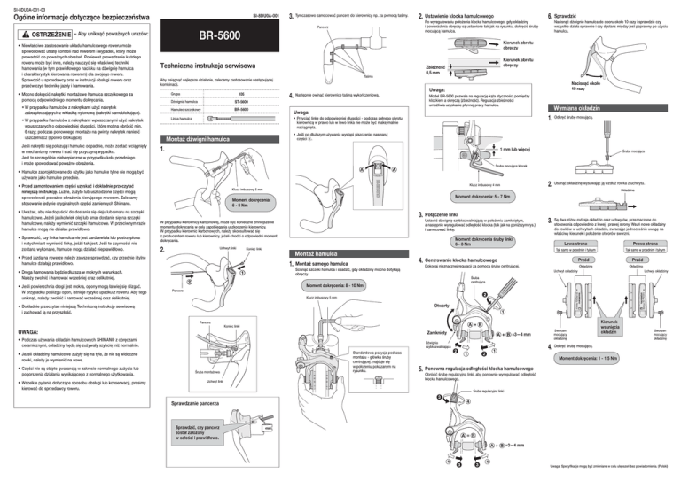 SI-8DU0A-001-03 SI-8DU0A-001 Ogólne informacje dotyczące bezpieczeństwa 3. Tymczasowo zamocować pancerz do kierownicy np. za pomocą taśmy. Pancerz BR-5600 OSTRZEŻENIE − Aby uniknąć poważnych urazów: • Niewłaściwe zastosowanie układu hamulcowego roweru może spowodować utratę kontroli nad rowerem i wypadek, który może prowadzić do poważnych obrażeń. Ponieważ prowadzenie każdego roweru może być inne, należy nauczyć się właściwej techniki hamowania (w tym prawidłowego nacisku na dźwignię hamulca i charakterystyk kierowania rowerem) dla swojego roweru. Sprawdzić u sprzedawcy oraz w instrukcji obsługi roweru oraz przećwiczyć technikę jazdy i hamowania. • W przypadku hamulców z nakrętkami użyć nakrętek zabezpieczających z wkładką nylonową (nakrętki samoblokujące). Jeśli nakrętki się poluzują i hamulec odpadnie, może zostać wciągnięty w mechanizmy roweru i stać się przyczyną wypadku. Jest to szczególnie niebezpieczne w przypadku koła przedniego i może spowodować poważne obrażenia. 105 Nacisnąć dźwignię hamulca do oporu około 10 razy i sprawdzić czy wszystko działa sprawnie i czy dystans między jest poprawny po użyciu hamulca. Taśma 4. Następnie owinąć kierownicę taśmą wykończeniową. Dźwignia hamulca ST-5600 Hamulec szczękowy BR-5600 Nacisnąć około 10 razy Uwaga: Model BR-5600 pozwala na regulację kąta styczności pomiędzy klockiem a obręczą (zbieżność). Regulacja zbieżności umożliwia uzyskanie płynnej pracy hamulca. Uwaga: Wymiana okładzin 1. Odkręć śrubę mocującą. • Przyciąć linkę do odpowiedniej długości - podczas pełnego obrotu kierownicą w prawo lub w lewo linka nie może być maksymalnie naciągnięta. Linka hamulca • W przypadku hamulców z nakrętkami wpuszczanymi użyć nakrętek wpuszczanych o odpowiedniej długości, które można obrócić min. 6 razy; podczas ponownego montażu na gwinty nakrętek nanieść uszczelniacz (spoiwo blokujące). 6. Sprawdzić Kierunek obrotu obręczy Zbieżność 0,5 mm Aby osiągnąć najlepsze działanie, zalecamy zastosowanie następującej kombinacji. Grupa Po wyregulowaniu położenia klocka hamulcowego, gdy okładziny i powierzchnia obręczy są ustawione tak jak na rysunku, dokręcić śrubę mocującą hamulca. Kierunek obrotu obręczy Techniczna instrukcja serwisowa • Mocno dokręcić nakrętki montażowe hamulca szczękowego za pomocą odpowiedniego momentu dokręcania. 2. Ustawienie klocka hamulcowego • Jeśli po dłuższym używaniu wystąpi piszczenie, nasmaruj części A. Montaż dźwigni hamulca 1. 1 mm lub więcej Śruba mocująca Śruba mocująca klocek • Hamulce zaprojektowane do użytku jako hamulce tylne nie mogą być używane jako hamulce przednie. • Sprawdzić, czy linka hamulca nie jest zardzewiała lub postrzępiona i natychmiast wymienić linkę, jeśżli tak jest. Jeśli te czynności nie zostaną wykonane, hamulce mogą działać nieprawidłowo. Klucz imbusowy 5 mm Moment dokręcenia: 6 - 8 Nm 3. Połączenie linki Ustawić dźwignię szybkozwalniającą w położeniu zamkniętym, a następnie wyregulować odległość klocka (tak jak na poniższym rys.) i zamocować linkę. W przypadku kierownicy karbonowej, może być konieczne zmniejszenie momentu dokręcania w celu zapobiegania uszkodzeniu kierownicy. W przypadku kierownic karbonowych, należy skonsultować się z producentem roweru lub kierownicy, jeżeli chodzi o odpowiedni moment dokręcania. 2. Uchwyt linki Moment dokręcenia śruby linki: 6 - 8 Nm Koniec linki Montaż hamulca • Przed jazdą na rowerze należy zawsze sprawdzać, czy przednie i tylne hamulce działają prawidłowo. dwa różne rodzaje okładzin oraz uchwytów, przeznaczone do 3. Są stosowania odpowiednio z lewej i prawej strony. Wsuń nowe okładziny do rowków w uchwytach okładzin, zwracając jednocześnie uwagę na właściwy kierunek i położenie otworów sworzni. Lewa strona Prawa strona Tak samo w przednim i tylnym Tak samo w przednim i tylnym 4. Centrowanie klocka hamulcowego 1. Montaż samego hamulca Ścisnąć szczęki hamulca i osadzić, gdy okładziny mocno dotykają obręczy • Droga hamowania będzie dłuższa w mokrych warunkach. Należy zwolnić i hamować wcześniej oraz delikatniej. Przód Dokonaj nieznacznej regulacji gula za pomocą śruby centrującej. Uchwyt okładziny Moment dokręcenia: 8 - 10 Nm Klucz imbusowy 5 mm Uchwyt okładziny Otwarty Pancerz Koniec linki UWAGA: Zamknięty • Podczas używania okładzin hamulcowych SHIMANO z obręczami ceramicznymi, okładziny będą się zużywały szybciej niż normalnie. =3—4 mm Dźwignia szybkozwalniająca • Jeżeli okładziny hamulcowe zużyły się na tyle, że nie są widoczne rowki, należy je wymienić na nowe. • Wszelkie pytania dotyczące sposobu obsługi lub konserwacji, prosimy kierować do sprzedawcy roweru. Okładzina Śruba centrująca Pancerz • Dokładnie przeczytać niniejszą Techniczną instrukcję serwisową i zachować ją na przyszłość. • Części nie są objęte gwarancją w zakresie normalnego zużycia lub pogorszenia działania wynikającego z normalnego użytkowania. Przód Okładzina DO PRZODU • Jeśli powierzchnia drogi jest mokra, opony mogą łatwiej się ślizgać. W przypadku poślizgu opon, istnieje ryzyko upadku z roweru. Aby tego uniknąć, należy zwolnić i hamować wcześniej oraz delikatniej. Okładzina Moment dokręcenia: 5 - 7 Nm DO PRZODU • Uważać, aby nie dopuścić do dostania się oleju lub smaru na szczęki hamulcowe. Jeżeli jakikolwiek olej lub smar dostanie się na szczęki hamulcowe, należy wymienić szczęki hamulcowe. W przeciwnym razie hamulce mogą nie działać prawidłowo. 2. Usunąć okładzinę wysuwając ją wzdłuż rowka z uchwytu. Klucz imbusowy 4 mm • Przed zamontowaniem części uzyskać i dokładnie przeczytać niniejszą instrukcję. Luźne, zużyte lub uszkodzone części mogą spowodować poważne obrażenia kieru