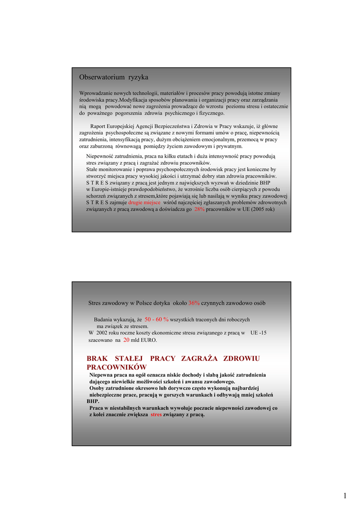 Obserwatorium ryzyka Wprowadzanie nowych technologii, materiałów i procesów pracy powodują istotne zmiany środowiska pracy.Modyfikacja sposobów planowania i organizacji pracy oraz zarządzania nią mogą powodować nowe zagroŜenia prowadzące do wzrostu poziomu stresu i ostatecznie do powaŜnego pogorszenia zdrowia psychicznego i fizycznego. Raport Europejskiej Agencji Bezpieczeństwa i Zdrowia w Pracy wskazuje, iŜ główne zagroŜenia psychospołeczne są związane z nowymi formami umów o pracę, niepewnością zatrudnienia, intensyfikacją pracy, duŜym obciąŜeniem emocjonalnym, przemocą w pracy oraz zaburzoną równowagą pomiędzy Ŝyciem zawodowym i prywatnym. Niepewność zatrudnienia, praca na kilku etatach i duŜa intensywność pracy powodują stres związany z pracą i zagraŜać zdrowiu pracowników. Stałe monitorowanie i poprawa psychospołecznych środowisk pracy jest konieczne by stworzyć miejsca pracy wysokiej jakości i utrzymać dobry stan zdrowia pracowników. S T R E S związany z pracą jest jednym z największych wyzwań w dziedzinie BHP w Europie-istnieje prawdopodobieństwo, Ŝe wzrośnie liczba osób cierpiących z powodu schorzeń związanych z stresem,które pojawiają się lub nasilają w wyniku pracy zawodowej S T R E S zajmuje drugie miejsce wśród najczęściej zgłaszanych problemów zdrowotnych związanych z pracą zawodową a doświadcza go 28% pracowników w UE (2005 rok) Stres zawodowy w Polsce dotyka około 36% czynnych zawodowo osób Badania wykazują, Ŝe 50 - 60 % wszystkich traconych dni roboczych ma związek ze stresem. W 2002 roku roczne koszty ekonomiczne stresu związanego z pracą w UE -15 szacowano na 20 mld EURO. BRAK STAŁEJ PRACY ZAGRAśA ZDROWIU PRACOWNIKÓW Niepewna praca na ogół oznacza niskie dochody i slabą jakość zatrudnienia dającego niewielkie moŜliwości szkoleń i awansu zawodowego. Osoby zatrudnione okresowo lub dorywczo często wykonują najbardziej niebezpieczne prace, pracują w gorszych warunkach i odbywają mniej szkoleń BHP. Praca w niestabilnych warunkach wywołuje poczucie niepewności zawodowej co z kolei znacznie zwiększa stres związany z pracą. 1 INTESYFIKACJA PRACY PROWADZI DO PROBLEMÓW ZDROWOTNYCH Napięte terminy i wysokie tempo sprawiają, Ŝe wielu pracowników w UE /dotyczy to równieŜ Polski/ boryka się z duŜym obciąŜeniem pracą i presją w miejscu pracy. Redukcja etatów, wzrastająca ilość informacji wymagających przetworzenia- skutek nowych technologii komunikacyjnych, oraz większe wymagania wobec mniejszej liczby pracowników mogą takŜe podnosić poziom stresu związanego z pracą. PRZEMOC I TYRANIZOWANIE STANOWIĄ ZAGROśENIA DLA PRACOWNIKÓW Problem przemocy i tyranizowanie powoduje coraz większe zaniepokojenie. Dotyczy wszystkich sektorów zatrudnienia i działalności, występuje szczególnie często w sektorach ochrony zdrowia i usług. Jego konsekwencjami mogą być: obniŜenie samooceny, niepokój, depresja a nawet samobójstwo. 2 ZABURZONA RÓWNOWAGA MIĘDZY śYCIEM ZAWODOWYM I PRYWATNYM MA WPŁYW NA RODZINĘ DuŜe obciąŜenie pracą i nieelastyczne godziny pracy utrudniają osiągnięcie względnej równowagi pomiędzy Ŝyciem zawodowym i prywatnym; dotyczy to przede wszystkim kobiet, które nadal często „pracują na dwie zmiany”- najpierw w pracy a później w domu. MoŜe to prowadzić do stresu i innych negatywnych skutków dla zdrowia, szczególnie gdy pracownicy nie mają moŜliwości dopasowania warunków pracy do potrzeb osobistych. Ponad 40 % pracowników z UE 27, którzy pracują w nadgodzinach, podaje, iŜ nie osiąga zadowalającej równowagi pomiędzy Ŝyciem zawodowym a prywatnym. W 2009 roku Europejska Agencja Bezpieczeństwa i Zdrowia w Pracy(EU-OSHA) przewiduje rozpoczęcie badań w przedsiębiorstwach UE 27 by dowiedzieć się, jak organizacje-sektora publicznego i prywatnego- postępują z ryzykiem psychospołecznym, oraz jak moŜna je wspierać w efektywniejszym zwalczaniu tych złoŜonych zagroŜeń w miejscu pracy. PrzeciąŜenia ilościowe Fizyczne warunki pracy Brak wsparcia PrzeciąŜenia jakościowe STRES Konflikt roli NiedociąŜenie jakościowe Brak kontroli nad pracą Niejasność roli 3 4