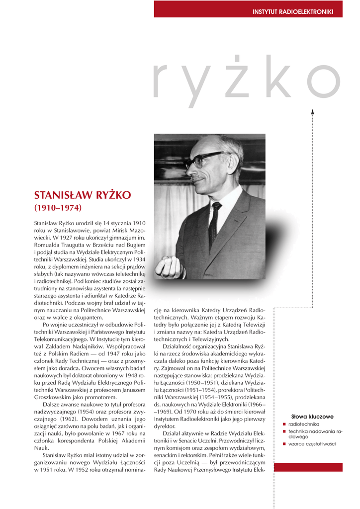 INSTYTUT RADIOELEKTRONIKI ryżko STANISŁAW RYŻKO (1910–1974) Stanisław Ryżko urodził się 14 stycznia 1910 roku w Stanisławowie, powiat Mińsk Mazowiecki. W 1927 roku ukończył gimnazjum im. Romualda Traugutta w Brześciu nad Bugiem i podjął studia na Wydziale Elektrycznym Politechniki Warszawskiej. Studia ukończył w 1934 roku, z dyplomem inżyniera na sekcji prądów słabych (tak nazywano wówczas teletechnikę i radiotechnikę). Pod koniec studiów został zatrudniony na stanowisku asystenta (a następnie starszego asystenta i adiunkta) w Katedrze Radiotechniki. Podczas wojny brał udział w tajnym nauczaniu na Politechnice Warszawskiej oraz w walce z okupantem. Po wojnie uczestniczył w odbudowie Politechniki Warszawskiej i Państwowego Instytutu Telekomunikacyjnego. W Instytucie tym kierował Zakładem Nadajników. Współpracował też z Polskim Radiem — od 1947 roku jako członek Rady Technicznej — oraz z przemysłem jako doradca. Owocem własnych badań naukowych był doktorat obroniony w 1948 roku przed Radą Wydziału Elektrycznego Politechniki Warszawskiej z profesorem Januszem Groszkowskim jako promotorem. Dalsze awanse naukowe to tytuł profesora nadzwyczajnego (1954) oraz profesora zwyczajnego (1962). Dowodem uznania jego osiągnięć zarówno na polu badań, jak i organizacji nauki, było powołanie w 1967 roku na członka korespondenta Polskiej Akademii Nauk. Stanisław Ryżko miał istotny udział w zorganizowaniu nowego Wydziału Łączności w 1951 roku. W 1952 roku otrzymał nomina- cję na kierownika Katedry Urządzeń Radiotechnicznych. Ważnym etapem rozwoju Katedry było połączenie jej z Katedrą Telewizji i zmiana nazwy na: Katedra Urządzeń Radiotechnicznych i Telewizyjnych. Działalność organizacyjna Stanisława Ryżki na rzecz środowiska akademickiego wykraczała daleko poza funkcję kierownika Katedry. Zajmował on na Politechnice Warszawskiej następujące stanowiska: prodziekana Wydziału Łączności (1950 –1951), dziekana Wydziału Łączności (1951–1954), prorektora Politechniki Warszawskiej (1954 –1955), prodziekana ds. naukowych na Wydziale Elektroniki (1966– –1969). Od 1970 roku aż do śmierci kierował Instytutem Radioelektroniki jako jego pierwszy dyrektor. Działał aktywnie w Radzie Wydziału Elektroniki i w Senacie Uczelni. Przewodniczył licznym komisjom oraz zespołom wydziałowym, senackim i rektorskim. Pełnił także wiele funkcji poza Uczelnią — był przewodniczącym Rady Naukowej Przemysłowego Instytutu Elek- Słowa kluczowe n radiotechnika n technika nadawania radiowego n wzorce częstotliwości INSTYTUT RADIOELEKTRONIKI R troniki i Przemysłowego Instytutu Telekomunikacyjnego, członkiem rad naukowych Instytutu Łączności, Instytutu Lotnictwa, Instytutu Technologii Elektronowej, Instytutu Tele- i Radiotechnicznego, Rady Ośrodka Badań Rozwojowych Elektroniki Próżniowej, Wojskowego Instytutu Łączności, Rady Naukowej ds. Metrologii przy Polskim Komitecie Normalizacji i Miar, pełnił też wiele funkcji doraźnych, często na wysokim szczeblu (był np. członkiem Rady Naukowo-Technicznej przy Ministrze Łączności oraz Rady Głównej w Ministerstwie Nauki Szkolnictwa Wyższego i Techniki). Był również przewodniczącym Polskiego Towarzystwa Cybernetycznego. Stanisław Ryżko wyróżniał się niezależnością sądu i kompetencją. Te jego cechy doceniono także na arenie międzynarodowej. Jednym z dowodów był wybór na zastępcę przewodniczącego I Komisji Studiów Międzynarodowego Komitetu Doradczego Radiokomunikacji (Comité Consultatif Internationale Radiocommunications — CCIR, agenda ONZ) od 1956 roku. W tej roli Stanisław Ryżko kilkakrotnie przewodniczył obradom I Komisji w Genewie. Był również przewodniczącym Komisji I Pomiarów i Wzorców Komitetu Narodowego Międzynarodowej Unii Nauk Radiowych (Union Radio-Scientifique Internationale — URSI). Przyczynił się wydatnie do budowy nowego Gmachu Elektroniki, do którego przeniósł Katedrę Urządzeń Radiotechnicznych w 1963 roku, jeszcze przed ostatecznym ukończeniem budowy. Stanisław Ryżko zainicjował i włożył wiele wysiłku w budowę oraz tworzenie Zakładu Doświadczalnego ZDAR (Zakład Opracowań i Wdrożeń Aparatury Radioelektronicznej), którego zadaniem było wdrażanie wyników badań naukowych. Dzięki jego zaangażowaniu w Instytucie Radioelektroniki powstało m.in. kilka serii częstościomierzy — czasomierzy elektronicznych oraz układy rozszerzające zakres pomiarowy. Mierniki były produkowane przez ZDAR (także przez ZOPAN) i używane w wielu laboratoriach w Polsce. W latach sześćdziesiątych zespół pod kierunkiem Stanisława Ryżki intensywnie rozwijał cyfrowe metody pomiarów, dążąc do osiągnięcia coraz wyższych częstotliwości. Wyniki prac nad pomiarami cyfrowymi opublikowano m.in. w zbiorowej książce pod jego redakcją Elektroniczne mierniki zliczające (Wydawnictwa Komunikacji i Łączności, 1965). W 1966 roku za prace nad rozwojem techniki cyfrowych przyrządów pomiarowych zespół ten uzyskał Nagrodę Państwową I stopnia w dziedzinie techniki. Prace nad cyfrową stabilizacją częstotliwości zostały nagrodzone w 1973 roku zespołową Nagrodą II stopnia Ministra Obrony Narodowej. Stanisław Ryżko, w ścisłym związku z prowadzonymi wykładami na Politechnice Warszawskiej i w Wojskowej Akademii Technicznej, zajmował się rozwinięciem metod graficznych w zastosowaniu do projektowania obwodów dopasowujących w nadajnikach radiowych oraz optymalizacji warunków pracy lamp mocy i tranzystorów. Wyniki tych prac przyczyniły się do wzbogacenia dwóch podręczników. Pierwszy, Urządzenia radionadawcze, został wydany w 2 tomach przez Wydawnictwo Ministerstwa Obrony Narodowej (1953, 1956). Drugi, Wzmacniacze rezonansowe i generatory mocy, którego współautorem był Jan T. Ebert, został wydany przez Wydawnictwa Naukowo-Techniczne (1968, drugie wydanie — 1971). Doro