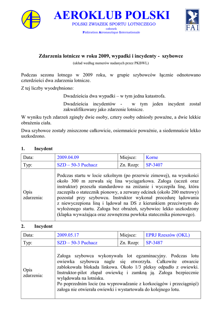 AEROKLUB POLSKI POLSKI ZWIĄZEK SPORTU LOTNICZEGO członek Fédération Aéronautique Internationale Zdarzenia lotnicze w roku 2009, wypadki i incydenty - szybowce (układ według numerów nadanych przez PKBWL) Podczas sezonu lotnego w 2009 roku, w grupie szybowców łącznie odnotowano czterdzieści dwa zdarzenia lotnicze. Z tej liczby wyodrębniono: Dwadzieścia dwa wypadki – w tym jedna katastrofa. Dwadzieścia incydentów w tym zakwalifikowany jako zdarzenie lotnicze. jeden incydent został W wyniku tych zdarzeń zginęły dwie osoby, cztery osoby odniosły poważne, a dwie lekkie obrażenia ciała. Dwa szybowce zostały zniszczone całkowicie, osiemnaście poważnie, a siedemnaście lekko uszkodzono. 1. Incydent Data: 2009.04.09 Miejsce: Korne Typ: SZD – 50-3 Puchacz Zn. Rozp: SP-3407 Opis zdarzenia: Podczas startu w locie szkolnym (po przerwie zimowej), na wysokości około 300 m zerwała się lina wyciągarkowa. Załoga (uczeń oraz instruktor) przeszła standardowo na zniżanie i wyczepiła linę, która zaczepiła o statecznik pionowy, a zerwany odcinek (około 200 metrowy) pozostał przy szybowcu. Instruktor wykonał procedurę lądowania z niewyczepiona liną i lądował na DS z kierunkiem przeciwnym do wyłożonego startu. Załoga bez obrażeń, szybowiec lekko uszkodzony (klapka wyważająca oraz zewnętrzna powłoka statecznika pionowego). 2. Incydent Data: 2009.05.17 Miejsce: EPRJ Rzeszów (OKL) Typ: SZD – 50-3 Puchacz Zn. Rozp: SP-3487 Opis zdarzenia: Załoga szybowca wykonywała lot egzaminacyjny. Podczas lotu owiewka szybowca nagle się otworzyła. Całkowite otwarcie zablokowała blokada linkowa. Około 1/3 pleksy odpadło z owiewki. Instruktor-pilot złapał owiewkę i zamkną ją. Załoga bezpiecznie wylądowała na lotnisku. Po poprzednim locie (na wyprowadzanie z korkociągów i przeciągnięć) załoga nie otwierała owiewki i wystartowała do kolejnego lotu. 3. Wypadek Data: 2009.05.21 Miejsce: EPGI – Lisie Kąty Typ: SZD – 50-3 Puchacz Zn. Rozp: SP-3154 Opis zdarzenia: Uczeń - pilot wykonywał lądowanie w drugim locie samodzielnym. Przyziemienie szybowca nastąpiło ze zwiększoną prędkością pionową w wyniku czego uszkodzona została przednia część kadłuba. 4. Poważny incydent Data: 2009.05.24 Miejsce: EPPK - Kobylnica Typ: SZD – 9 Bocian Zn. Rozp: SP-2767 Opis zdarzenia: Podczas startu zespołu samolot - szybowiec na wysokości poniżej 100m nastąpiło samoczynne wyczepienie liny holowniczej przy samolocie. Załoga zdecydowała się na lądowanie w terenie przygodnym. Po wykonaniu zakrętu o 90o w prawo wytraciła wysokość za pomocą hamulców aerodynamicznych i ślizgu. Przyziemienie szybowca odbyło się na zmniejszonej prędkości ze względu na ograniczony teren do lądowania, Podczas przyziemienia szybowiec zahaczył skrzydłem o ziemię, obrócił się o 180o i zatrzymał się. Uszkodzona została prawa końcówka skrzydła. Załoga bez obrażeń. 5. Incydent Data: 2009.05.24 Miejsce: EPLR - Radawiec Typ: SZD – 50-3 Puchacz Zn. Rozp: SP-3257 Opis zdarzenia: W trakcie wykonywania lotu w strefie pilotażu uczeń - pilot poprosił instruktora o przerwanie lotu. Podczas powrotu instruktor zlecił uczniowi - pilotowi otworzenie bocznego okienka w owiewce szybowca. Po wyjściu na prostą do lądowania, na wysokości około 100 m, instruktor wprowadził szybowiec w ślizg nakierunkowy w lewo celem poprawy pozycji szybowca. Po około 3 sekundach nastąpiło otwarcie owiewki szybowca, którą udało się zamknąć po wyrównaniu szybowca. Lądowanie bez następstw. Po oględzinach szybowca stwierdzono zniszczenie owiewki. 6. Incydent Data: 2009.06.06 Miejsce: EPTO - Toruń Typ: SZD – 9 Bocian Zn. Rozp: SP-3040 Opis zdarzenia: Uczeń-pilot przed drugim samodzielnym lotem na szybowcu SZD-9 Bocian otrzymał od instruktora nadzorującego instrukcję, żeby wyczepił się na pozycji "z wiatrem" i lądował. Uczeń po starcie, w prawym kręgu do pasa 29R, wyczepił się na pozycji z wiatrem, po czym wykonał zakręt w prawo o 180o a następnie w lewo o 180o i lądował przeciwnie do wyłożonych znaków. Uczeń-pilot źle zrozumiał instrukcje instruktora, myląc polecenie wyczepienia na trawersie litery i lądowania zgodnego z wyłożonymi znakami. Uczeń-pilot po locie powiedział, iż był przekonany, że ma lądować z tylnym wiatrem, przeciwnie do wyłożonych znaków. 7. Incydent Data: 2009.06.15 Miejsce: Sława Typ: SZD – 48-3 Jantar Std.3 Zn. Rozp: SP-3331 Opis zdarzenia: Podczas zawodów szybowcowych, z powodu zaniku noszeń termicznych pilot został zmuszony do lądowania w terenie przygodnym. Lądowanie wykonał na skoszonej łące. Z powodu miękkiego terenu nastąpiło przyhamowanie szybowca i uszkodzenie podwozia. Uszkodzeniu uległ tylny wahacz zawieszenia kółka. 8. Wypadek Data: 2009.06.28 Miejsce: EPOD Olsztyn - Dajtki Typ: SZD – 50-3 Puchacz Zn. Rozp: SP-3354 Opis zdarzenia: Podczas lotu szkolnego na szybowcu SZD-50-3 Puchacz uczeń-pilot wykonywał "esowanie" celem wytracenia nadmiaru wysokości i lądowania z kierunkiem przeciwnym do startu. Po zakończeniu "esowania", z powodu nadmiaru wysokości instruktor zdecydował wykonanie ślizgu kierunkowego na lewą burtę, na wysokości około 80 metrów. Na wysokości około 60 metrów instruktor zdecydował o zmianie kierunku ślizgu. Na wysokości około 40 metrów, podczas wyprowadzania szybowca z prawego ślizgu do lotu normalnego instruktor stwierdził zbyt szybkie opadanie i zmniejszoną reakcję szybowca na wychylenie sterów. Zamknięcie hamulców i pełne wychylenie sterów nie okazały się skuteczne. Szybowiec na wysokości około 3 metrów zaczepił prawą końcówką skrzydła o trawę, obrócił się w powietrzu o około 45 stopni i uderzył podwoziem o ziemię. W szybowcu stwierdzono ukręcenie kadłuba i ogona oraz pęknięcie kadłuba przy podwoziu głównym. 9. Incydent Data: 2009.07.03 Miejsce: EPBY Bydgoszcz Zn. Rozp: SP-2559 Typ: SZD – 30 Pirat O