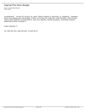 Nowa Huta zaginął pies rasy Beagle, tricolor, 6-cio letni bez rodowodu, wabi się Rufus. Miał na sobie