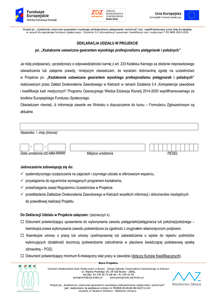 DEKLARACJA UDZIAŁU W PROJEKCIE pn. „Kształcenie ustawiczne gwarantem wysokiego profesjonalizmu pielęgniarek i położnych” Ja niżej podpisana/y, uprzedzona/y o odpowiedzialności karnej z art. 233 Kodeksu Karnego za złożenie nieprawdziwego oświadczenia lub zatajenie prawdy, niniejszym oświadczam, że wyrażam dobrowolną zgodę na uczestnictwo w Projekcie pn. „Kształcenie ustawiczne gwarantem wysokiego profesjonalizmu pielęgniarek i położnych” realizowanym przez Zakład Doskonalenia Zawodowego w Kielcach w ramach Działania 5.4 „Kompetencje zawodowe i kwalifikacje kadr medycznych” Programu Operacyjnego Wiedza Edukacja Rozwój 2014-2020 współfinansowanego ze środków Europejskiego Funduszu Społecznego. Oświadczam również, iż informacje zawarte we Wniosku o dopuszczenie do kursu – Formularzu Zgłoszeniowym są aktualne. Nazwisko i imię (imiona) - - Data urodzenia DD-MM-RRRR Miejsce urodzenia PESEL Jednocześnie zobowiązuję się do: systematycznego uczęszczania na zajęciach i czynnego udziału w oferowanym wsparciu, przystąpienia do egzaminów wymaganych programem kształcenia, przestrzegania zasad Regulaminu Uczestnictwa w Projekcie. przedkładania Zakładowi Doskonalenia Zawodowego w Kielcach wszelkich informacji i dokumentów niezbędnych do prawidłowej realizacji Projektu. Do Deklaracji Udziału w Projekcie załączam: (zaznaczyć x) Dokument potwierdzający uprawnienie do wykonywania zawodu pielęgniarki/pielęgniarza lub położnej/położnego – kserokopia prawa wykonywania zawodu potwierdzona za zgodność z oryginałem własnoręcznym podpisem. Kserokopie umowy o pracę lub umowy cywilnoprawnej lub zaświadczenia o wpisie do rejestru podmiotów wykonujących działalność leczniczą (potwierdzenie zatrudnienia w placówce świadczącej podstawową opiekę zdrowotną – POZ). Dokument potwierdzający minimum 6-miesięczny staż pracy w zawodzie (dotyczy Kursów Kwalifikacyjnych). I. OŚWIADCZENIA UCZESTNIKA PROJEKTU: 1. Uprzedzona(y) o odpowiedzialności karnej z art. 233 Kodeksu Karnego za złożenie nieprawdziwego oświadczenia lub zatajenie prawdy, oświadczam, że dane wpisane we „Wniosku o dopuszczenie do kursu – Formularza Zgłoszeniowego” są zgodne ze stanem faktycznym; jestem świadoma/y odpowiedzialności za podanie nieprawdziwych danych i równocześnie zobowiązuję się poinformować Zakład Doskonalenia Zawodowego w Kielcach w sytuacji zmiany jakichkolwiek danych. 2. Zostałam/em poinformowana/y, że Projekt pn. „Kształcenie ustawiczne gwarantem wysokiego profesjonalizmu pielęgniarek i położnych” jest współfinansowany ze środków Unii Europejskiej w ramach Europejskiego Funduszu Społecznego i realizowany jest w ramach Programu Operacyjnego Wiedza Edukacja Rozwój 2014-2020 Oś Priorytetowa V „Wsparcie dla obszaru zdrowia”, Działanie 5.4 „Kompetencje zawodowe i kwalifikacje kadr medycznych”. 3. Zostałam/em poinformowana/y, że udział w Projekcie pn. „Kształcenie ustawiczne gwarantem wysokiego profesjonalizmu pielęgniarek i położnych” jest bezpłatny. 4. Zapoznałam/em się z zasadami rekrutacji zawartymi w Regulaminie Uczestnictwa w Projekcie i akceptuję jego wszystkie postanowienia. 5. Wyrażam wolę dobrowolnego uczestnictwa w Projekcie pn. „Kształcenie ustawiczne gwarantem wysokiego profesjonalizmu pielęgniarek i położnych”. 6. Spełniam kryteria kwalifikowalności, uprawniające mnie do udziału w Projekcie pn. „Kształcenie ustawiczne gwarantem wysokiego profesjonalizmu pielęgniarek i położnych” – zgodnie z Regulaminem Uczestnictwa w Projekcie. 7. W terminie 4 tygodni po zakończeniu udziału w Projekcie przekażę Zakładowi Doskonalenia Zawodowego w Kielcach dane dotyczące mojego statusu na rynku pracy oraz informacje na temat udziału w kształceniu lub szkoleniu oraz uzyskania kwalifikacji lub nabycia kompetencji. 8. Wyrażam zgodę na gromadzenie, przetwarzanie i przechowywanie moich danych osobowych zawartych w niniejszej Deklaracji do celów związanych z realizacją Projektu, zgodnie z ustawą z dnia 29 sierpnia 1997r. o ochronie danych osobowych (tekst jedn. Dz. U. z 2015 r., poz. 2135 z późn. zm.) …………….......................... Data ……………………………………..... Imię i nazwisko ……….....……………….…………... Podpis