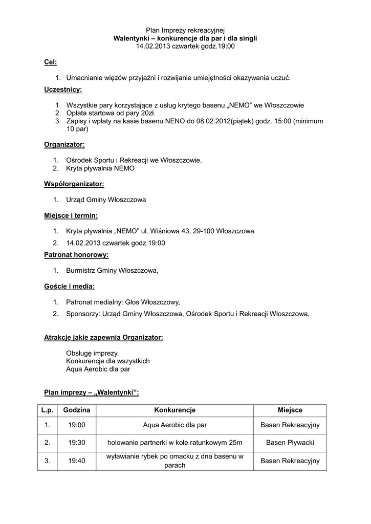 Plan Imprezy rekreacyjnej Walentynki – konkurencje dla par i dla singli 14.02.2013 czwartek godz.19:00 Cel: 1. Umacnianie więzów przyjaźni i rozwijanie umiejętności okazywania uczuć. Uczestnicy: 1. Wszystkie pary korzystające z usług krytego basenu „NEMO” we Włoszczowie 2. Opłata startowa od pary 20zł. 3. Zapisy i wpłaty na kasie basenu NENO do 08.02.2012(piątek) godz. 15:00 (minimum 10 par) Organizator: 1. 2. Ośrodek Sportu i Rekreacji we Włoszczowie, Kryta pływalnia NEMO Współorganizator: 1. Urząd Gminy Włoszczowa Miejsce i termin: 1. Kryta pływalnia „NEMO” ul. Wiśniowa 43, 29-100 Włoszczowa 2. 14.02.2013 czwartek godz.19:00 Patronat honorowy: 1. Burmistrz Gminy Włoszczowa, Goście i media: 1. Patronat medialny: Głos Włoszczowy, 2. Sponsorzy: Urząd Gminy Włoszczowa, Ośrodek Sportu i Rekreacji Włoszczowa, Atrakcje jakie zapewnia Organizator: Obsługę imprezy. Konkurencje dla wszystkich Aqua Aerobic dla par Plan imprezy – „Walentynki”: L.p. Godzina Konkurencje Miejsce 1. 19:00 Aqua Aerobic dla par Basen Rekreacyjny 2. 19:30 holowanie partnerki w kole ratunkowym 25m Basen Pływacki 3. 19:40 wyławianie rybek po omacku z dna basenu w parach Basen Rekreacyjny 4. 19:50 Zjazd rurą na czas w parach Zjeżdżalnia 4. 20:00 wyścigi na barana Basen Rekreacyjny 5. 20:15 najdłuższy pocałunek pod wodą Basen Rekreacyjny 6. 20:30 Zakończenie imprezy – wręczenie nagród Hala basenowa Nagrody w konkursach: 1. ROMANTYCZNY WEEKEND DLA DWOJGA!!! 2. UPOMINKI RZECZOWE Postanowienia końcowe: 1. Szczegółowych informacji na temat imprezy udziela: Michał Jamrozik – Menadżer sportu Tel: 602 296 290, e-mail: [email protected] Obsługa klienta – kasa basenu NEMO Tel: 41 33 35 101, e-mail: [email protected] Udział w imprezie rekreacyjnej: ‘’ Walentynki – konkurencje dla par i singli’’ jest jednocześnie wyrażeniem zgody na wykorzystywanie zdjęć z wizerunkiem uczestników imprezy (zarówno zawodników, jak I kibiców) w celach informacyjnych I reklamowych prowadzonych przez OSiR Włoszczowa. Serdecznie zapraszamy Wszystkich do wspólnej zabawy !!!
