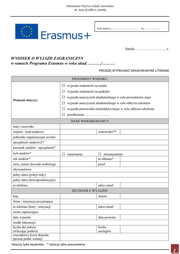 Państwowa Wyższa Szkoła Zawodowa im. Jana Grodka w Sanoku Data wpływu………………………………………… Lp. ……………………… …………..…………… Sanok, ……….…………….r. WNIOSEK O WYJAZD ZAGRANICZNY w ramach Programu Erasmus w roku akad. ………/……… PROSZĘ WYPEŁNIAĆ DRUKOWANYMI LITERAMI PRZEDMIOT WNIOSKU Wniosek dotyczy: □ □ □ □ □ □ wyjazdu studenta/ki na studia wyjazdu studenta/ki na praktyki wyjazdu nauczyciela akademickiego w celu prowadzenia zajęć wyjazdu nauczyciela akademickiego w celu odbycia szkolenia wyjazdu pracownika niedydaktycznego w celu odbycia szkolenia przedłużenie ………………….. DANE WNIOSKODAWCY imię i nazwisko stopień / tytuł naukowy stanowisko** jednostka organizacyjna uczelni specjalność naukowa** kierunek studiów / specjalność* tryb studiów* □ stacjonarny □ rok studiów* niestacjonarny nr albumu* seria, numer dowodu osobistego pesel obywatelstwo pełny adres (pobyt stały) pełny adres (korespondencyjny) nr telefonu adres email SZCZEGÓŁY WYJAZDU kraj miasto firma / instytucja przyjmująca nr telefonu firmy / instytucji adres email osoba zapraszająca data wyjazdu data powrotu środki lokomocji liczba dni pobytu (wliczając podróż) szacunkowy koszt dojazdu (proszę podać walutę) liczba noclegów *dotyczy tylko studentów ** dotyczy tylko pracowników 1 Państwowa Wyższa Szkoła Zawodowa im. Jana Grodka w Sanoku szacunkowy koszt powrotu (proszę podać walutę) OŚWIADCZENIA I ZAŁĄCZNIKI □ □ □ □ □ □ Oświadczam, że … □ □ □ □ □ □ □ □ □ □ Do wniosku załączam: □ □ □ zgodnie z ustawą z dnia 29.08.1997 r. o ochronie danych osobowych (tekst jednolity Dz. U. 2002, Nr 101, poz. 926) wyrażam zgodę na przetwarzanie przez PWSZ im. Jana Grodka w Sanoku moich danych osobowych do celów organizacji programu Erasmus+ przedstawione przeze mnie we wniosku informacje są zgodne ze stanem faktycznym znane mi są zasady organizacji Programu na poziomie ogólnopolskim i uczelnianym i zobowiązuję się ich przestrzegać zobowiązuję się do ubezpieczenia od następstw nieszczęśliwych wypadków na czas podróży i pobytu za granicą zamierzam ubiegać się o dodatkowe dofinansowanie z tytułu niepełnosprawności znam język obcy, w którym będzie się odbywać większość zajęć lub praktyk* znam język obcy, w którym będę prowadzić zajęcia lub będzie się odbywać szkolenie** UCZESTNICZĘ w wyjeździe w ramach programu Erasmus+ NIE UCZESTNICZYŁAM/EM wcześniej w wyjazdach w ramach programu Erasmus+ (w okresie całego życia, w różnych miejscach pracy/studiów) UCZESTNICZYŁAM/EM wcześniej w wyjazdach w ramach programu Erasmus+ (w okresie całego życia, w różnych miejscach pracy/studiów) o wyjazdy na studia - ……… razy o wyjazdy na praktyki - ……… razy o wyjazdy w celu prowadzenia zajęć - ……… razy o wyjazdy w celu odbycia szkolenia - ……… razy ewentualne brakujące załączniki dostarczę w terminie wyznaczonym przez Uczelnianego Koordynatora Programu Erasmus+ Learning Agreement* Training Agreement* Individual Teaching Programme** Individual Work Programme** pisemną zgodę instytucji przyjmującej na przyjazd w terminie i charakterze zgodnym z wnioskiem (ew. zaproszenie) …………………………………………………………………….. …………………………………………………………………….. …………………………………………………………………….. data podpis *dotyczy tylko studentów ** dotyczy tylko pracowników 2 Państwowa Wyższa Szkoła Zawodowa im. Jana Grodka w Sanoku INFORMACJE Z DZIAŁU TOKU STUDIÓW* Średnia ocen z egzaminów i zaliczeń z oceną (z przedmiotów niekończących się egzaminem) za ostatni semestr wynosi … Czy studentowi/studentce został przyznany urlop krótko lub długoterminowy na wnioskowany okres wyjazdu? □ TAK □ NIE ……………………………………………………………………………… ……………………………………………………………………………… ……………………………………………………………………………… ……………………………………………………………………………… Uwagi data i pieczęć podpis INFORMACJE OD BEZPOŚREDNIEGO PRZEŁOŻONEGO** Pracownik jest zatrudniony w PWSZ Sanok jako w podstawowym miejscu pracy (dotyczy nauczycieli akademickich) □ TAK □ NIE Pracownik przynależy w PWSZ Sanok do minimum kadrowego □ TAK □ NIE Pracownik jest zatrudniony na pełny etat □ TAK □ NIE Pracownik posiada staż pracy w PWSZ Sanok pow. 2 lat □ TAK □ NIE Planowane szkolenie jest co najmniej w 50% zgodne z wykonywaną pracą (dotyczy wyjazdów szkoleniowych) □ TAK □ NIE Wniosek opiniuję pozytywnie □ TAK □ NIE (dotyczy nauczycieli akademickich) ……………………………………………………………………………… ……………………………………………………………………………… ……………………………………………………………………………… ……………………………………………………………………………… Uwagi data i ew. pieczęć podpis *dotyczy tylko studentów ** dotyczy tylko pracowników 3 Państwowa Wyższa Szkoła Zawodowa im. Jana Grodka w Sanoku KWALIFIKACJA WSTĘPNA - OCENA FORMALNA KdsWzZ □ □ □ □ □ wniosek złożony w terminie wniosek kompletny (wypełnione wymagane rubryki, podpisane oświadczenia, dodane załączniki) osoba wnioskująca deklaruje znajomość odpowiedniego języka obcego wniosek posiada pozytywna opinię bezpośredniego przełożonego** w przypadku wyjazdów w celu odbycia szkolenia występuje co najmniej 50% zgodności indywidualnego szkolenia z wykonywaną pracą** □ □ Na podstawie oceny formalnej Komisja ds. Współpracy z Zagranic