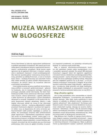 promocja muzeum / promocja w muzeum Muz.,2013(54): 47-52 Rocznik, ISSN 0464-1086 data przyjęcia – 05.2013 data akceptacji – 06.2013 MUZEA WARSZAWSKIE W BLOGOSFERZE Andrzej Zugaj Narodowy Instytut Muzealnictwa i Ochrony Zbiorów Strona internetowa to obecnie wyposażenie podstawowe w polskich placówkach muzealnych. Nie zawsze jest to wysokiej jakości interaktywna witryna, nowocześnie skonstruowana i profesjonalnie zarządzana. Wciąż jeszcze często ogranicza się do ogólnych informacji o muzeum, ewentualnie o wystawach, imprezach i innych przedsięwzięciach. Aby stworzyć wysokiej jakości nowoczesną stronę internetową, potrzebne są nakłady finansowe, a z tym w muzeach bywa różnie – kondycję finansową tych placówek można dość trafnie określać po jakości działań informacyjno-promocyjnych, do których zalicza się oczywiście obecność w wirtualnej rzeczywistości. Coraz więcej muzeów zaczyna uzupełniać stronę internetową profilem w serwisach społecznościowych – głównie na Facebooku. Jest to rozwiązanie niedrogie i skutecznie promujące placówkę wśród internautów. Na takim facebookowym profilu można zamieszczać informacje o działalności muzeum, zbierać komentarze i suges e odbiorców, a także wymieniać się informacjami z innymi placówkami aktywnymi w serwisie. Działalność na FB oznacza dla muzeum konieczność częstych aktualizacji, dbania o stały dopływ informacji, jednak nie muszą to być informacje rozbudowane i twórcze – wystarczą odpowiedniki notatek prasowych ilustrowane zdjęciami, rysunkami lub nagraniami wideo. Liczy się dopasowany do rytmu serwisów społecznościowych szybki przekaz zapadający w pamięć na krótko, lecz pozwalający utrzymać stałe zainteresowanie dzięki regularności i odpowiedniej częstotliwości wpisów. Taki serwis na facebookowej „ścianie” można zgrać z codzienną pracą muzeum i na bieżąco zamieszczać informacje o zmianie godzin otwarcia placówki, o cenach biletów, wernisażach, remontach itp. Jest to jednak cały czas informacja podstawowa, która raczej nie zgłębia tematów, nie posze- rza znajomości przedmiotu, nie prowokuje merytorycznej dyskusji. Tu z pomocą może przyjść blog. Blog w systemie informacyjno-promocyjnym muzeum jest zjawiskiem niezbyt często występującym, m.in. z powodów opisanych powyżej. Na ponad 400 placówek muzealnych mających statut lub regulamin uzgodniony z ministrem kultury i dziedzictwa narodowego jedynie kilkadziesiąt prowadzi – oprócz oficjalnych stron internetowych – blogi lub strony spełniające podobną funkcję. Warszawa pod tym względem wyróżnia się na tle kraju – w 33 placówkach muzealnych1 funkcjonuje 17 blogów. W tej liczbie wyróżnić można kilka typów: blogi oficjalne – ogólnomuzealne i tematyczne, blogi autorskie oraz blogi nieoficjalne. Wykaz blogów działających w warszawskich muzeach lub piszących o tychże przedstawia tabela (stan na maj 2013 r.). Blog oficjalny ogólny Jest to blog prowadzony przez pracowników w ramach obowiązków służbowych, a przynajmniej przy aprobacie dyrekcji placówki. Takie blogi często wypełniają te same zadania, co zakładka na oficjalnej stronie, nazywana najczęściej „aktualności” albo „wydarzenia”. Na bieżąco publikowane są tam informacje na temat działalności muzeum, nowo otwieranych wystaw, zdarzają się życzenia okolicznościowe i fotorelacje z imprez. Gdy do tworzenia bloga zabiera się kreatywny pracownik i na dodatek zaprasza do współpracy innych (pracowników, wolontariuszy itp.), blog ma szansę zyskać na atrakcyjności merytorycznej. Blog Muzeum Azji i Pacyfiku to typowa strona informacyjna, blogiem nazwana z powodów technicznych – używa pla ormy do tworzenia blogów, a aktualności pojawiają się w odwrotnej kolejności chronologicznej. Wpisy w głównej mierze są zapowiedziami wystaw i wydarzeń, tworzonymi MUZEALNICTWO 54 47 mechanicznie i szablonowo – wklejony skan zaproszenia czy plakatu wystawy i krótki opis. Poza wpisami na blogu są zakładki: „Obecna wystawa”, „Dzień indonezyjski”, „Lekcje muzealne”, „Kontakt”, „Program Imprez”. Muzeum Azji i Pacyfiku – blog muzealny2 to właściwie nie blog, lecz strona statyczna zbudowana na mechanizmie blogowym, nienastawiona na interakcję i rozwijanie zainteresowania placówką (nie ma możliwości dodawania komentarzy, można tylko ocenić wpisy i podzielić się nimi na portalach społecznościowych), tylko po prostu strona informująca o działalności bieżącej muzeum. W Muzeum Literatury blog zaczynał funkcjonowanie od podobnej formy, jednak bardzo szybko inwencja autorów dała o sobie znać. Blog Muzeum Literatury – aktualności, wystawy, spotkania, relacje, zapowiedzi3 jest blogiem muzealno-literackim. Jest to uzupełnienie strony statycznej, gdzie także można znaleźć wszelkie informacje dotyczące wystaw i innych przejawów działalności Muzeum Literatury im. Adama Mickiewicza w Warszawie. Na blogu informacje są rozwijane, prezentowane są wybitne postacie literatury polskiej i światowej – nie tylko twórcy z bieżącej ekspozycji. Nie brak tu lapidarnych ogłoszeń o wystawach i spotkaniach, choć większość zawiera także dłuższy opis, wprowadzający w temat i przyciągający uwagę czytającego. Teksty to jednak nie jest jedyny typ zawartości – blog Muzeum Literatury można określić jako zaawansowany mul medialnie, zawiera także bogatą dokumentację fotograficzną oraz wklejane do wpisów materiały wideo: krótkie filmy, reportaże, wywiady, relacje z wystaw i spotkań. Informacje o tym muzeum pojawiają się w mediach lokalnych i ogólnopolskich – prasie, radiu, telewizji; na blogu możemy znaleźć przegląd owych informacji, odesłania do wycinków prasowych i materiałów filmowych, a często również – jak już wspomniałem – bezpośrednio wklejone fragmenty artykułów i nagrań wideo. Blog podzie