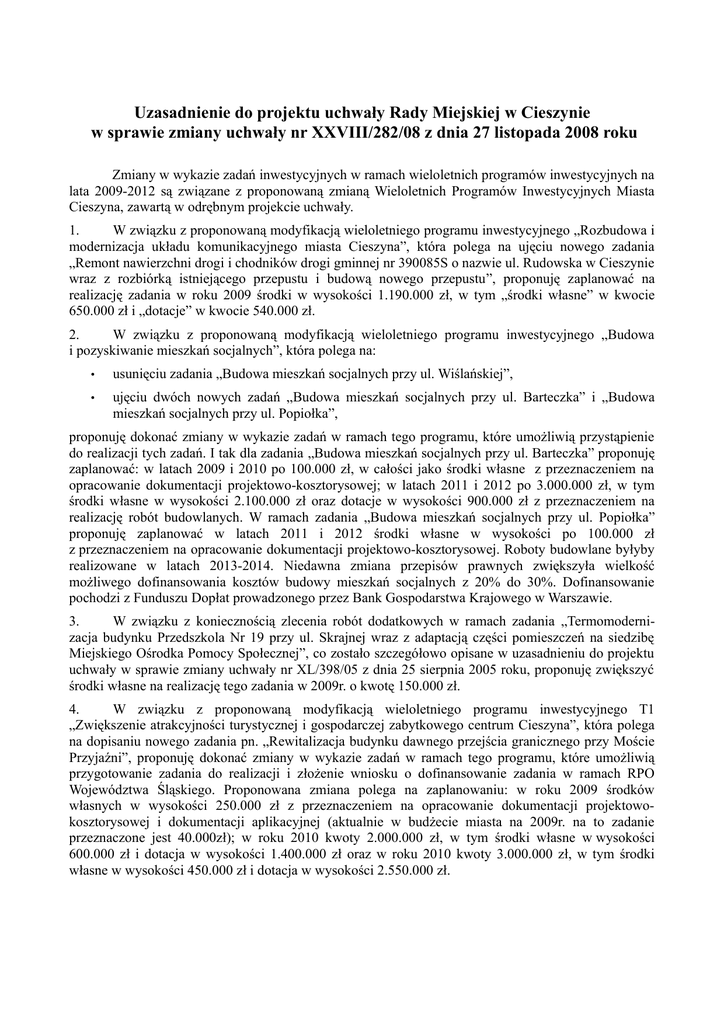 Uzasadnienie do projektu uchwały Rady Miejskiej w Cieszynie w sprawie zmiany uchwały nr XXVIII/282/08 z dnia 27 listopada 2008 roku Zmiany w wykazie zadań inwestycyjnych w ramach wieloletnich programów inwestycyjnych na lata 2009-2012 są związane z proponowaną zmianą Wieloletnich Programów Inwestycyjnych Miasta Cieszyna, zawartą w odrębnym projekcie uchwały. 1. W związku z proponowaną modyfikacją wieloletniego programu inwestycyjnego „Rozbudowa i modernizacja układu komunikacyjnego miasta Cieszyna”, która polega na ujęciu nowego zadania „Remont nawierzchni drogi i chodników drogi gminnej nr 390085S o nazwie ul. Rudowska w Cieszynie wraz z rozbiórką istniejącego przepustu i budową nowego przepustu”, proponuję zaplanować na realizację zadania w roku 2009 środki w wysokości 1.190.000 zł, w tym „środki własne” w kwocie 650.000 zł i „dotacje” w kwocie 540.000 zł. 2. W związku z proponowaną modyfikacją wieloletniego programu inwestycyjnego „Budowa i pozyskiwanie mieszkań socjalnych”, która polega na: • usunięciu zadania „Budowa mieszkań socjalnych przy ul. Wiślańskiej”, • ujęciu dwóch nowych zadań „Budowa mieszkań socjalnych przy ul. Barteczka” i „Budowa mieszkań socjalnych przy ul. Popiołka”, proponuję dokonać zmiany w wykazie zadań w ramach tego programu, które umożliwią przystąpienie do realizacji tych zadań. I tak dla zadania „Budowa mieszkań socjalnych przy ul. Barteczka” proponuję zaplanować: w latach 2009 i 2010 po 100.000 zł, w całości jako środki własne z przeznaczeniem na opracowanie dokumentacji projektowo-kosztorysowej; w latach 2011 i 2012 po 3.000.000 zł, w tym środki własne w wysokości 2.100.000 zł oraz dotacje w wysokości 900.000 zł z przeznaczeniem na realizację robót budowlanych. W ramach zadania „Budowa mieszkań socjalnych przy ul. Popiołka” proponuję zaplanować w latach 2011 i 2012 środki własne w wysokości po 100.000 zł z przeznaczeniem na opracowanie dokumentacji projektowo-kosztorysowej. Roboty budowlane byłyby realizowane w latach 2013-2014. Niedawna zmiana przepisów prawnych zwiększyła wielkość możliwego dofinansowania kosztów budowy mieszkań socjalnych z 20% do 30%. Dofinansowanie pochodzi z Funduszu Dopłat prowadzonego przez Bank Gospodarstwa Krajowego w Warszawie. 3. W związku z koniecznością zlecenia robót dodatkowych w ramach zadania „Termomodernizacja budynku Przedszkola Nr 19 przy ul. Skrajnej wraz z adaptacją części pomieszczeń na siedzibę Miejskiego Ośrodka Pomocy Społecznej”, co zostało szczegółowo opisane w uzasadnieniu do projektu uchwały w sprawie zmiany uchwały nr XL/398/05 z dnia 25 sierpnia 2005 roku, proponuję zwiększyć środki własne na realizację tego zadania w 2009r. o kwotę 150.000 zł. 4. W związku z proponowaną modyfikacją wieloletniego programu inwestycyjnego T1 „Zwiększenie atrakcyjności turystycznej i gospodarczej zabytkowego centrum Cieszyna”, która polega na dopisaniu nowego zadania pn. „Rewitalizacja budynku dawnego przejścia granicznego przy Moście Przyjaźni”, proponuję dokonać zmiany w wykazie zadań w ramach tego programu, które umożliwią przygotowanie zadania do realizacji i złożenie wniosku o dofinansowanie zadania w ramach RPO Województwa Śląskiego. Proponowana zmiana polega na zaplanowaniu: w roku 2009 środków własnych w wysokości 250.000 zł z przeznaczeniem na opracowanie dokumentacji projektowokosztorysowej i dokumentacji aplikacyjnej (aktualnie w budżecie miasta na 2009r. na to zadanie przeznaczone jest 40.000zł); w roku 2010 kwoty 2.000.000 zł, w tym środki własne w wysokości 600.000 zł i dotacja w wysokości 1.400.000 zł oraz w roku 2010 kwoty 3.000.000 zł, w tym środki własne w wysokości 450.000 zł i dotacja w wysokości 2.550.000 zł.