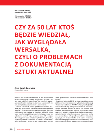Muz.,2013(54): 140-145 Rocznik, ISSN 0464-1086 data przyjęcia – 05.2013 data akceptacji – 06.2013 CZY ZA 50 LAT KTOŚ BĘDZIE WIEDZIAŁ, JAK WYGLĄDAŁA WERSALKA, CZYLI O PROBLEMACH Z DOKUMENTACJĄ SZTUKI AKTUALNEJ Anna Saciuk-Gąsowska Muzeum Sztuki w Łodzi Muzeum jest instytucją powołaną w celu gromadzenia i ochrony materialnych śladów naszej natury i kultury, a zatem istotą „działania muzealnego” jest wycofanie wybranych przedmiotów z obiegu codziennego i ocalenie ich, na czas jak najdłuższy, od zniszczenia i zapomnienia1. Ustawa o muzeach określa podstawowe zadania muzeów jako gromadzenie, opracowywanie i udostępnianie zbiorów2. Zadania te dotyczą każdego rodzaju muzeum publicznego, bez względu na charakter kolekcji i, mimo wielu transformacji, jakim przez wieki ulegały muzea, ich zadania nie zmieniły się z upływem czasu. Ich początek stanowiły gromadzone od lat zbiory królewskie, kościelne, arystokratyczne czy szlacheckie. W XVIII w., wraz ze wzrostem świadomości, że sztuka jest dziedzictwem kultury 140 MUZEALNICTWO 54 całego społeczeństwa, pierwsze muzea otwarto dla publiczności3. Dopiero w końcu lat 20. XX w. otwarte zostało muzeum sztuki zorientowane na zbieranie tylko sztuki współczesnej – Museum of Modern Art (MoMA) w Nowym Jorku (1929). Muzeum to stało się rodzajem laboratorium, współtworzącego hierarchię wartości w sztuce. W Europie, poza niewielką Międzynarodową Kolekcją Sztuki Nowoczesnej grupy „a.r.” w Łodzi i próbami Alexandra Dornera utworzenia takiej kolekcji w Landesmuseum w Hanowerze sztuka nowoczesna obecna była przede wszystkim w kolekcjach prywatnych. Do muzeów trafiła po II wojnie światowej, a od lat 70. ubiegłego wieku muzea tworzące kolekcje sztuki współczesnej powstają prawie w każdym większym mie- muzea i kolekcje 1. Jarosław Fliciński, Lepszego jutra, 2010 [w tle: Daniel Buren, Hommage à Henryk Stażewski, Cabane éclatée avec ssu blanc et noir, travail situé, 1985– 2009, fragment], wystawa „Sala Neoplastyczna. Kompozycja otwarta”, Muzeum Sztuki, Łódź, 6.07.2010-3.07.2011, kurator: Jarosław Suchan 1. Jarosław Fliciński, A Be er Tomorrow, 2010, [in the background: Daniel Buren, Hommage à Henryk Stażewski, Cabane éclatée avec ssu blanc et noir, travail situé, 1985–2009, fragment], exhibi on: ”The Neo-plas c Arts Room. Open composi on”, Łódź Art Museum, 6 July 2010-30 July 2011, curator: Jarosław Suchan ście Europy i obu Ameryk, stąd problemy kolekcjonowania, opisywania i udostępniania muzealiów stały się istotnymi zagadnieniami współczesnego muzealnictwa. O ile jednak problem udostępniania zbiorów traktowany jest niemal priorytetowo, zarówno przez tzw. organy założycielskie (liczba dzieł udostępnionych w danym okresie stanowi istotny składnik sprawozdania z działalności instytucji), jak i autorów licznych opracowań dotyczących strategii wystawienniczych, praktyk kuratorskich oraz metod edukacji muzealnej, o tyle sposoby opisu dzieł, gromadzonej dokumentacji i przechowywania ich ekspozycyjnych komponentów4 stanowią sferę pomijaną milczeniem, jakby magazyny i muzealia nie istniały, a ich przechowywanie i utrzymanie nie stanowiło istotnego elementu istnienia muzeów, nie wymagało nakładów finansowych ani koncepcji działania. W ciągu ostatnich kilkudziesięciu lat sztuka przechodzi ogromne zmiany, na miejscu tradycyjnych form wypowiedzi artystycznej, jak obraz czy rzeźba, powstają dzieła, gdzie medium jest instalacja, często wielkogabarytowa i z bardzo różnorodnych materiałów, czy nagranie audiowizualne. Natomiast sposoby zapisywania dzieł, opracowywania dokumentacji, określania techniki wykonania i użytych materiałów zarówno w rozporządzeniach, jak i w praktyce muzealnej pozostają takie, jak 100 lat temu. Biorąc pod uwagę dzieła o zupełnie nowatorskiej technice wykonania, jak choćby instalacja z głośników scenicznych5, tradycyjne metody opisu, zapis wymiarów, używane słowniki i pojęcia całkowicie się nie sprawdzają. Nawet księgi inwentaryzacyjne narzucają podział z ubiegłej epoki: malarstwo, rzeźba, rysunek, grafika, fotografia, film. Do jakiej księgi wpisać zatem rysunek – projekt odtwarzalnego environment? Projekt jest rysunkiem na papierze, realizacja muralem, ale jednocześnie aranżacją przestrzeni. Mógłby być wpisany do księgi rysunku (ponieważ to rysunek jest przechowywany w magazynie), malarstwa (ponieważ w wersji udostępnianej widzom jest muralem) i rzeźby (ponieważ jest to environment)6. Taki problem w Polsce jest nowy, dopiero od niedawna obok Muzeum Sztuki w Łodzi pojawiły się inne muzea ukierunkowane na kolekcjonowanie sztuki najnowszej, ale zanim ich pracownicy staną się z kuratorów projektów wystawienniczych kustoszami, muszą zbudować kolekcję. Czasem dzieła wykonywane są specjalnie dla miejsca w wybranym muzeum. Fakt budowania kolekcji dla konkretnego budynku, w dialogu artysty z miejscem zarówno wytworzenia, jak i prezentacji dzieła, jak działo się to na przełomie lat 80. i 90. ubiegłego wieku w Musée d’Art Contemporaine w Lyonie, wydaje się dzisiaj oczywisty – to dzięki temu powstają nowe prace wtopione w już istniejące zbiory, powiązane z przeszłością miejsca i budujące oryginalność kolekcji. Takim muzeom nie grozi globalizacja i wy- MUZEALNICTWO 54 141 nikający z niej zanik różnorodności. I tylko takie kolekcje mają szanse przyciągnąć publiczność, dla której te same, powtarzające się w każdym muzeum nazwiska, a nawet te same dzieła stanowią element zniechęcający do wizyty. Instalacja site specyfic ma jednak także złe strony: utrudnia przemieszczanie dzieł, ich wypożyczenia, zmianę ekspozycji, a i koncepcje przechowania takich dzieł pewnie różne są dla każdej instytucji, która je gromadzi, podobnie, jak różne tworzy narzędzia do ich opisu. W Polsce kolekcji budowanych w tak niestandardowy spo