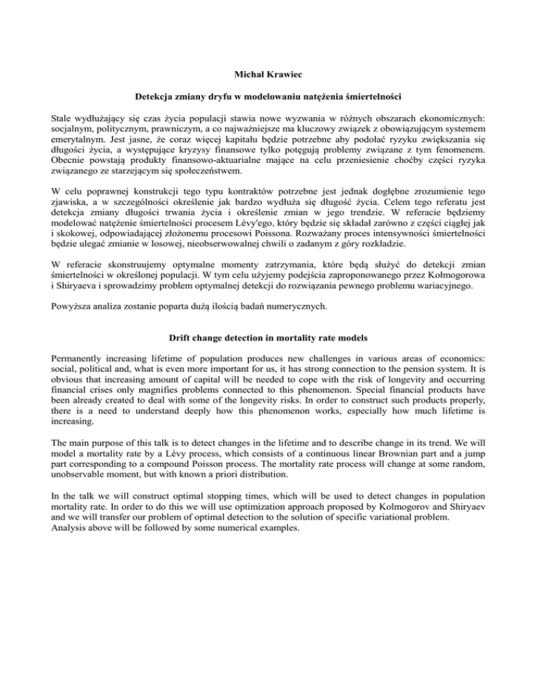 Michał Krawiec Detekcja zmiany dryfu w modelowaniu natężenia śmiertelności Stale wydłużający się czas życia populacji stawia nowe wyzwania w różnych obszarach ekonomicznych: socjalnym, politycznym, prawniczym, a co najważniejsze ma kluczowy związek z obowiązującym systemem emerytalnym. Jest jasne, że coraz więcej kapitału będzie potrzebne aby podołać ryzyku zwiększania się długości życia, a występujące kryzysy finansowe tylko potęgują problemy związane z tym fenomenem. Obecnie powstają produkty finansowo-aktuarialne mające na celu przeniesienie choćby części ryzyka związanego ze starzejącym się społeczeństwem. W celu poprawnej konstrukcji tego typu kontraktów potrzebne jest jednak dogłębne zrozumienie tego zjawiska, a w szczególności określenie jak bardzo wydłuża się długość życia. Celem tego referatu jest detekcja zmiany długości trwania życia i określenie zmian w jego trendzie. W referacie będziemy modelować natężenie śmiertelności procesem Lévy'ego, który będzie się składał zarówno z części ciągłej jak i skokowej, odpowiadającej złożonemu procesowi Poissona. Rozważany proces intensywności śmiertelności będzie ulegać zmianie w losowej, nieobserwowalnej chwili o zadanym z góry rozkładzie. W referacie skonstruujemy optymalne momenty zatrzymania, które będą służyć do detekcji zmian śmiertelności w określonej populacji. W tym celu użyjemy podejścia zaproponowanego przez Kołmogorowa i Shiryaeva i sprowadzimy problem optymalnej detekcji do rozwiązania pewnego problemu wariacyjnego. Powyższa analiza zostanie poparta dużą ilością badań numerycznych. Drift change detection in mortality rate models Permanently increasing lifetime of population produces new challenges in various areas of economics: social, political and, what is even more important for us, it has strong connection to the pension system. It is obvious that increasing amount of capital will be needed to cope with the risk of longevity and occurring financial crises only magnifies problems connected to this phenomenon. Special financial products have been already created to deal with some of the longevity risks. In order to construct such products properly, there is a need to understand deeply how this phenomenon works, especially how much lifetime is increasing. The main purpose of this talk is to detect changes in the lifetime and to describe change in its trend. We will model a mortality rate by a Lévy process, which consists of a continuous linear Brownian part and a jump part corresponding to a compound Poisson process. The mortality rate process will change at some random, unobservable moment, but with known a priori distribution. In the talk we will construct optimal stopping times, which will be used to detect changes in population mortality rate. In order to do this we will use optimization approach proposed by Kolmogorov and Shiryaev and we will transfer our problem of optimal detection to the solution of specific variational problem. Analysis above will be followed by some numerical examples.