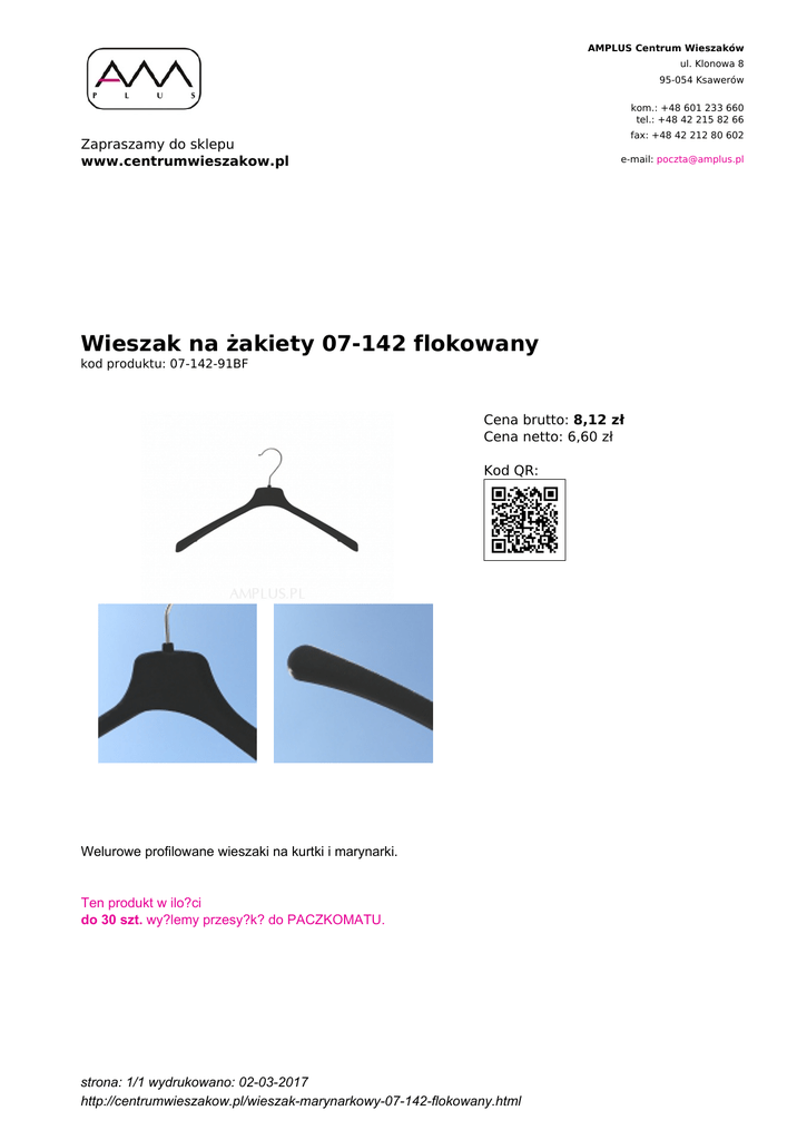 AMPLUS Centrum Wieszaków ul. Klonowa 8 95-054 Ksawerów kom.: +48 601 233 660 tel.: +48 42 215 82 66 fax: +48 42 212 80 602 Zapraszamy do sklepu www.centrumwieszakow.pl e-mail: [email protected] Wieszak na żakiety 07-142 flokowany kod produktu: 07-142-91BF Cena brutto: 8,12 zł Cena netto: 6,60 zł Kod QR: Welurowe profilowane wieszaki na kurtki i marynarki. Ten produkt w ilo?ci do 30 szt. wy?lemy przesy?k? do PACZKOMATU. strona: 1/1 wydrukowano: 02-03-2017 http://centrumwieszakow.pl/wieszak-marynarkowy-07-142-flokowany.html