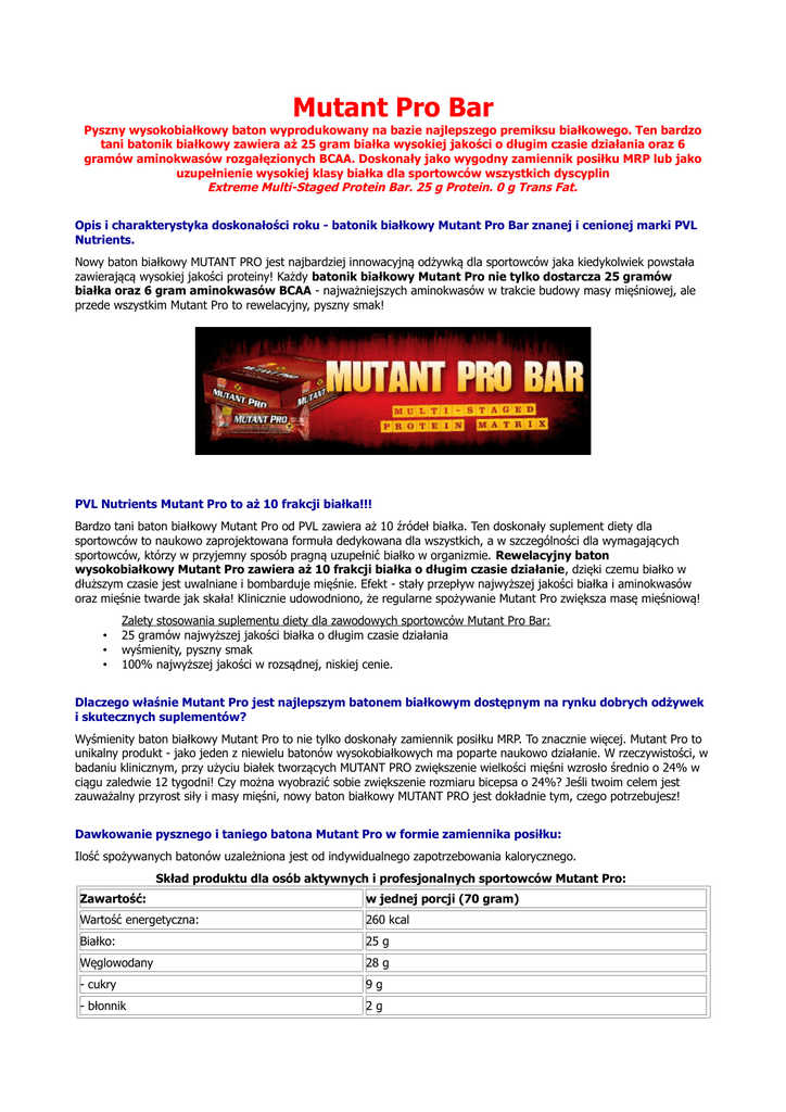 Mutant Pro Bar Pyszny wysokobiałkowy baton wyprodukowany na bazie najlepszego premiksu białkowego. Ten bardzo tani batonik białkowy zawiera aż 25 gram białka wysokiej jakości o długim czasie działania oraz 6 gramów aminokwasów rozgałęzionych BCAA. Doskonały jako wygodny zamiennik posiłku MRP lub jako uzupełnienie wysokiej klasy białka dla sportowców wszystkich dyscyplin Extreme Multi-Staged Protein Bar. 25 g Protein. 0 g Trans Fat. Opis i charakterystyka doskonałości roku - batonik białkowy Mutant Pro Bar znanej i cenionej marki PVL Nutrients. Nowy baton białkowy MUTANT PRO jest najbardziej innowacyjną odżywką dla sportowców jaka kiedykolwiek powstała zawierającą wysokiej jakości proteiny! Każdy batonik białkowy Mutant Pro nie tylko dostarcza 25 gramów białka oraz 6 gram aminokwasów BCAA - najważniejszych aminokwasów w trakcie budowy masy mięśniowej, ale przede wszystkim Mutant Pro to rewelacyjny, pyszny smak! PVL Nutrients Mutant Pro to aż 10 frakcji białka!!! Bardzo tani baton białkowy Mutant Pro od PVL zawiera aż 10 źródeł białka. Ten doskonały suplement diety dla sportowców to naukowo zaprojektowana formuła dedykowana dla wszystkich, a w szczególności dla wymagających sportowców, którzy w przyjemny sposób pragną uzupełnić białko w organizmie. Rewelacyjny baton wysokobiałkowy Mutant Pro zawiera aż 10 frakcji białka o długim czasie działanie, dzięki czemu białko w dłuższym czasie jest uwalniane i bombarduje mięśnie. Efekt - stały przepływ najwyższej jakości białka i aminokwasów oraz mięśnie twarde jak skała! Klinicznie udowodniono, że regularne spożywanie Mutant Pro zwiększa masę mięśniową! • • • Zalety stosowania suplementu diety dla zawodowych sportowców Mutant Pro Bar: 25 gramów najwyższej jakości białka o długim czasie działania wyśmienity, pyszny smak 100% najwyższej jakości w rozsądnej, niskiej cenie. Dlaczego właśnie Mutant Pro jest najlepszym batonem białkowym dostępnym na rynku dobrych odżywek i skutecznych suplementów? Wyśmienity baton białkowy Mutant Pro to nie tylko doskonały zamiennik posiłku MRP. To znacznie więcej. Mutant Pro to unikalny produkt - jako jeden z niewielu batonów wysokobiałkowych ma poparte naukowo działanie. W rzeczywistości, w badaniu klinicznym, przy użyciu białek tworzących MUTANT PRO zwiększenie wielkości mięśni wzrosło średnio o 24% w ciągu zaledwie 12 tygodni! Czy można wyobrazić sobie zwiększenie rozmiaru bicepsa o 24%? Jeśli twoim celem jest zauważalny przyrost siły i masy mięśni, nowy baton białkowy MUTANT PRO jest dokładnie tym, czego potrzebujesz! Dawkowanie pysznego i taniego batona Mutant Pro w formie zamiennika posiłku: Ilość spożywanych batonów uzależniona jest od indywidualnego zapotrzebowania kalorycznego. Skład produktu dla osób aktywnych i profesjonalnych sportowców Mutant Pro: Zawartość: w jednej porcji (70 gram) Wartość energetyczna: 260 kcal Białko: 25 g Węglowodany 28 g - cukry 9g - błonnik 2g Tłuszcz 3g - tłuszcze nasycone 3g - tłuszcze trans 0g Cholesterol 5 mg Sód 110 mg Skład Mutant Pro Bar: Mutant Pro Extreme Multi-Staged Protein Ingredients: Mutant Pro Protein Blend [3 Cold Pressed Whey Protein Concentrates, Micellar Casein, Milk Protein Concentrate, Calcium Caseinate, Egg White Albumen Protein, Cross Flow Micro-Filtered Whey Protein Isolate, Milk Protein Isolate, Whey Protein Hydrolysate], Coating (Sugar, Fractionated Palm Kernel Oil, Cocoa, Nonfat Milk Powder, Soy Lecithin, Natural Flavour), Soy Protein Isolate, High Fructose Corn Syrup, Soy Crisps (Soy Protein Isolate, Rice Flour, Cocoa), Glycerine, Canola Oil, Fructo-Oligosaccharide (natural extract of chicory), Natural Flavour, Cocoa, Soy Lecithin, Guar Gum, Potassium Sorbate, Sodium Benzoate. www.kulturystyka.sklep.pl