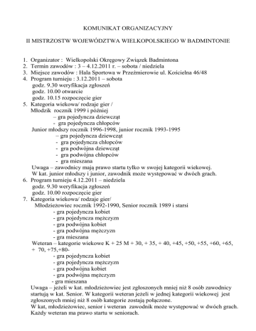 KOMUNIKAT ORGANIZACYJNY II MISTRZOSTW WOJEWÓDZTWA WIELKOPOLSKIEGO W BADMINTONIE 1. 2. 3. 4. Organizator : Wielkopolski Okręgowy Związek Badmintona Termin zawodów : 3 – 4.12.2011 r. – sobota / niedziela Miejsce zawodów : Hala Sportowa w Przeźmierowie ul. Kościelna 46/48 Program turnieju : 3.12.2011 – sobota godz. 9.30 weryfikacja zgłoszeń godz. 10.00 otwarcie godz. 10.15 rozpoczęcie gier 5. Kategoria wiekowa/ rodzaje gier / Młodzik rocznik 1999 i później – gra pojedyncza dziewcząt - gra pojedyncza chłopców Junior młodszy rocznik 1996-1998, junior rocznik 1993-1995 – gra pojedyncza dziewcząt - gra pojedyncza chłopców - gra podwójna dziewcząt - gra podwójna chłopców - gra mieszana Uwaga – zawodnicy mają prawo startu tylko w swojej kategorii wiekowej. W kat. junior młodszy i junior, zawodnik może występować w dwóch grach. 6. Program turnieju 4.12.2011 – niedziela godz. 9.30 weryfikacja zgłoszeń godz. 10.00 rozpoczęcie gier 7. Kategoria wiekowa/ rodzaje gier/ Młodzieżowiec rocznik 1992-1990, Senior rocznik 1989 i starsi - gra pojedyncza kobiet - gra pojedyncza mężczyzn - gra podwójna kobiet - gra podwójna mężczyzn - gra mieszana Weteran – kategorie wiekowe K + 25 M + 30, + 35, + 40, +45, +50, +55, +60, +65, + 70, +75,+80- gra pojedyncza kobiet - gra pojedyncza mężczyzn - gra podwójna kobiet - gra podwójna mężczyzn - gra mieszana Uwaga – jeżeli w kat. młodzieżowiec jest zgłoszonych mniej niż 8 osób zawodnicy startują w kat. Senior. W kategorii weteran jeżeli w jednej kategorii wiekowej jest zgłoszonych mniej niż 8 osób kategorie zostają połączone. W kat, młodzieżowiec, senior i weteran zawodnik może występować w dwóch grach. Każdy weteran ma prawo startu w seniorach. 8. System rozgrywek : Młodzik – PUCHAROWY DO DWÓCH PRZEGRANYCH. Pozostałe kategorie – PUCHAROWY Przy losowaniu gier brana będzie pod uwagę pozycja zawodnika na liście PZBad. 9. Zgłoszenie do mistrzostw do dnia 1.12.2011 na adres [email protected] 10.Wyżywienie: Bufet na hali. Rezerwacja obiadów pod numerem 605477538 11.Sprawy organizacyjne : Zbigniew Gorzelany 600882622, Jacek Duszczyk 508104590 12.Warunki uczestnictwa : a. posiadanie sprzętu sportowego do badmintona b. opłacenie wpisowego w wysokości 5,- zł – młodzik, 10,- zł pozostałe kategorie wiekowe 13.Uczestnicy przyjeżdżają na własny koszt. Cel turnieju : Podniesienie poziomu sportowego w badmintonie w Województwie Wielkopolskim – Wyłonienie Mistrzów Województwa Wielkopolskiego w badmintonie. 14. Nagrody : Dyplomy i medale 15.Postanowienia końcowe : Turniej zostanie przeprowadzony wg. Przepisów PZBad. Wszystkie gry do dwóch wygranych setów do 21 punktów. W sprawach nie objętych komunikatem decyduje sędzia główny w porozumieniu z organizatorem . Organizator zapewnia lotki syntetyczne Yonex. 16.Sędzia zawodów : Krzysztof Duszczyk Prezes WZBad Zbigniew Gorzelanny