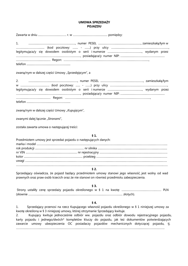 UMOWA SPRZEDAŻY POJAZDU Zawarta w dniu ………………………………. r. w ……………………………………… pomiędzy: 1. ……………………………………………………., numer PESEL ……………………………………………….., zamieszkałą/łym w ………………………………. (kod pocztowy: ……. - …….) przy ulicy …………………………………………………………………, legitymująca/y się dowodem osobistym o serii i numerze ………….………………………….., wydanym przez …………………………………………………………………………, posiadająca/y numer NIP: …………………………….…………………… ……………………………………… Regon: …………………………………………………………………………………………………, telefon ………………………………………………… zwaną/nym w dalszej części Umowy „Sprzedającym”, a 2. ………………………………………………………., numer PESEL ……………………………………………….., zamieszkałą/łym w …………………………….…. (kod pocztowy: …... - …….) przy ulicy …………………………………………………………………, legitymująca/y się dowodem osobistym o serii i numerze ………….………………………….., wydanym przez …………………………………………………………………………, posiadająca/y numer NIP: …………………………….…………………… ……………………………………… Regon: …………………………………………………………………………………………………, telefon ………………………………………………… zwaną/nym w dalszej części Umowy „Kupującym”, zwanymi dalej łącznie „Stronami”, została zawarta umowa o następującej treści: § 1. Przedmiotem umowy jest sprzedaż pojazdu o następujących danych: marka i model …………………………………………………………..…………………………………………………………………………………………. rok produkcji ……………….…………………………………..…. nr silnika ………………………………………………………………………………. nr VIN …………………………………………………………. nr rejestracyjny ……………………………………………………………………………. kolor …………………………………………………………………. przebieg ………………………………………………………………………………… uwagi …………………………………………………………………………………………………………………………………………………………………… ………………………………………………………………………………………………………………………………………………………………………………. § 2. Sprzedający oświadcza, że pojazd będący przedmiotem umowy stanowi jego własność, jest wolny od wad prawnych oraz praw osób trzecich oraz że nie stanowi on również przedmiotu zabezpieczenia. § 3. Strony ustaliły cenę sprzedaży pojazdu określonego w § 1 na kwotę: …………………………………….……… PLN (słownie …………………………………………………………………………………………………………… złotych). § 4. 1. Sprzedający przenosi na rzecz Kupującego własność pojazdu określonego w § 1 niniejszej umowy za kwotę określoną w § 3 niniejszej umowy, której otrzymanie Sprzedający kwituje. 2. Kupujący kwituje jednocześnie odbiór ww. pojazdu oraz odbiór dowodu rejestracyjnego pojazdu, karty pojazdu i jednego/dwóch* kompletów kluczy do pojazdu, jak też dokumentów potwierdzających zawarcie umowy ubezpieczenia OC posiadaczy pojazdów mechanicznych dotyczącej pojazdu, tj. ………………………………………………………………………………………………………………………………………………………………………….. § 5. Kupujący oświadcza, że stan techniczny pojazdu jest mu znany i że nie wnosi do niego zastrzeżeń. § 6. Strony ustaliły, że wszelkiego rodzaju koszty transakcji wynikające z realizacji niniejszej umowy oraz koszty opłaty skarbowej obciążają Kupującego. § 7. W sprawach nie uregulowanych w niniejszej umowie zastosowanie mają obowiązujące w tym zakresie przepisy kodeksu cywilnego. § 8. Niniejszą umowę sporządzono w dwóch jednobrzmiących egzemplarzach, po jednym dla każdej ze Stron. ………………………………………… KUPUJĄCY * NIEPOTRZEBNE SKREŚLIĆ ………………………………………… SPRZEDAJĄCY