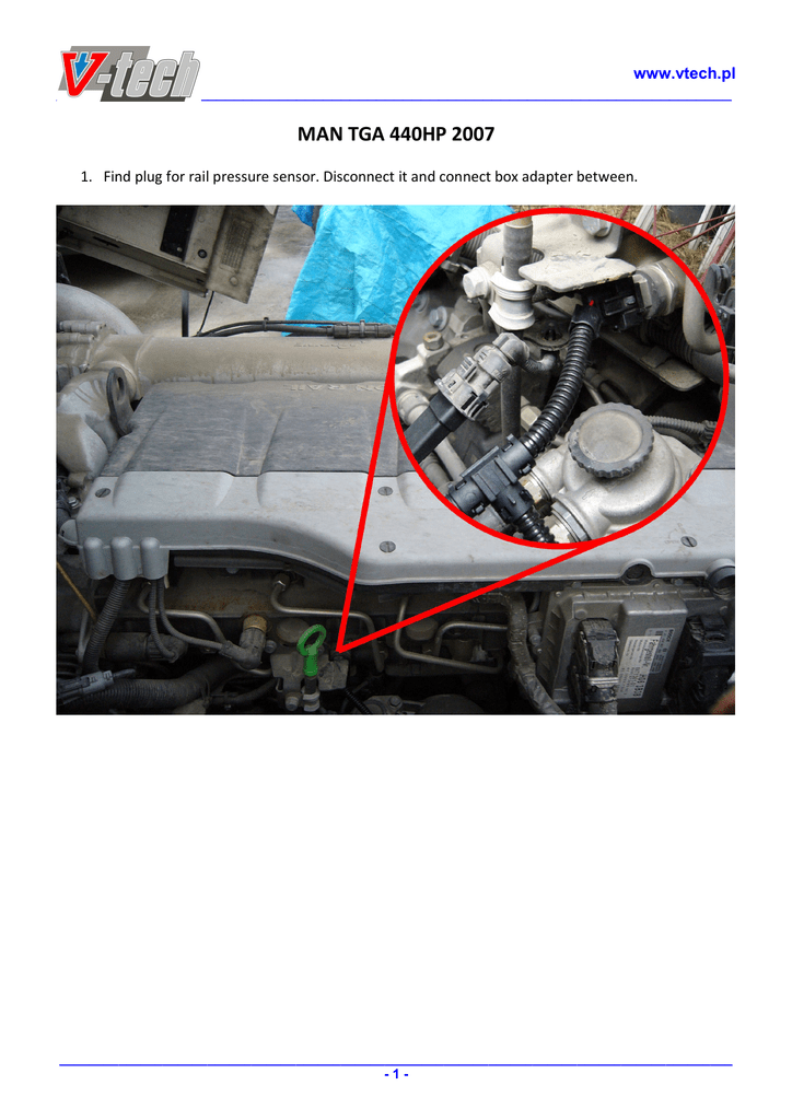 www.vtech.pl ____________________________________________________________________________ MAN TGA 440HP 2007 1. Find plug for rail pressure sensor. Disconnect it and connect box adapter between. ___________________________________________________________________________________________ -1-