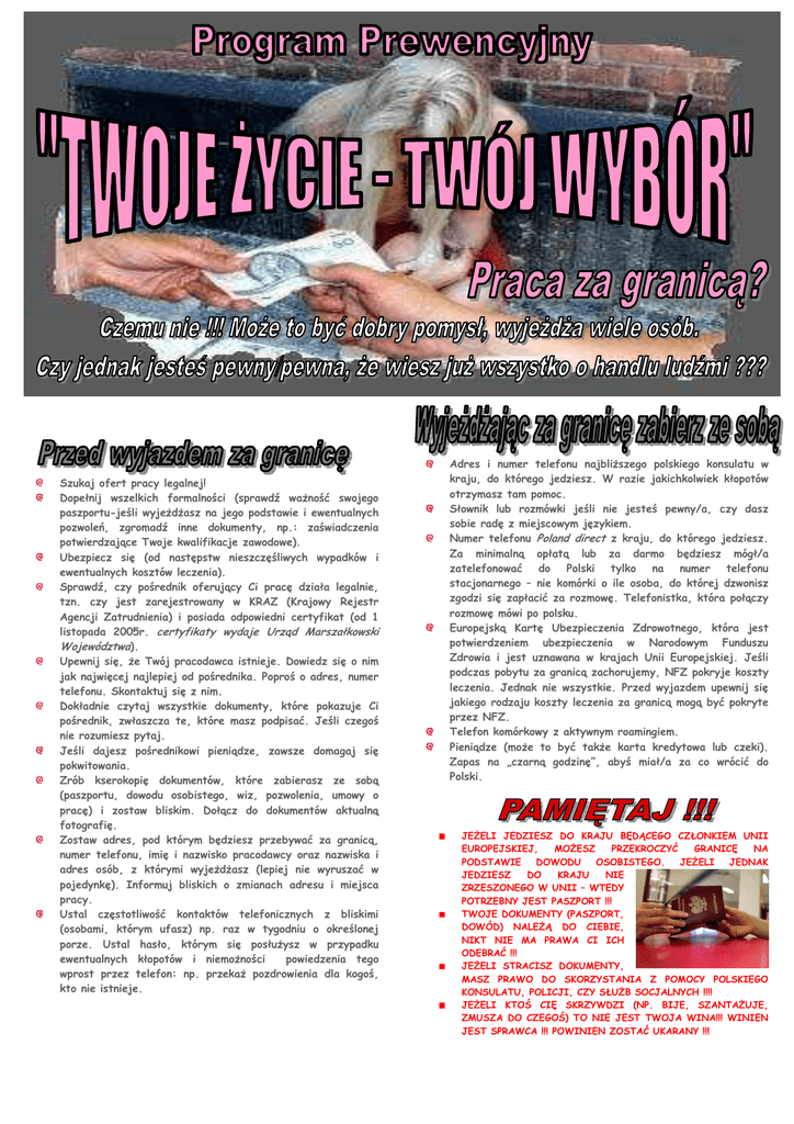 Szukaj ofert pracy legalnej! Dopełnij wszelkich formalności (sprawdź waŜność swojego paszportu-jeśli wyjeŜdŜasz na jego podstawie i ewentualnych pozwoleń, zgromadź inne dokumenty, np.: zaświadczenia potwierdzające Twoje kwalifikacje zawodowe). Ubezpiecz się (od następstw nieszczęśliwych wypadków i ewentualnych kosztów leczenia). Sprawdź, czy pośrednik oferujący Ci pracę działa legalnie, tzn. czy jest zarejestrowany w KRAZ (Krajowy Rejestr Agencji Zatrudnienia) i posiada odpowiedni certyfikat (od 1 listopada 2005r. certyfikaty wydaje Urząd Marszałkowski Województwa). Upewnij się, Ŝe Twój pracodawca istnieje. Dowiedz się o nim jak najwięcej najlepiej od pośrednika. Poproś o adres, numer telefonu. Skontaktuj się z nim. Dokładnie czytaj wszystkie dokumenty, które pokazuje Ci pośrednik, zwłaszcza te, które masz podpisać. Jeśli czegoś nie rozumiesz pytaj. Jeśli dajesz pośrednikowi pieniądze, zawsze domagaj się pokwitowania. Zrób kserokopię dokumentów, które zabierasz ze sobą (paszportu, dowodu osobistego, wiz, pozwolenia, umowy o pracę) i zostaw bliskim. Dołącz do dokumentów aktualną fotografię. Zostaw adres, pod którym będziesz przebywać za granicą, numer telefonu, imię i nazwisko pracodawcy oraz nazwiska i adres osób, z którymi wyjeŜdŜasz (lepiej nie wyruszać w pojedynkę). Informuj bliskich o zmianach adresu i miejsca pracy. Ustal częstotliwość kontaktów telefonicznych z bliskimi (osobami, którym ufasz) np. raz w tygodniu o określonej porze. Ustal hasło, którym się posłuŜysz w przypadku ewentualnych kłopotów i niemoŜności powiedzenia tego wprost przez telefon: np. przekaŜ pozdrowienia dla kogoś, kto nie istnieje. Adres i numer telefonu najbliŜszego polskiego konsulatu w kraju, do którego jedziesz. W razie jakichkolwiek kłopotów otrzymasz tam pomoc. Słownik lub rozmówki jeśli nie jesteś pewny/a, czy dasz sobie radę z miejscowym językiem. Numer telefonu Poland direct z kraju, do którego jedziesz. Za minimalną opłatą lub za darmo będziesz mógł/a zatelefonować do Polski tylko na numer telefonu stacjonarnego – nie komórki o ile osoba, do której dzwonisz zgodzi się zapłacić za rozmowę. Telefonistka, która połączy rozmowę mówi po polsku. Europejską Kartę Ubezpieczenia Zdrowotnego, która jest potwierdzeniem ubezpieczenia w Narodowym Funduszu Zdrowia i jest uznawana w krajach Unii Europejskiej. Jeśli podczas pobytu za granicą zachorujemy, NFZ pokryje koszty leczenia. Jednak nie wszystkie. Przed wyjazdem upewnij się jakiego rodzaju koszty leczenia za granicą mogą być pokryte przez NFZ. Telefon komórkowy z aktywnym roamingiem. Pieniądze (moŜe to być takŜe karta kredytowa lub czeki). Zapas na „czarną godzinę”, abyś miał/a za co wrócić do Polski. JEśELI JEDZIESZ DO KRAJU BĘDĄCEGO CZŁONKIEM UNII EUROPEJSKIEJ, MOśESZ PRZEKROCZYĆ GRANICĘ NA PODSTAWIE DOWODU OSOBISTEGO. JEśELI JEDNAK JEDZIESZ DO KRAJU NIE ZRZESZONEGO W UNII – WTEDY POTRZEBNY JEST PASZPORT !!! TWOJE DOKUMENTY (PASZPORT, DOWÓD) NALEśĄ DO CIEBIE, NIKT NIE MA PRAWA CI ICH ODEBRAĆ !!! JEśELI STRACISZ DOKUMENTY, MASZ PRAWO DO SKORZYSTANIA Z POMOCY POLSKIEGO KONSULATU, POLICJI, CZY SŁUśB SOCJALNYCH !!!! JEśELI KTOŚ CIĘ SKRZYWDZI (NP. BIJE, SZANTAśUJE, ZMUSZA DO CZEGOŚ) TO NIE JEST TWOJA WINA!!! WINIEN JEST SPRAWCA !!! POWINIEN ZOSTAĆ UKARANY !!! Masz prawo do wyboru miejsca zamieszkania i swobodnego poruszania się po terytorium kraju w którym przebywasz. Nikt więc nie ma prawa więzić Cię, przetrzymywać ani zmuszać do czegokolwiek, takŜe do pracy !!! Jeśli spotkało Cię coś złego np.: stałeś/aś się ofiarą przestępstwa, lub sam/a je popełniłeś/aś i zostałeś/aś zatrzymany/a przez policję, pamiętaj, masz prawo do obrony swoich praw. Twoje prawa za granicą mają obowiązek chronić polski konsul i policja. MoŜesz zgłosić do policji przestępstwo, którego ofiarą padłeś/aś i wskazać winnych jego popełnienia. Jeśli trafiłeś/aś do policji – czy to jako poszkodowany/a czy jako podejrzany/a, masz prawo do tłumaczenia – domagaj się tego. Jeśli jesteś podejrzany/a o dokonanie przestępstwa masz prawo do adwokata. Na Twoją prośbę policjant powiadomi o Twojej sytuacji polski konsulat. 1) Fundacja Przeciwko Handlowi Ludźmi i Niewolnictwu "La Strada” Skrytka pocztowa 5 00-956 Warszawa 10 e-mail: [email protected] Wsparcie obejmuje: interwencję kryzysową i moŜliwość skorzystania ze schroniska dla ofiar, poradnictwo prawne, towarzyszenie w czynnościach prawnych (przedstawiciel społeczny w postępowaniu karnym), pomoc socjalną, lekarską, psychologiczną, programy reintegracyjne pozwalające kobietom-ofiarom na kontynuowanie nauki, zdobycie nowych umiejętności i powrót na rynek pracy. Fundacja "La Strada" współpracuje z organizacjami partnerskimi w ramach sieci „Association La Strada International” (działa na terenie Białorusi, Bośni i Hercegowiny, Bułgarii, Holandii, Macedonii, Mołdawii, Republiki Czeskiej i Ukrainy oraz Polski) w zakresie wymiany najlepszych praktyk oraz współpracy przy konkretnych przypadkach powrotu i reintegracji ofiar handlu kobietami. Telefon zaufania: 022 268 99 99 (polsko i rosyjskojęzyczny). 2) Centrum Pomocy Prawnej im. Haliny Nieć ul. Sobieskiego 7/3 31-136 Kraków tel.: 012 633 72 23 e-mail: [email protected] 3) Fundacja Dzieci Niczyje ZA GRANICĄ: KaŜdą chwilę nieuwagi swych oprawców wykorzystaj na szukanie pomocy w: www.msz.gov.pl oraz ul. Walecznych 59 03-926 Warszawa tel.: 022 616 16 69 e-mail: [email protected] e-mail: [email protected] 4) Helsińska Fundacja Praw Człowieka ul. Zgoda 11 00-018 Warszawa tel.: 022 828 10 08 e-mail: [email protected] 5) Fundacja ITAKA Centrum Poszukiwań Ludzi Zaginionych - TELEFON 112 NUMER ALARMOWY SŁUśB RATOWNICZYCH OBOWIĄZUJĄCY W CAŁEJ UNII EUROPEJSKIEJ a takŜe: placówkach słuŜby zdrowia Kościołach GDZIEKOLWIEK !!! PO POWROCIE DO KRAJU: zgł