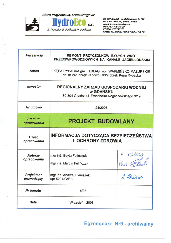 +\GUR(FR +\GUR(FR VFA. PieniąĪek E. FeliĔczak M. FeliĔczak 1 INFORMACJA DOTYCZĄCA BEZPIECZEēSTWA I OCHRONY ZDROWIA Nazwa obiektu budowlanego Remont przyczółków byłych wrót przeciwpowodziowych na Kanale JagielloĔskim Adres Obiektu budowlanego KĊpa Rybacka: gmina Elbląg województwo: warmiĔsko-mazurskie Inwestor Regionalny Zarząd Gospodarki Wodnej w GdaĔsku 80 – 804 GdaĔsk, ul. Rogaczewskiego 9/19 Projektanci Mgr inĪ. Edyta FeliĔczak Mgr inĪ. Marcin FeliĔczak Mgr inĪ. Andrzej PieniąĪek %LXUR3URMHNWRZR&RQVXOWLQJRZH Jednostka projektowa +\GUR(FR +\GUR(FR6& 6& A.PieniąĪek E.FeliĔczak M.FeliĔczak 80-287 GdaĔsk ul. Zabłockiego 2A/32 Tel/fax – 058-341-95-39 Email:[email protected] GdaĔsk, wrzesieĔ 2008r. __________________________________________________________________ „Remont przyczółków byłych wrót przeciwpowodziowych na Kanale JagielloĔskim” INFORMACJA DOTYCZACA BEZPIECZEēSTWA I OCHRONY ZDROWIA – umowa 28/2008 +\GUR(FR +\GUR(FR VFA. PieniąĪek 2 E. FeliĔczak M. FeliĔczak 1. Podstawa. Rozporządzenie Ministra Infrastruktury z dnia 23 czerwca 2003r. w sprawie informacji dotyczącej bezpieczeĔstwa i ochrony zdrowia oraz planu bezpieczeĔstwa i ochrony zdrowia (Dz. U. Nr 120, poz. 1126). 2. Zagospodarowanie terenu. A. Obiekty istniejące. A/ Konstrukcja murowa przyczółków stalowych przeciwpowodziowych wrót wspornych, B/ Konstrukcja mostowa w postaci Īelbetowej, Īebrowej płyty mostowej wspartej na przyczółkach konstrukcji wrót ( nie objĊta zakresem remontu) C/ Awanport górny i dolny wrót Obecne, istniejące uzbrojenie podziemne terenu stanowią: istniejący wodociąg w stalowej rurze ochronnej przechodzący wzdłuĪ konstrukcji mostu nad komorą wrót przeciwsztormowych, Most drogowy, stanowiący wspólny obiekt z konstrukcja przyczółków wrót, zlokalizowany jest na drodze powiatowej Kazimierzowo-KĊpa Rybacka. B. Obiekty projektowane. W ramach remontu wrót przeciwpowodziowych nie ma elementów nowoprojektowanych. 3. Zakres robót dla całego zamierzenia budowlanego oraz kolejnoĞü realizacji poszczególnych obiektów. Zakresem robót objĊto: roboty kafarowe przy wykonywaniu gródz tymczasowych w celu odwodnienia, wykonanie prac oczyszczenia dna w obrĊbie przyczółków i wnĊk zamkniĊü remontowych, __________________________________________________________________ „Remont przyczółków byłych wrót przeciwpowodziowych na Kanale JagielloĔskim” INFORMACJA DOTYCZACA BEZPIECZEēSTWA I OCHRONY ZDROWIA – umowa 28/2008 +\GUR(FR +\GUR(FR VFA. PieniąĪek E. FeliĔczak M. FeliĔczak 3 wykonanie prac naprawczych konstrukcji murowej i kamiennej w obrĊbie przyczółków i Ğcian budowli, remont konstrukcji stalowej wrót i elementów drewnianych uszczelnieĔ, remont kamiennych opasek brzegowych w awanporcie górnym i dolnym, prace transportowe na lądzie i na wodzie. Projektowana kolejnoĞü robót: wykonanie gródz tymczasowych, odwodnienie przestrzeni pomiĊdzy grodzami z komorą wrót, demontaĪ lub odchylenie skrzydeł stalowych wrót, remont konstrukcji stalowej wrót na placu budowy, wymiana drewnianych uszczelnieĔ bocznych i dennych, oczyszczenie dna miedzy przyczółkami z nagromadzonych namułów, oczyszczenie konstrukcji Ğcian i skrzydeł poprzez skucie powierzchniowych warstw cegieł oraz zmycie powierzchni agregatami wysokociĞnieniowymi, wykonanie remontu konstrukcji Ğcian i skrzydeł polegającego na uzupełnieniu ubytków cegieł i ciosów kamiennych oraz wykonaniu płaszcza Īelbetowego poniĪej linii niskiej wody, zabezpieczenia powierzchni murowej i betonowej Ğrodkami do zabezpieczeĔ antykorozyjnych, ułoĪenie bruku kamiennego na brzegach awanportu górnego. 4. Wskazanie elementów zagospodarowania działki lub terenu, które mogą stwarzaü zagroĪenie bezpieczeĔstwa i zdrowia ludzi. W obecnym stanie spoĞród elementów zagospodarowania terenu nie wystĊpuje zagroĪenie dla zdrowia ludzi. Zaleca siĊ przestrzeganie wszelkich Ğrodków ostroĪnoĞci wynikające ze stosownych przepisów BHP. Stąd teĪ wskazuje siĊ na koniecznoĞü przestrzegania __________________________________________________________________ „Remont przyczółków byłych wrót przeciwpowodziowych na Kanale JagielloĔskim” INFORMACJA DOTYCZACA BEZPIECZEēSTWA I OCHRONY ZDROWIA – umowa 28/2008 +\GUR(FR +\GUR(FR VFA. PieniąĪek E. FeliĔczak M. FeliĔczak 4 zasad BHP szczególnie przy robotach kafarowych i dĨwigowych oraz przy pracach na rusztowaniu ustawionym w trakcie remontu Ğcian pionowych konstrukcji murowanej. 5. Wskazanie dotyczące przewidywanych zagroĪeĔ wystĊpujących podczas realizacji robót budowlanych, okreĞlające skalĊ i rodzaje zagroĪeĔ oraz miejsce i czas ich wystąpienia. Potencjalne zagroĪenia na niniejszym obiekcie objĊtym dokumentacją projektową dla celów remontowych wiąĪą siĊ z zakresem i charakterem wykonywanych prac w trakcie prowadzonych robót. Dotyczy to w szczególnoĞci takich sytuacji, jak: roboty kafarowe wykonywane sprzĊtem pływającym, w czasie prac w zasiĊgu pracy dĨwigu przy robotach związanych z wbijaniem Ğcianek szczelnych gródz tymczasowych, demontaĪu i montaĪu stalowych konstrukcji wrót, w czasie prac w zasiĊgu pracy dĨwigu przy podawaniu materiałów naprawczych (cegły, ciosy kamienne, pojemniki z zaprawą) w miejsce ich wbudowania, zbliĪenia do istniejącej drogi, w trakcie prac związanych ze skuwaniem cegieł i cieciem materiałów stalowych; pracownicy zatrudnieni przy tych robotach powinni byü wyposaĪeni w Ğrodki ochrony osobistej, roboty spawalnicze (przy konstrukcjach stalowych, wykonywaniu Ğcianek szczelnych, zbrojeniu betonów, montaĪu wyposaĪenia), roboty antykorozyjne, malarskie, roboty murarskie, kamieniarskie i betoniarskie rĊczne. 6. Wskazanie sposobu prowadzenia instruktaĪu pracowników przed przystąpieniem do realizacji robót szczególnie niebezpiecznych. __________________________________________________________________ „