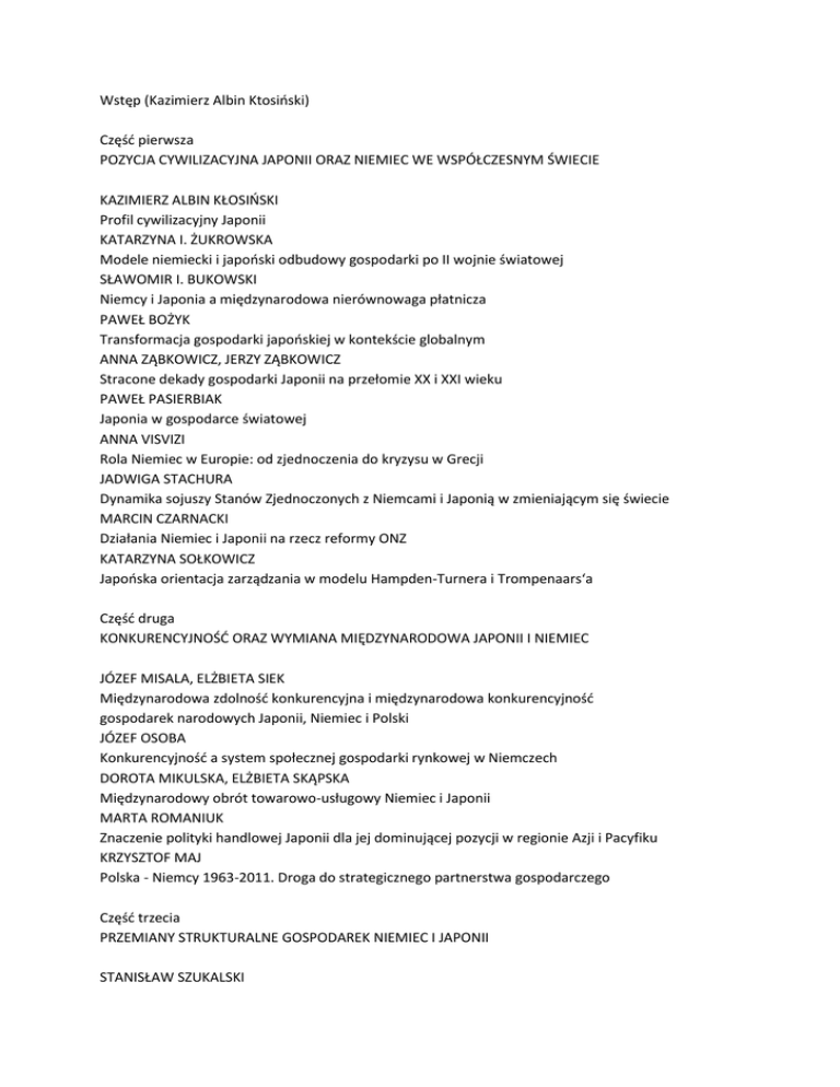Wstęp (Kazimierz Albin Ktosiński) Część pierwsza POZYCJA CYWILIZACYJNA JAPONII ORAZ NIEMIEC WE WSPÓŁCZESNYM ŚWIECIE KAZIMIERZ ALBIN KŁOSIŃSKI Profil cywilizacyjny Japonii KATARZYNA I. ŻUKROWSKA Modele niemiecki i japoński odbudowy gospodarki po II wojnie światowej SŁAWOMIR I. BUKOWSKI Niemcy i Japonia a międzynarodowa nierównowaga płatnicza PAWEŁ BOŻYK Transformacja gospodarki japońskiej w kontekście globalnym ANNA ZĄBKOWICZ, JERZY ZĄBKOWICZ Stracone dekady gospodarki Japonii na przełomie XX i XXI wieku PAWEŁ PASIERBIAK Japonia w gospodarce światowej ANNA VISVIZI Rola Niemiec w Europie: od zjednoczenia do kryzysu w Grecji JADWIGA STACHURA Dynamika sojuszy Stanów Zjednoczonych z Niemcami i Japonią w zmieniającym się świecie MARCIN CZARNACKI Działania Niemiec i Japonii na rzecz reformy ONZ KATARZYNA SOŁKOWICZ Japońska orientacja zarządzania w modelu Hampden-Turnera i Trompenaars‘a Część druga KONKURENCYJNOŚĆ ORAZ WYMIANA MIĘDZYNARODOWA JAPONII I NIEMIEC JÓZEF MISALA, ELŻBIETA SIEK Międzynarodowa zdolność konkurencyjna i międzynarodowa konkurencyjność gospodarek narodowych Japonii, Niemiec i Polski JÓZEF OSOBA Konkurencyjność a system społecznej gospodarki rynkowej w Niemczech DOROTA MIKULSKA, ELŻBIETA SKĄPSKA Międzynarodowy obrót towarowo-usługowy Niemiec i Japonii MARTA ROMANIUK Znaczenie polityki handlowej Japonii dla jej dominującej pozycji w regionie Azji i Pacyfiku KRZYSZTOF MAJ Polska - Niemcy 1963-2011. Droga do strategicznego partnerstwa gospodarczego Część trzecia PRZEMIANY STRUKTURALNE GOSPODAREK NIEMIEC I JAPONII STANISŁAW SZUKALSKI Strukturalne determinanty pozycji gospodarki niemieckiej w Unii Europejskiej FRANCISZEK TOMCZAK Uwarunkowania i siły rozwojowe gospodarki rolniczo-żywnościowej współczesnej Japonii STANISŁAW FLEJTERSKI, LILIANNA JODKOWSKA Niemiecki system bankowy - filar wzrostu i rozwoju gospodarki JOLANTA SPRYSAK Systemy bankowe w Niemczech i Japonii - specyfika i wyzwania wobec globalizacji BLANKA TUNDYS Problemy logistyczne współczesnych miast na przykładzie Niemiec i Japonii MARCIN KACZMARCZYK Adaptacyjna polityka migracyjna Niemiec i Japonii po II Wojnie Światowej Część czwarta Z HISTORII ROZWOJU I WSPÓŁPRACY SPOŁECZNO-GOSPODARCZEJ JAPONII ORAZ NIEMIEC ANTONI CHRZONSTOWSKI Niemcy, Japonia - konwergencja i dywergencja PIOTR RUBAJ Rozwój i wzrost gospodarczy Japonii po II Wojnie światowej PIOTR MISZTAL Oszczędności krajowe a wzrost gospodarczy w Niemczech i Japonii na przełomie XX i XXI wieku ZBIGNIEW KLIMIUK Polityka gospodarcza państw sojuszniczych na okupowanym terytorium Niemiec w latach 1945-1949 JACEK SKRZYPCZYK Rozwój gospodarczy Republiki Federalnej Niemiec oraz Niemieckiej Republiki Demokratycznej wiatach 1949 - 1969 na tle wrogich ideologii. Analiza porównawcza Noty o autorach
