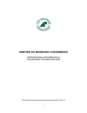 SWETER DO MUNDURU CODZINNEGO UPROSZCZONA DOKUMENTACJA TECHNICZNO-TECHNOLOGICZNA Dokumentacja techniczno-technologiczna jest własnością PGL LP 1 SPIS TREŚCI 1. Wstęp 2. Przedmiot dokumentacji 2.1. Opis ogólny/przeznaczenie 2.2. Normy i dokumenty związane 3. Rysunki modelowe 4. Wymagania techniczne 4.1. Ściegi 5. Zestawienie wymagań techniczno-użytkowych w odniesieniu do materiałów 6. Rysunki techniczne - wymiarowanie 7. Tabela wymiarów 8. Normy zużycia 9. Warunki odbioru - odbiór jakościowy - cechowanie etykiety wszywki, konserwacja 10. Oznakowanie - Wzór etykiety 11. Arkusz zmian 12. Próbki tkanin 13. Załączniki – certyfikaty, wyniki badań laboratoryjnych zastosowanych materiałów (potwierdzenie spełnienia wymagań techniczno-użytkowych) 2 1. WSTĘP. Zgodnie z Zarządzeniem Nr 54 Dyrektora Generalnego Lasów Państwowych z dnia 6.07.2012 r. ulegają zmianom rozwiązania materiałowe swetra do munduru codziennego leśnika. Forma i konstrukcja nie ulegają zmianie. W związku z powyższym korekcie poddana zostaje dokumentacja technicznotechnologiczna, która pozostaje w formie uproszczonej. 2. PRZEDMIOT DOKUMENTACJI. 2.1. OPIS OGÓLNY/PRZEZNACZENIE Sweter jest elementem munduru codziennego leśnika. Sweter, wykonany jest z przędzy w kolorze ciemnozielonym o następującym składzie: 50% włókna wełniane, 50% włókna poliakrylonitrylowe. Jest to sweter typu półgolf. Na barkach i rękawach naszyte są wzmocnienia (łaty) z tkaniny (skład surowcowy – 55% włókna poliestrowe, 45% włókna bawełniane) w kolorze ciemnozielonym. Z tego samego materiału naszyta jest kieszeń na lewym boku swetra. Kieszeń ma oddzielny tunel na długopis. Dół swetra oraz rękawy wykończone są ściągaczami, przy czym rękawy mają wywijane mankiety. Poszczególne elementy swetra zszyto stębnówką łańcuszkową. Plisę przyszyto za pomocą łączarki. Kieszeń oraz wzmocnienia (łaty) przeszyto stębnówką dwuigłową. 3 2.2. NORMY I DOKUMENTY ZWIĄZANE PN-EN 8388:2005 Sploty dzianin PN-EN ISO 3758:2006 Znaki informacyjne o sposobie konserwacji w postaci symboli graficznych PN-83/P-84501 Wyroby konfekcyjne. Szwy. PN-83/P-84502 Wyroby konfekcyjne. Ściegi. PN-P-84004:2003 Wyroby z dzianin. Zmiana wymiarów po praniu. PN-83/P-84506 Wyroby konfekcyjne. Badania odbiorcze. PN-83/P-84507 Wyroby konfekcyjne. Stopnie jakości. PN-88/P-84669 Odzież ochronna. Znakowanie przed pakowaniem PN-P-84509:1997 Wyroby odzieżowe. Pakowanie, przechowywanie i transport. 4 3. RYSUNKI MODELOWE – SWETER Przód Tył 5 4. WYMAGANIA TECHNICZNE 4.1 ŚCIEGI Ściegi stębnówką łańcuszkową (zszycie elementów swetra). Plisa przyszyta za pomocą łączarki. Kieszeń oraz łaty przyszyte stębnówką dwuigłową. 6 5. ZESTAWIENIE WYMAGAŃ TECHNICZNO-UŻYTKOWYCH W ODNIESIENIU DO MATERIAŁÓW 5.1. DZIANINA 1 2 3 3.1 3.2 4 L.p. 1 2 3 4 5 6 PODSTAWOWA CHARAKTERYSTYKA WYROBU Rodzaj wyrobu Dzianina (zasadnicza i ściągaczowa) Skład 50% włókna wełniane PN-72/P-04604 surowcowy 50% włókna poliakrylonitrylowe Splot Dzianina pół mediolański PN-EN ISO zasadnicza 8388:2005 Dzianina dwuprawy 2x2 ściągaczowa Kolor (dzianina wg ustalonego wzorca zasadnicza i ściągaczowa) WYMAGANIA DLA WYROBU (dzianina zasadnicza) Parametr Jednostka Wymaganie/metoda badania 2 Masa powierzchniowa g/m 620 ± 30 PN-P-04613:1997 /cm Liczba kolumienek wg ustalonego wzorca i rządków lub Masa liniowa przędzy tex/dtex wyprutej z dzianiny/ % Zmiana wymiarów po ≤ ±6 jednokrotnym praniu PN-EN ISO 5077:2011 i suszeniu Metody prania i suszenia PN-EN ISO kierunek wzdłużny 6330:2002+A1:2011, procedura prania i kierunek poprzeczny symulowane pranie ręczne (40ºC), metoda suszenia C – w stanie rozłożonym Skłonność do stopień ≥4 mechacenia PN-EN ISO 12945-1:2002, czas badania 1h i pillingu Wytrzymałość na N ≥ 350 przebicie PN-EN ISO 9073-5:2008 Odporność wybarwień na: światło sztuczne stopień ≥5 PN-EN ISO 105-B02:2006, metoda 2 pranie stopień ≥4 zmiana barwy PN-EN ISO 105-C06:2010, metoda A1S zabrudzenie bieli pot kwaśny i alkaliczny stopień zmiana barwy ≥4 zabrudzenie bieli ≥ 3-4 PN EN ISO 105-E04:2011 7 WYMAGANIA DLA WYROBU cd. (dzianina zasadnicza) L.p. Parametr Jednostka Wymaganie/metoda badania Odporność wybarwień na: tarcie suche stopień ≥4 zmiana barwy zabrudzenie bieli 6cd. tarcie mokre stopień ≥ 3-4 zmiana barwy PN EN ISO 105-X12:2005 zabrudzenie bieli na wodę stopień ≥4 zmiana barwy PN-EN ISO 105-E01:2010 zabrudzenie bieli L.p. 1 2 WYMAGANIA DLA WYROBU (dzianina ściągaczowa) Parametr Jednostka Wymaganie/metoda badania 620 ± 30 Masa powierzchniowa g/m2 PN-P-04613:1997 Liczba kolumienek /cm i rządków lub wg ustalonego wzorca Masa liniowa przędzy tex/dtex wyprutej z dzianiny/ 8 5.2. TKANINA NA WZMOCNIENIA PODSTAWOWA CHARAKTERYSTYKA WYROBU 1 Rodzaj wyrobu Tkanina na wzmocnienia Skład 55% włókna poliestrowe 2 PN-72/P-04604 surowcowy 45% włókna bawełniane 3 Splot płócienny PN-52/P-01701 4 Kolor wg ustalonego wzorca WYMAGANIA DLA WYROBU L.p. Parametr Jednostka Wymaganie/metoda badania Masa powierzchniowa g/m2 175 ± 10 1 PN-ISO 3801:1993 Siła maksymalna przy N rozciąganiu: osnowa ≥ 400 2 wątek ≥ 300 Metoda badania PN-EN ISO 139341:2002 Zmiana wymiarów po % ≤ ±3 jednokrotnym praniu PN-EN ISO 5077:2011 i suszeniu Metody prania i suszenia PN-EN ISO kierunek wzdłużny i 3 6330:2002+A1:2011, procedura prania kierunek poprzeczny symulowane pranie ręczne (40ºC), metoda suszenia C – w stanie rozłożonym Skłonność do stopień ≥4 mechacenia 4 PN-EN ISO 12945-1:2002, czas badania i pillingu 2h stopień Ocena wyglądu wyrobu ≥4 po domowym praniu i PN-EN ISO 15487:2010 suszeniu Metody prania i suszenia PN-EN ISO 5 6330:2002+A1:2011, procedura prania symulowane pranie ręczne (40ºC), metoda suszenia C – w stanie rozłożonym Odporność wybarwień na: 6 na światło sztuczne stopień pot kwaśny i alkaliczny zmiana barwy zabrudzenie bieli stopień t